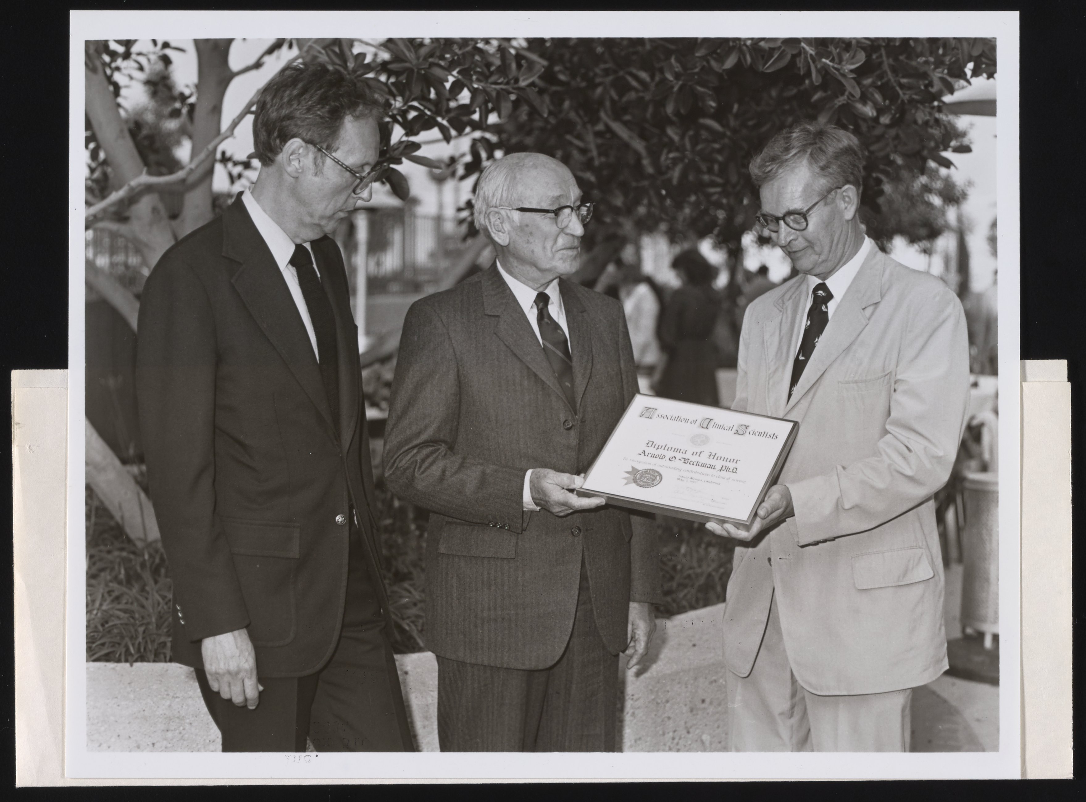 Arnold Beckman receiving the Association of Clinical Scientists' diploma of honor
