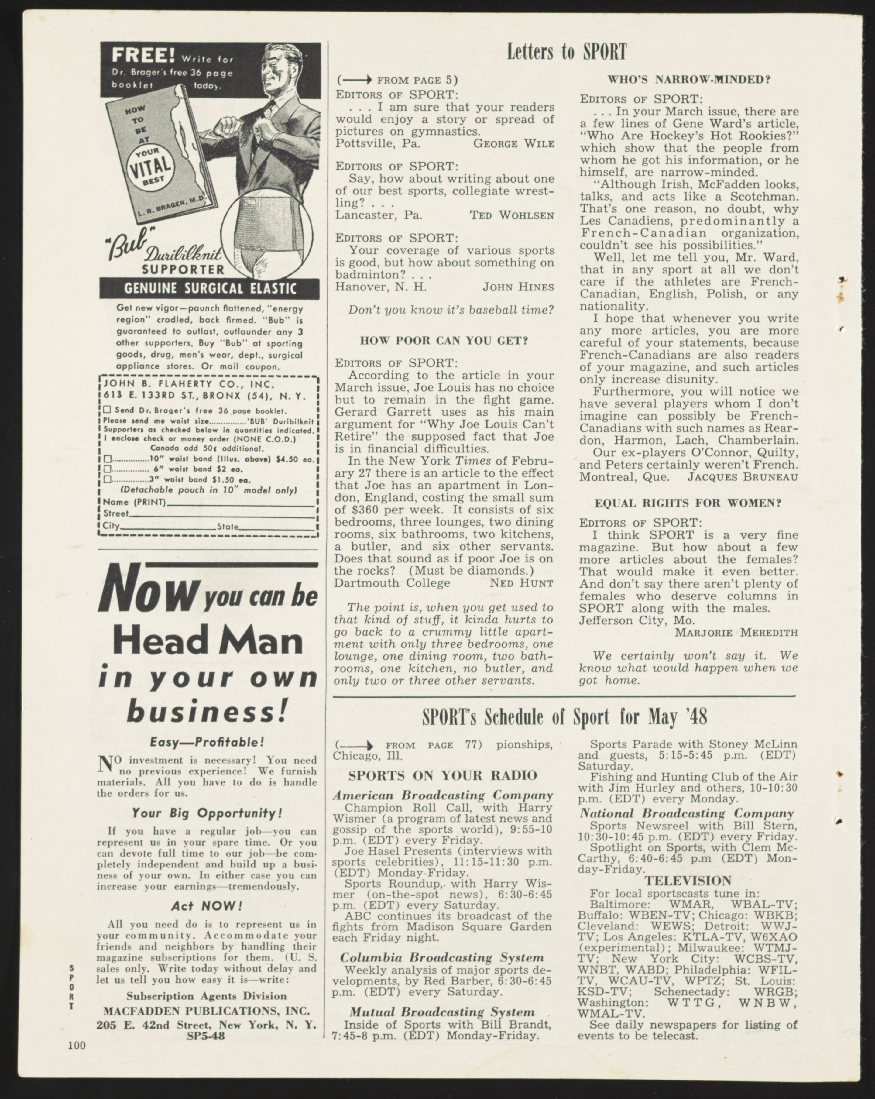 Advertisement by John B. Flaherty Co., Inc. in New York for the "Bub" Duribilknit supporter published in SPORT magazine. The "Bub" was a knitted athletic supporter made of surgical elastic. The supporter had a thick waistband and removable pouch.