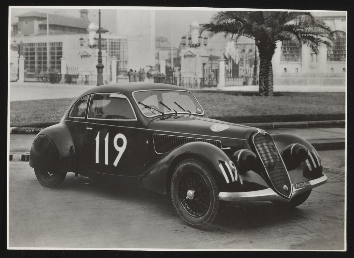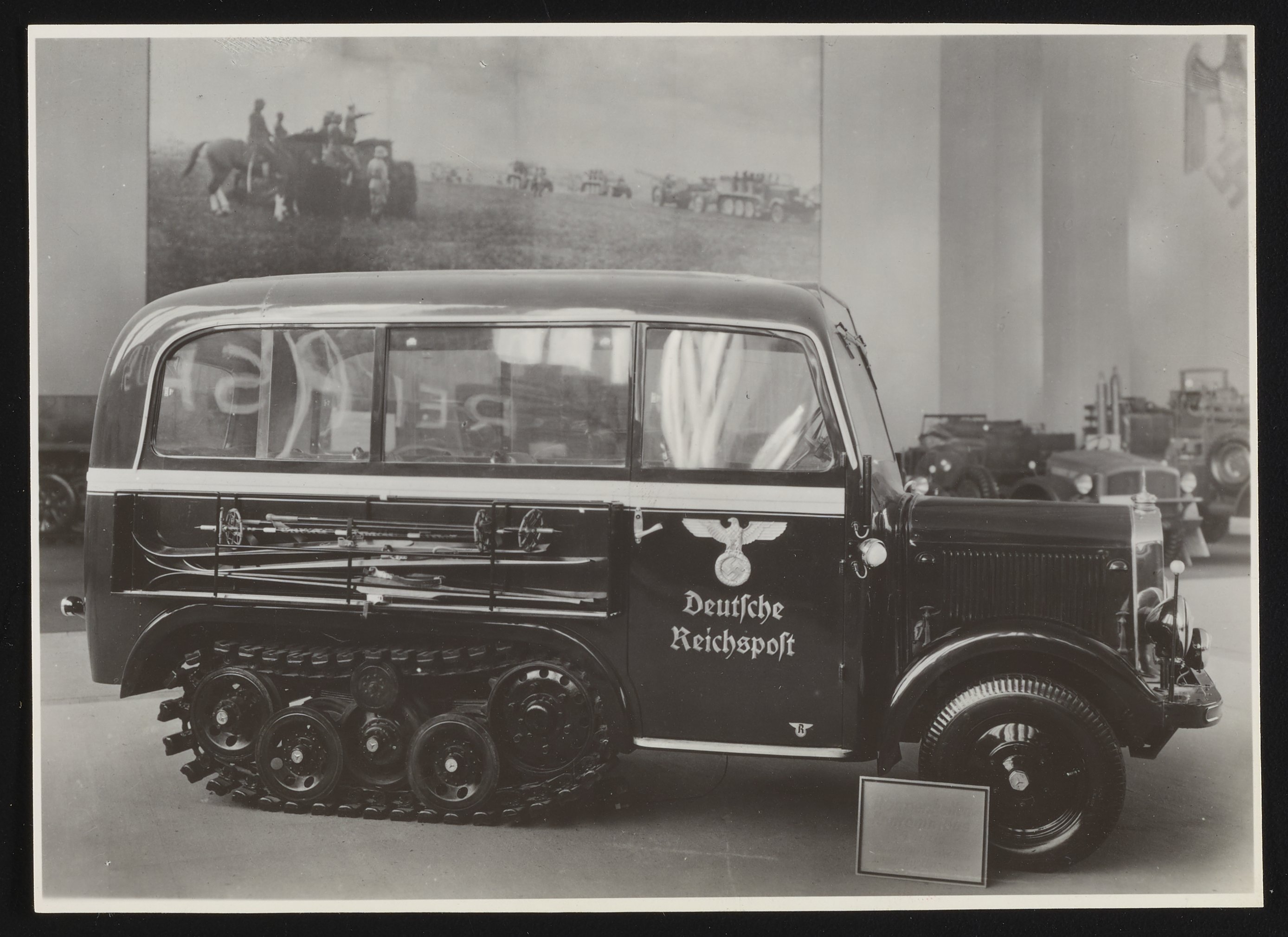 Small JPG1200 x 877px — 150 KBFull-sized JPG2785 x 2035px — 571 KBOriginal fileTIFF — 2785 x 2035px — 16.3 MBFour photographs depicting various German automobiles with Plexiglas windshields and window panels. Per notations accompanying the photographs, the automobiles are identified as follows: 1) Opel Super 6 Spezial-Stromlinienkarosserie; 2) Sportwagen Alfa-Romeo S.E. Benito Mussolini; 3) Stromilinien-Omnibus der Fahrzeugwerke Recklinghausen; 4) Raupenketten-Kraftomnibus Daimler-Benz. Notably, the automobile in the fourth photograph bears a swastika and insignia of the Third Reich.