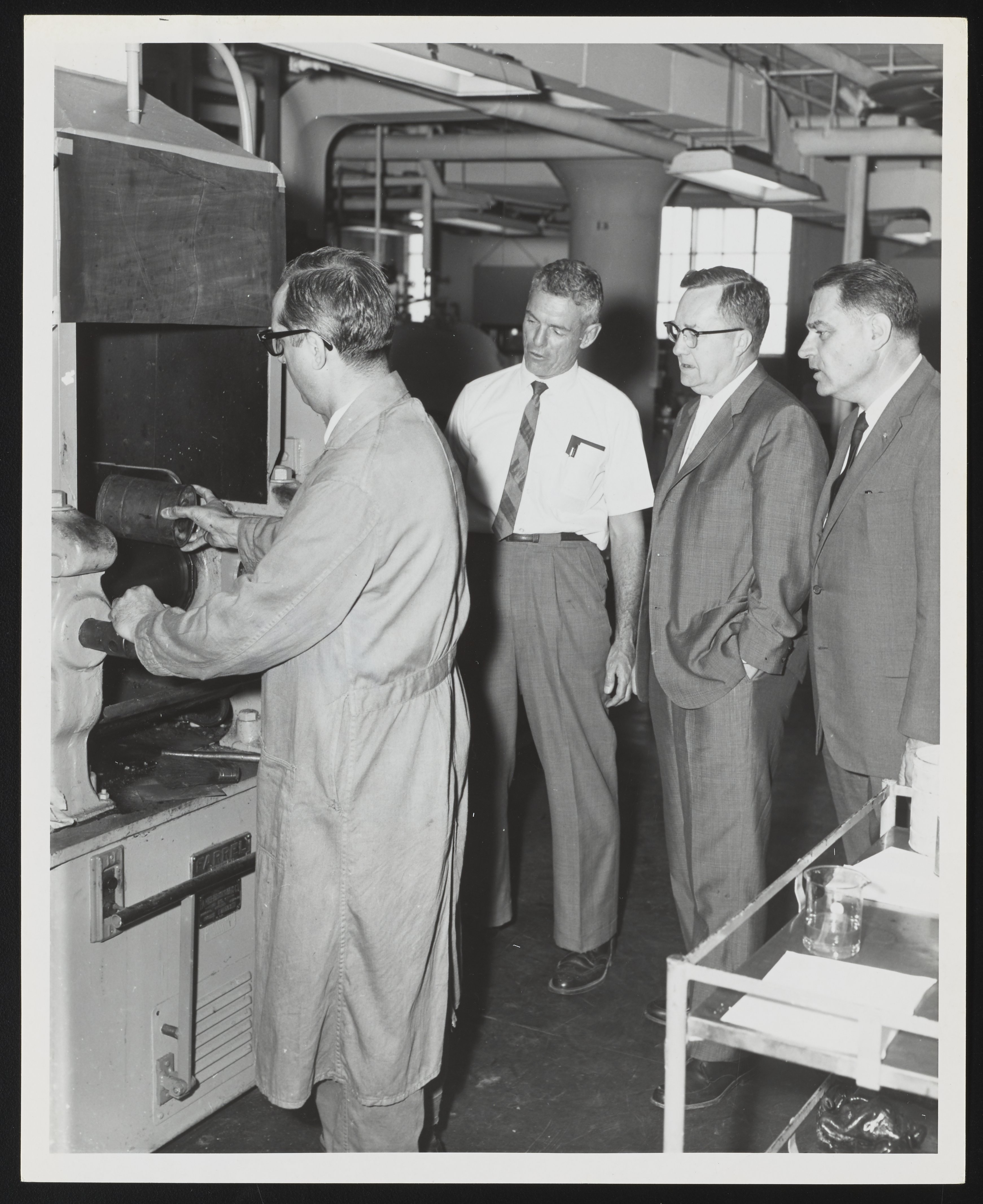 General view of the Rubber Laboratory at the National Air Engineering Center's Aeronautical Materials Laboratory. At left, Technician Armand Rindone operates an unidentified machine before a group of observers. The observers are identified as follows (left to right): Mr. C.P. Yarnall (Head, Elastomers Section); Dr. Earl T. Hayes (U.S. Defense Department, Research & Engineering); and Mr. C.A. Cassola (Superintendent, High Polymer Division).