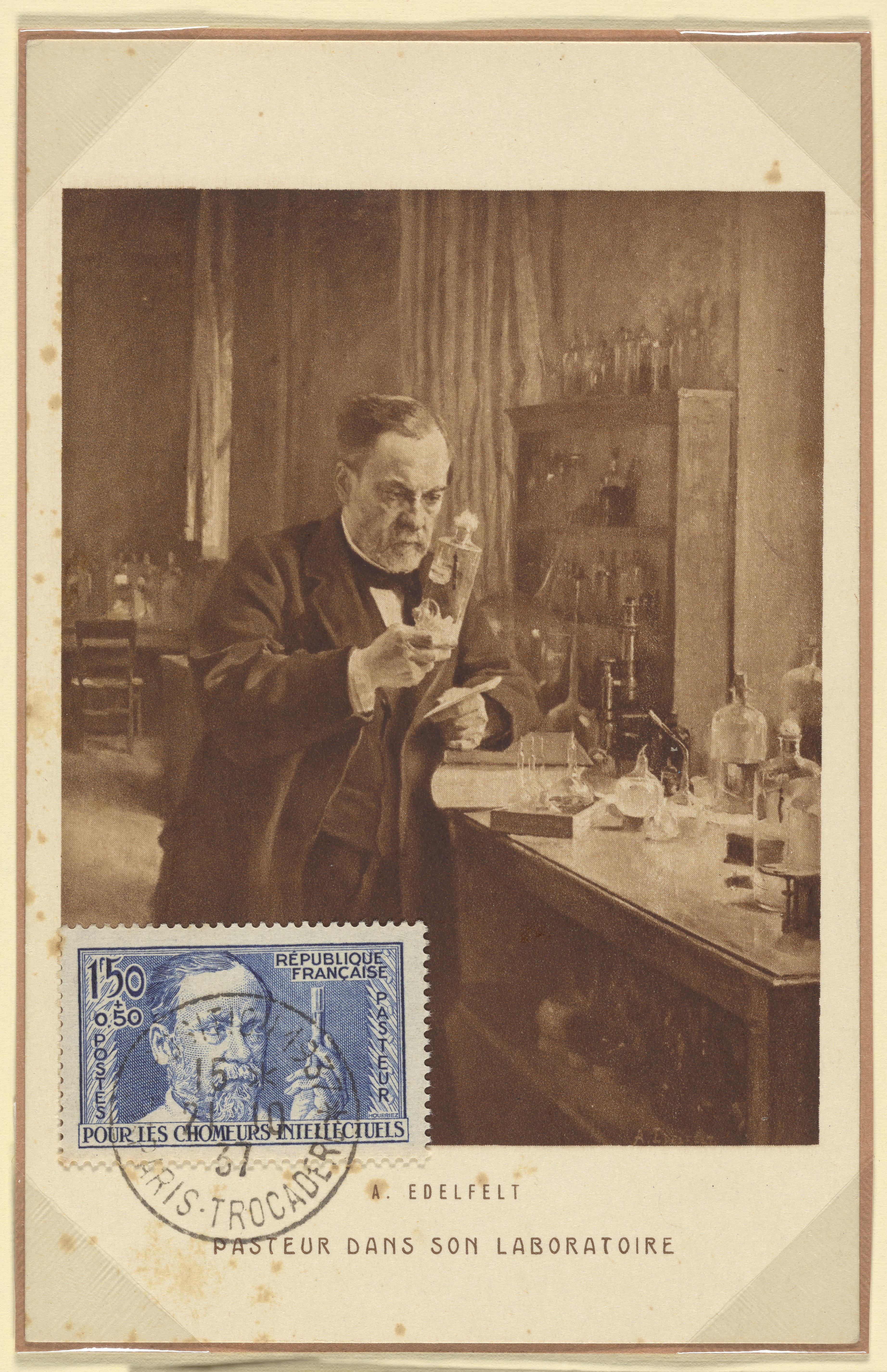 Postcard and French postage stamp commemorating Louis Pasteur
