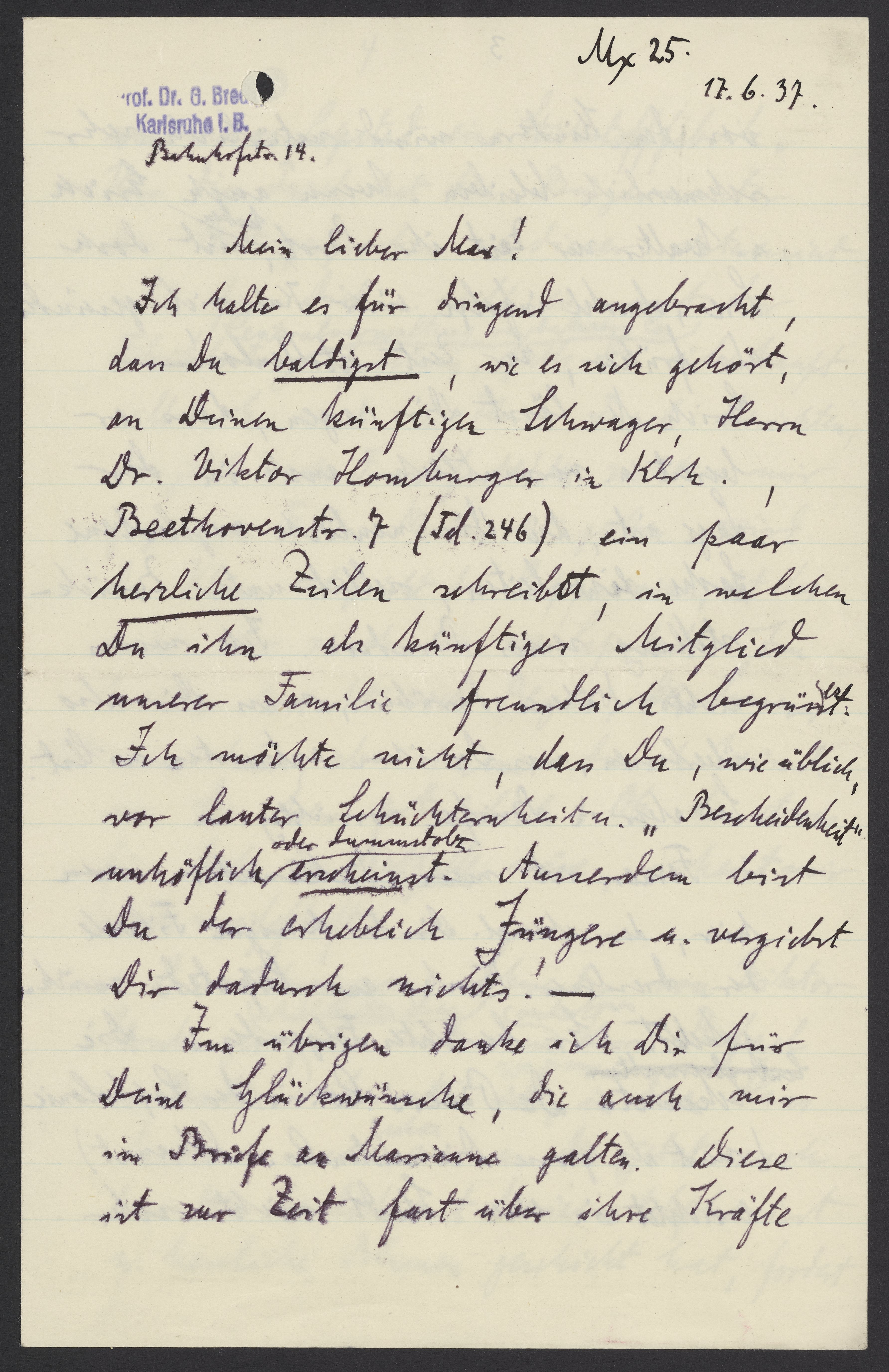 It is urgent that you contact your future brother-in-law, Dr. Viktor Homburger, who resides at Beethovenstrasse 7 in Karlsruhe and can be reached by telephone at #246. Please write a few warm and welcoming lines to greet him as a new member of our family. Don’t let your shyness or “modesty” come off as rude or prideful. Remember, you are considerably younger, so don’t make an excuse.