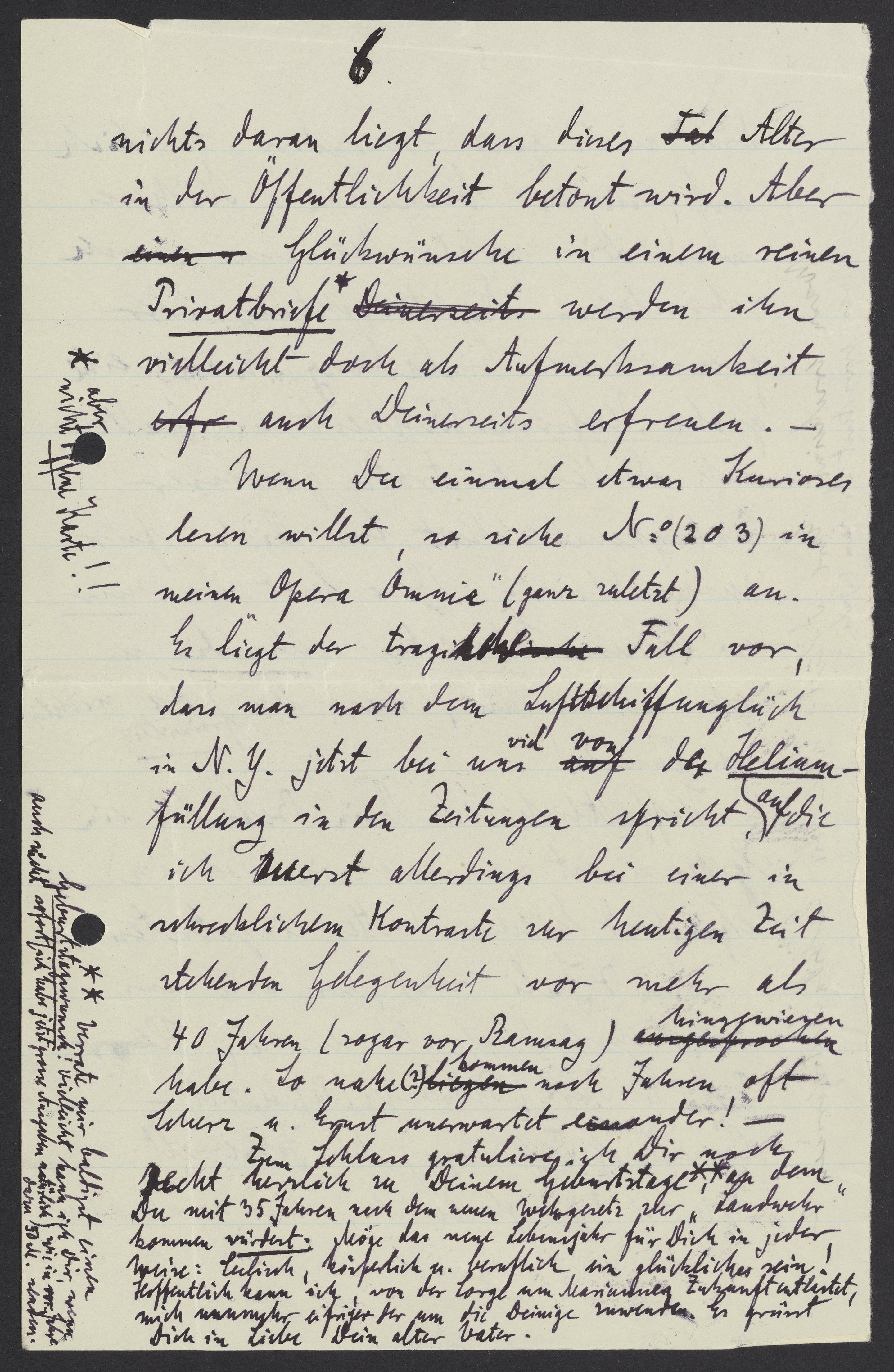 nichts daran liegt, dass dieses Alter in der Öffentlichkeit betont wird. Aber Glückwünsche in einem Privatbriefe werden ihn vielleicht auch Deinerseits erfreuen. Wenn Du einmal etwas Kurioses lesen willst, so siehe No (203) meinem „Opera Omnia“ (ganz zuletzt) an.