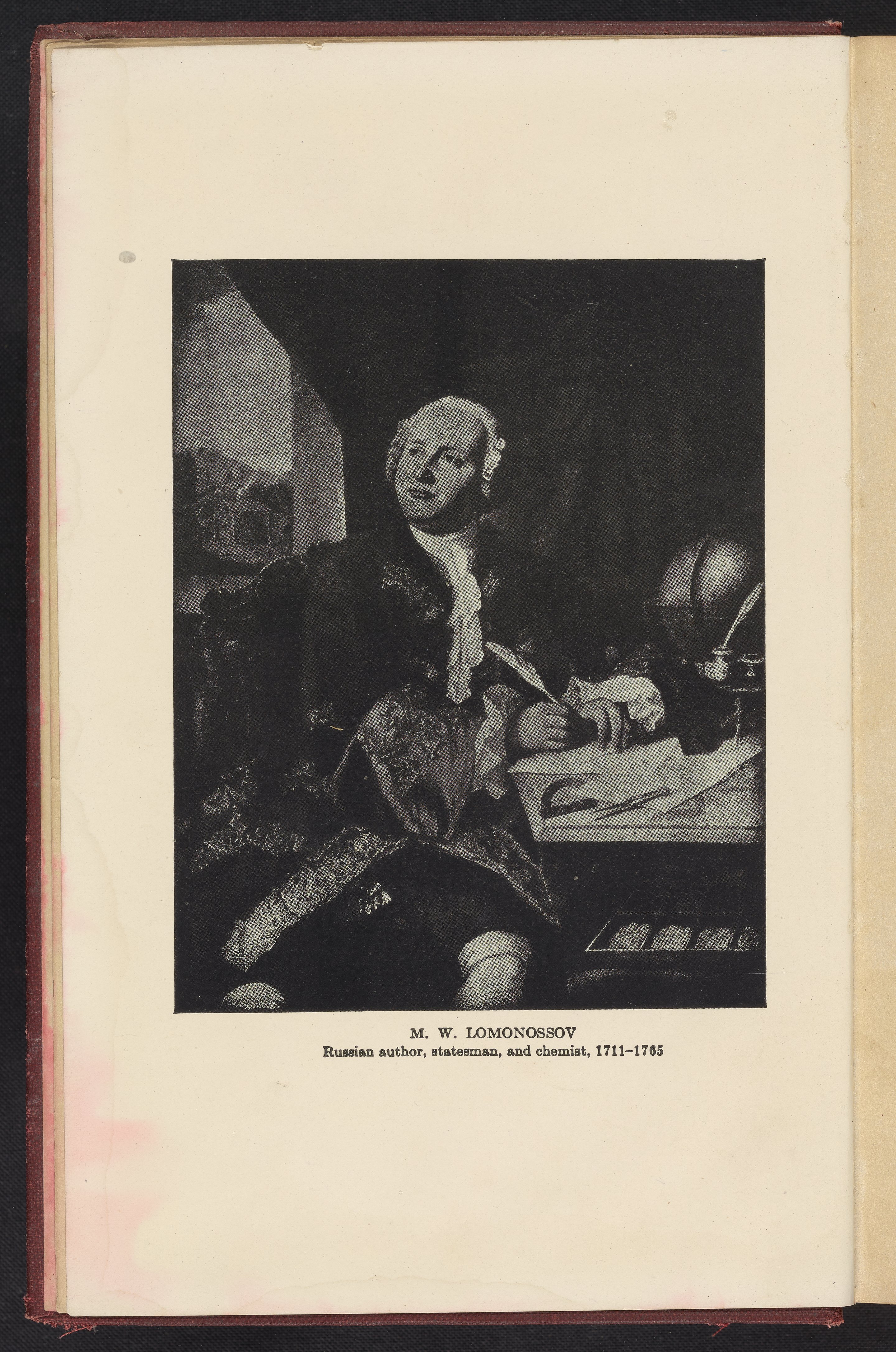 Smith, Alexander. “Frontispiece: Portrait of Mikhail Vasilʹevich Lomonosov.” Intermediate Text Book of Chemistry. New York, New York: The Century Company, 1787–1919. https://digital.sciencehistory.org/works/c8t3tnn.