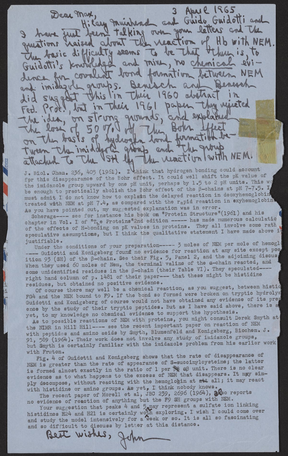 Letter from John T. Edsall to Max Perutz, April 3, 1965