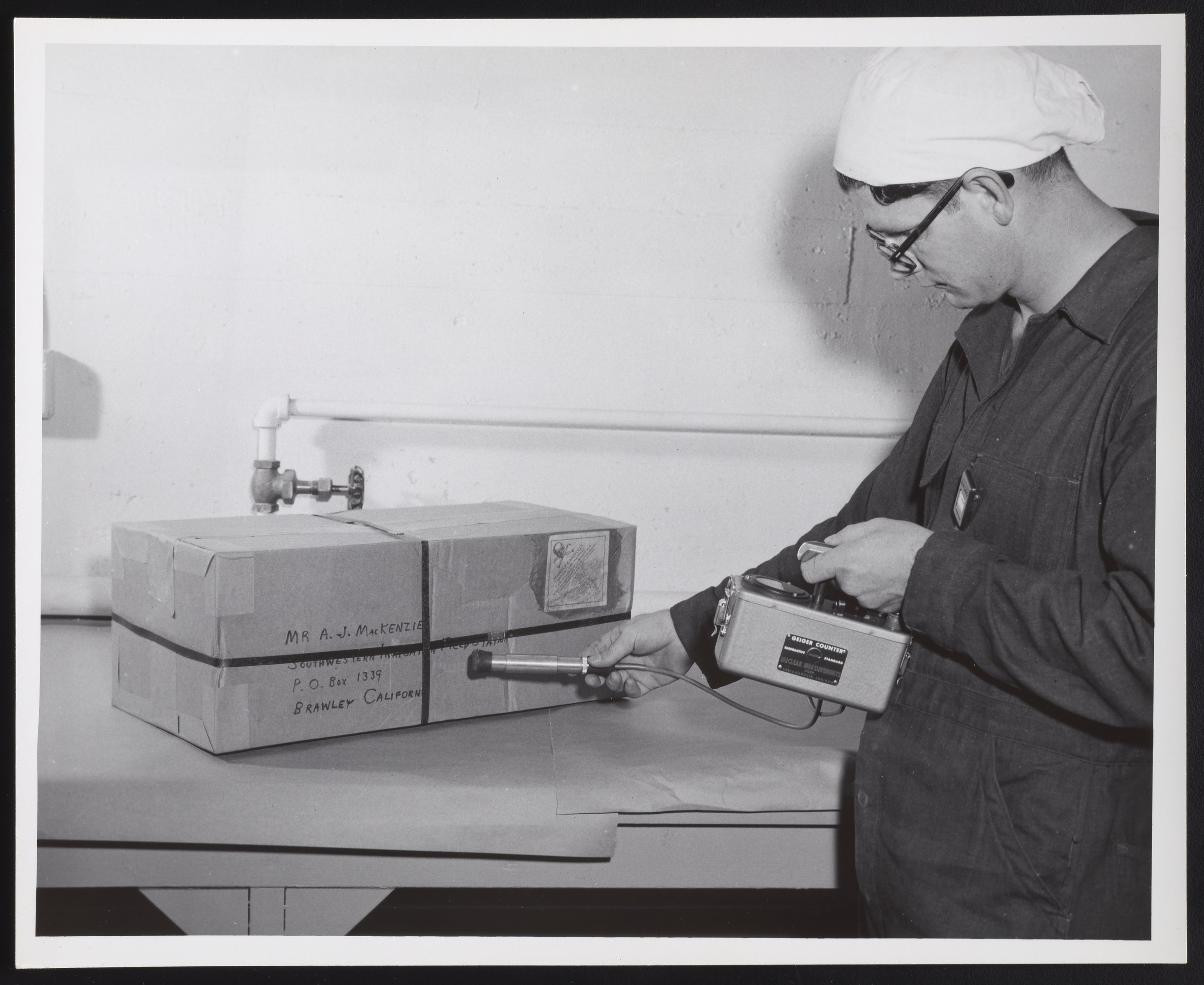 View of chemist William A. Jackson using a Gieger counter to examine a package at an unidentified U.S. Department of Agriculture facility. The U.S.D.A. commonly used radioactive material for a variety of research and testing, including the study of radioactive substances as fertilizer, as well as to model the impacts of radioactive material in soil and test the effectiveness of new insect control techniques or materials.