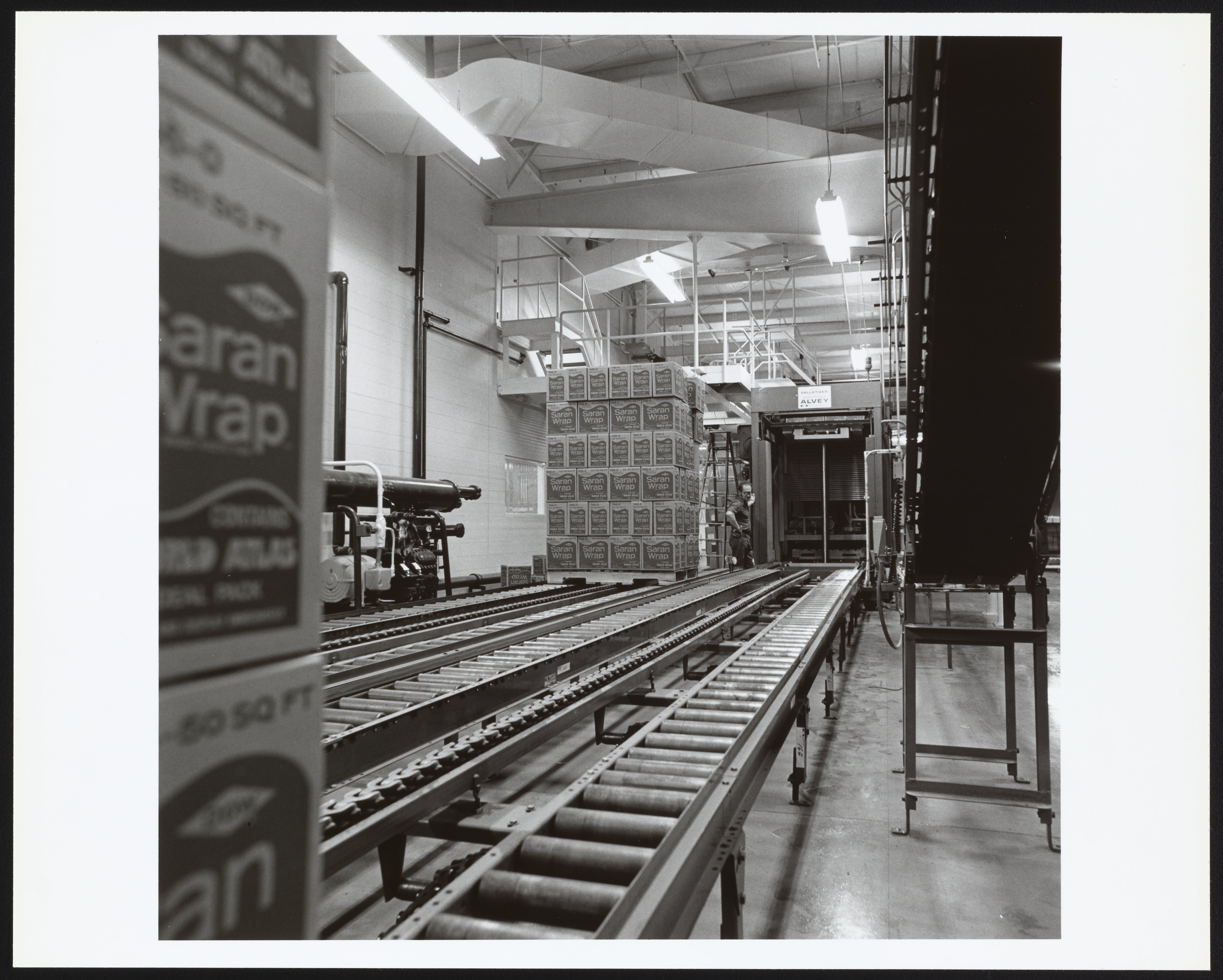 General view of a conveyor belt transporting cases of Saran Wrap at a Dow Chemical Company manufacturing facility in Midland, Michigan. Initially developed for the U.S. Army to wrap arms and equipment for transport during World War II, saran plastic was subsequently developed and marketed as Saran Wrap for household use.