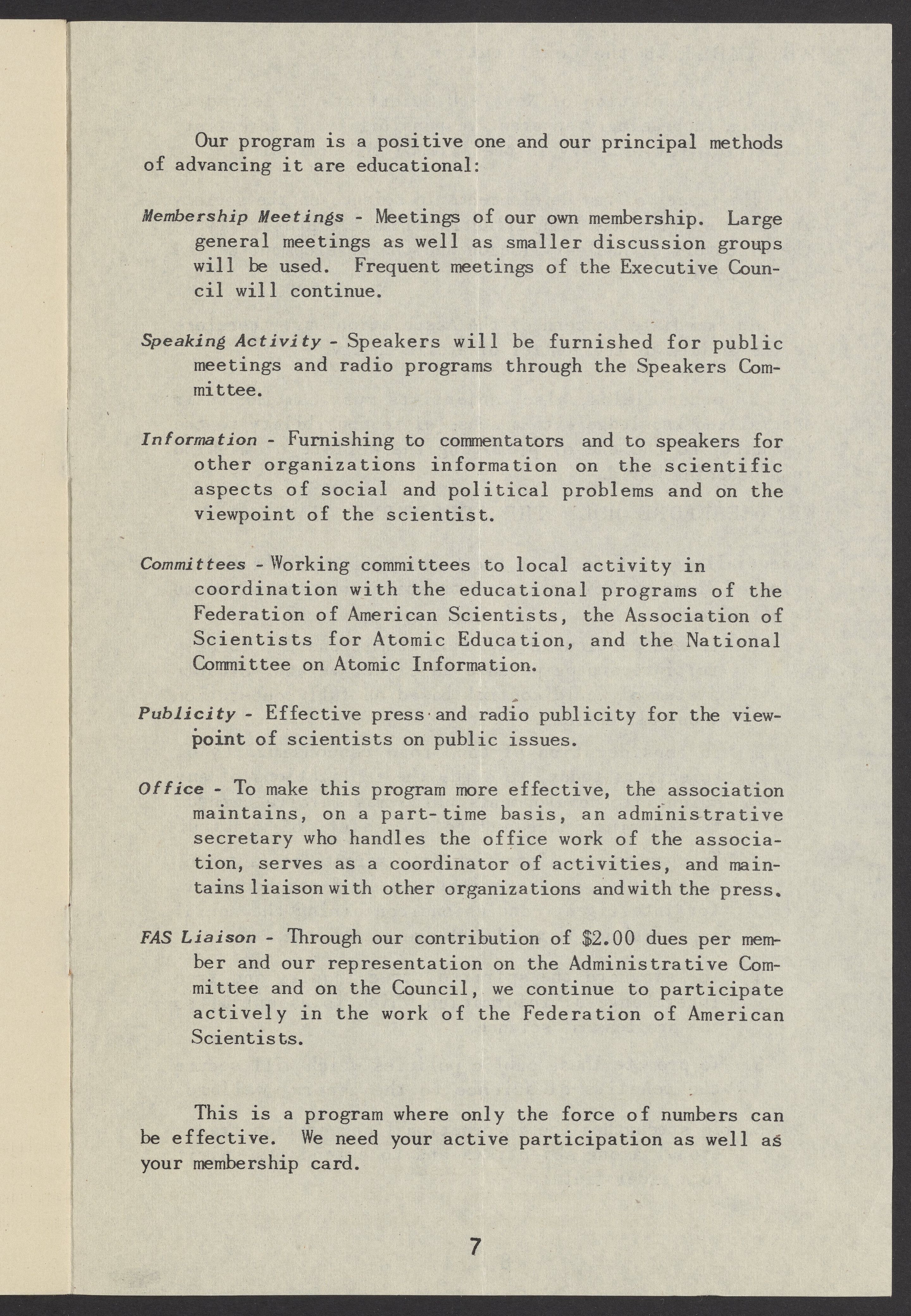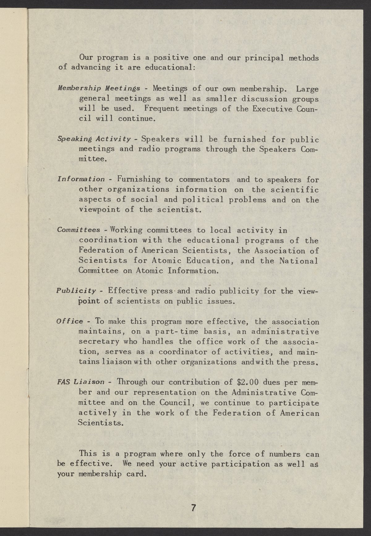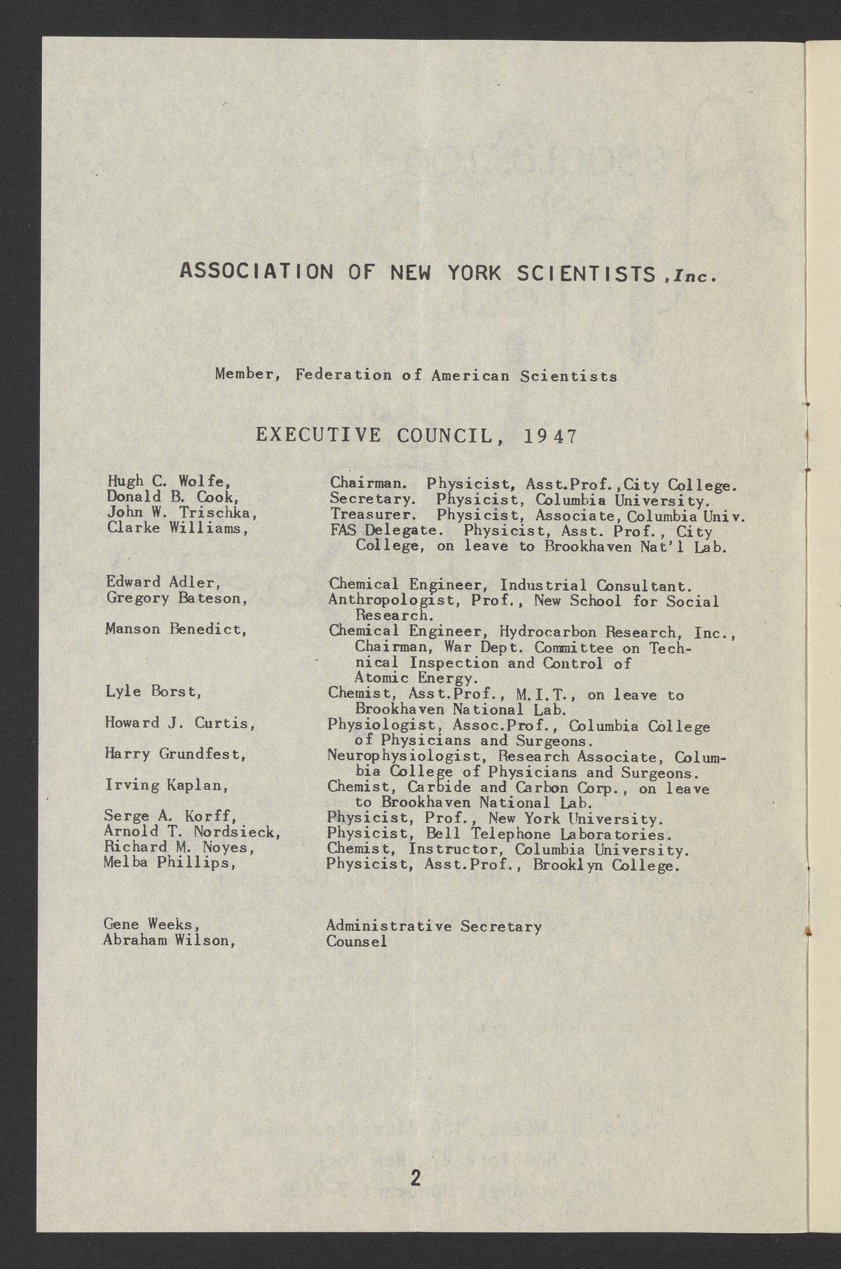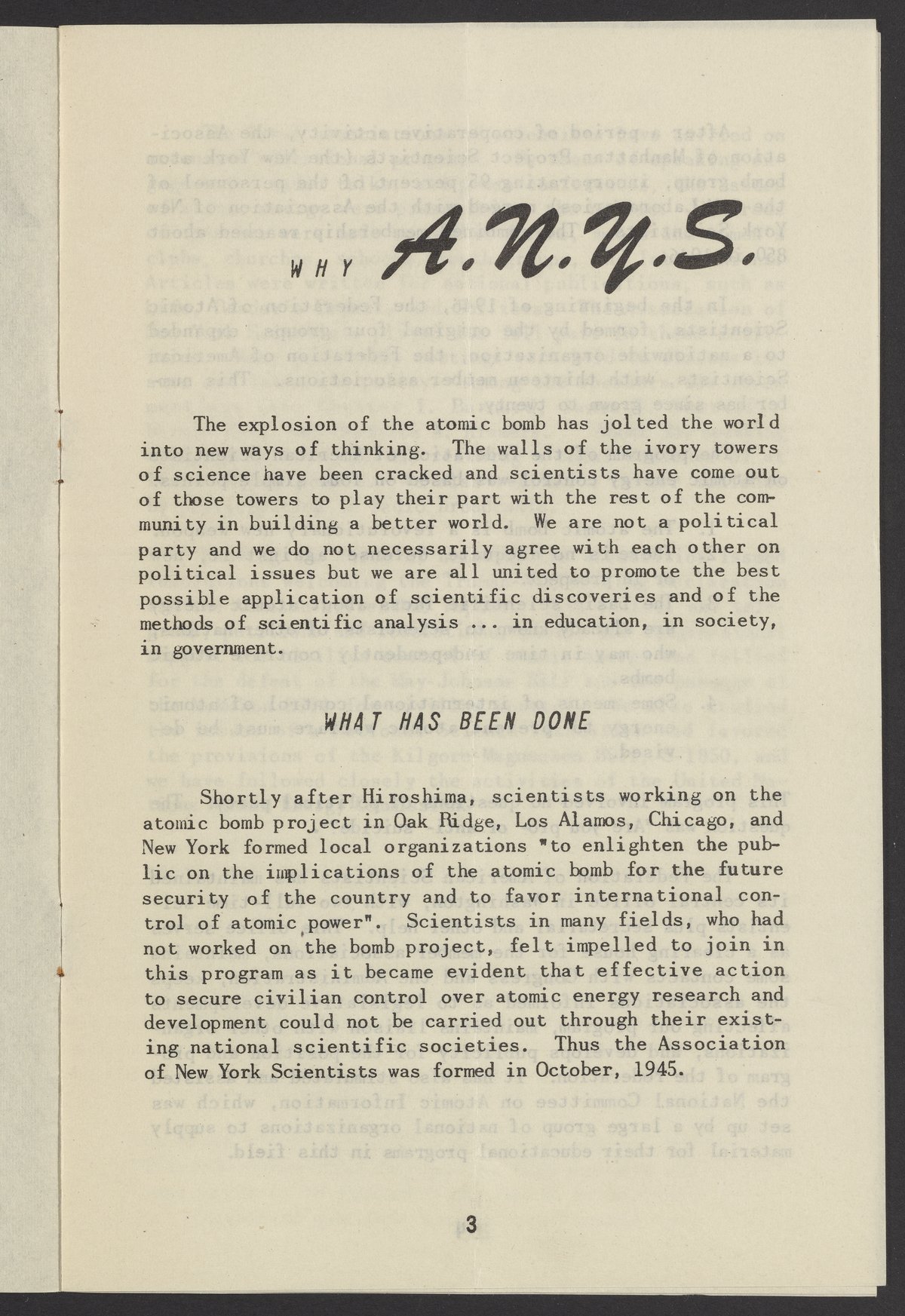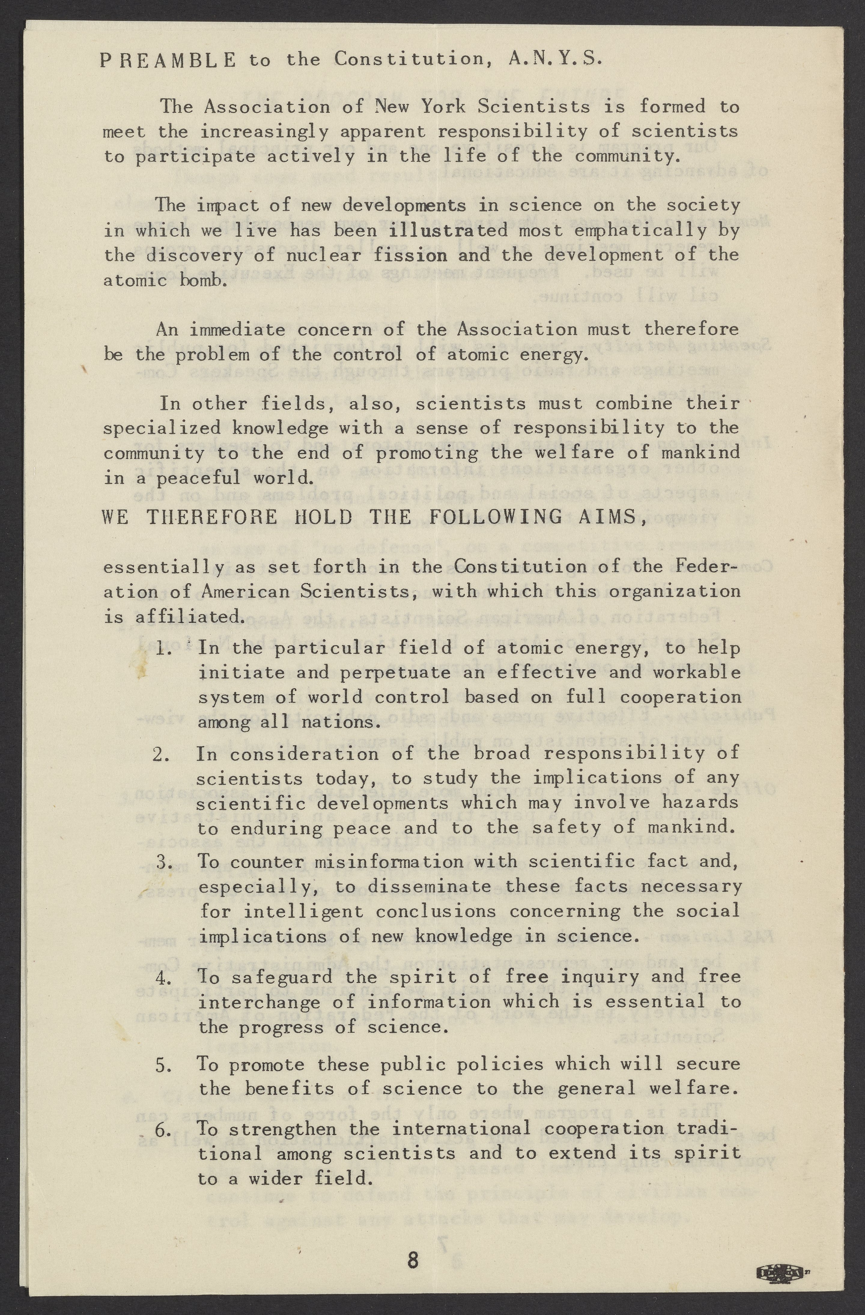 Small JPG1200 x 1825px — 280 KBLarge JPG2880 x 4380px — 1.7 MBFull-sized JPG3543 x 5388px — 2.5 MBOriginal fileTIFF — 3543 x 5388px — 54.7 MB1947 newsletter for the Association of New York Scientists (ANYS). The newsletter discusses the association's purpose and goals. ANYS believed in international control of atomic energy and bacterial warfare, a national science foundation, and civilian control of the United States Atomic Energy Commission.