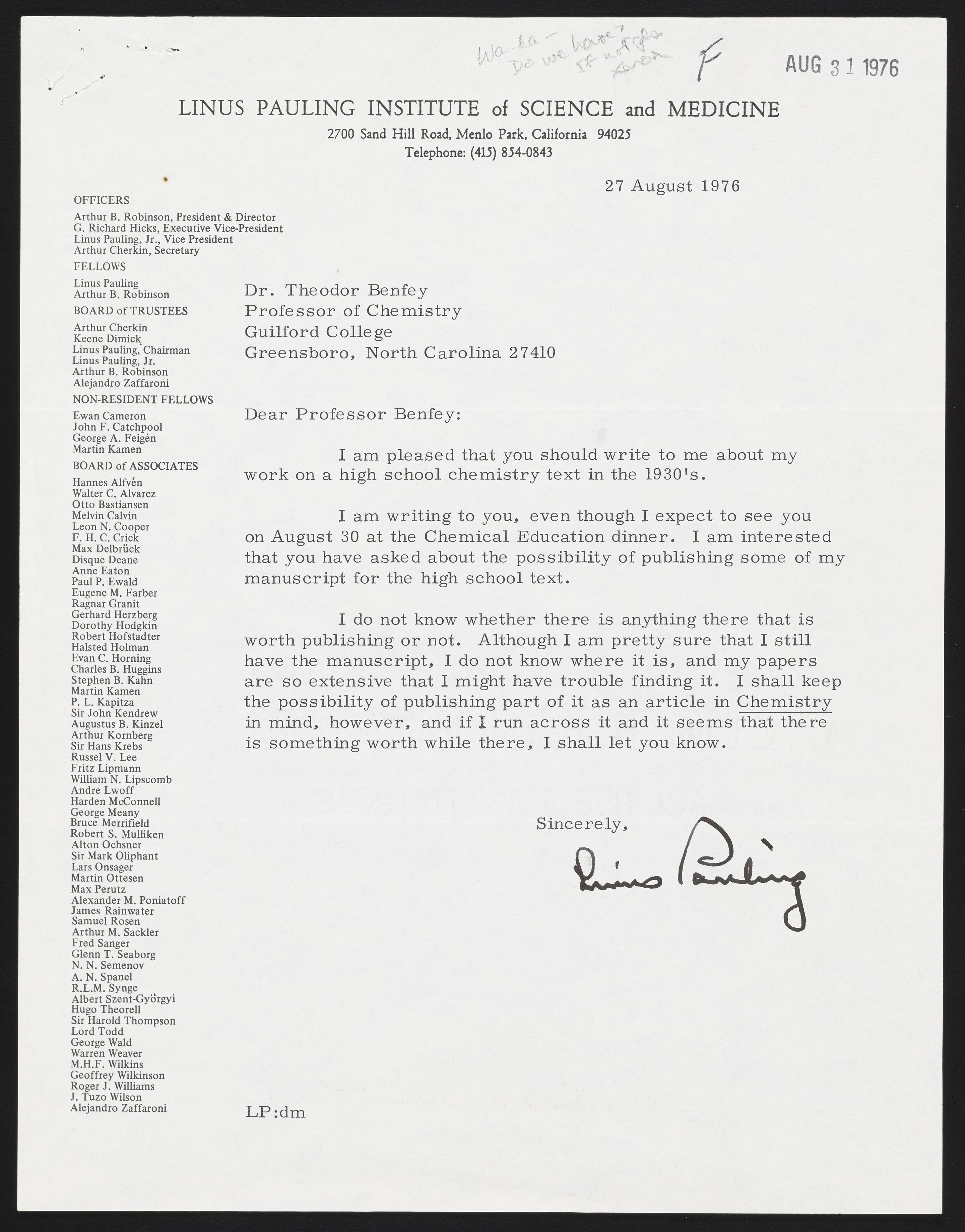 Pauling, Linus. “Letter from Linus Pauling to Theodor Benfey,” August 27, 1976. Benfey Autographed Letter Collection, Box 1. Science History Institute. Philadelphia. https://digital.sciencehistory.org/works/cf95jb452.