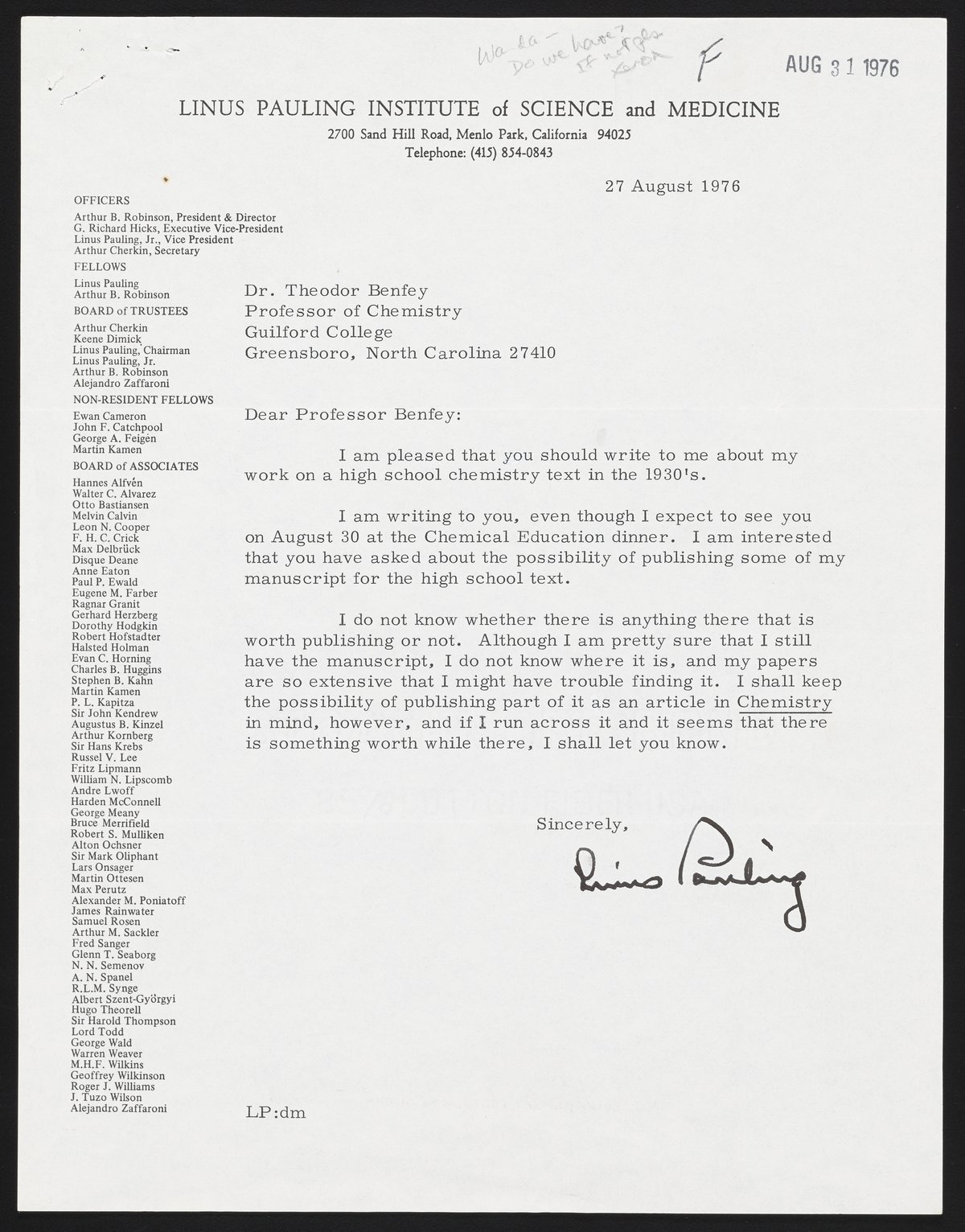 Letter from Linus Pauling to Theodor Benfey