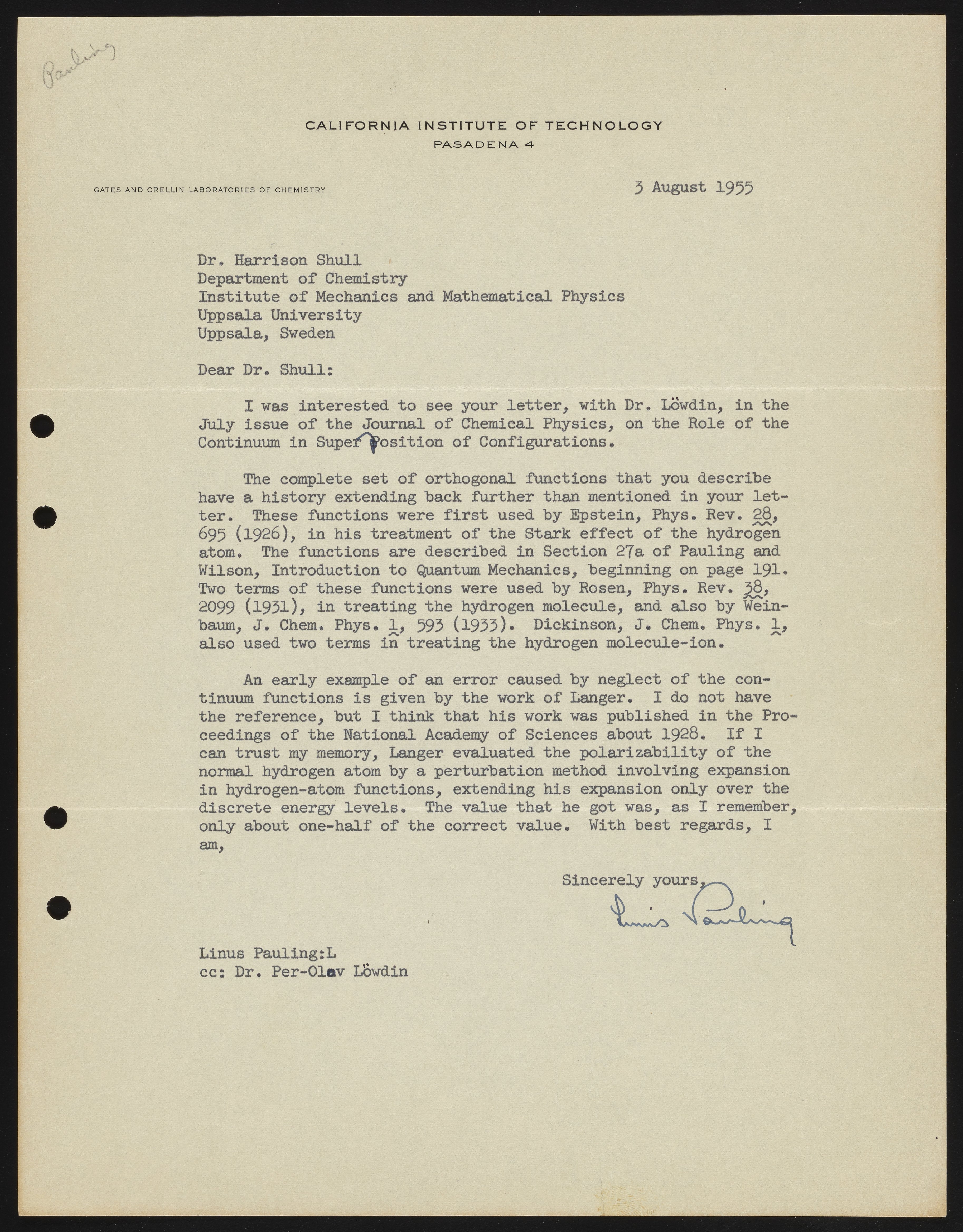 Pauling, Linus. “Letter from Linus Pauling to Harrison Shull, 1955,” August 3, 1955. Robert S. Mulliken & Harrison Shull Correspondence, Box 1. Science History Institute. Philadelphia. https://digital.sciencehistory.org/works/cf95jb495.