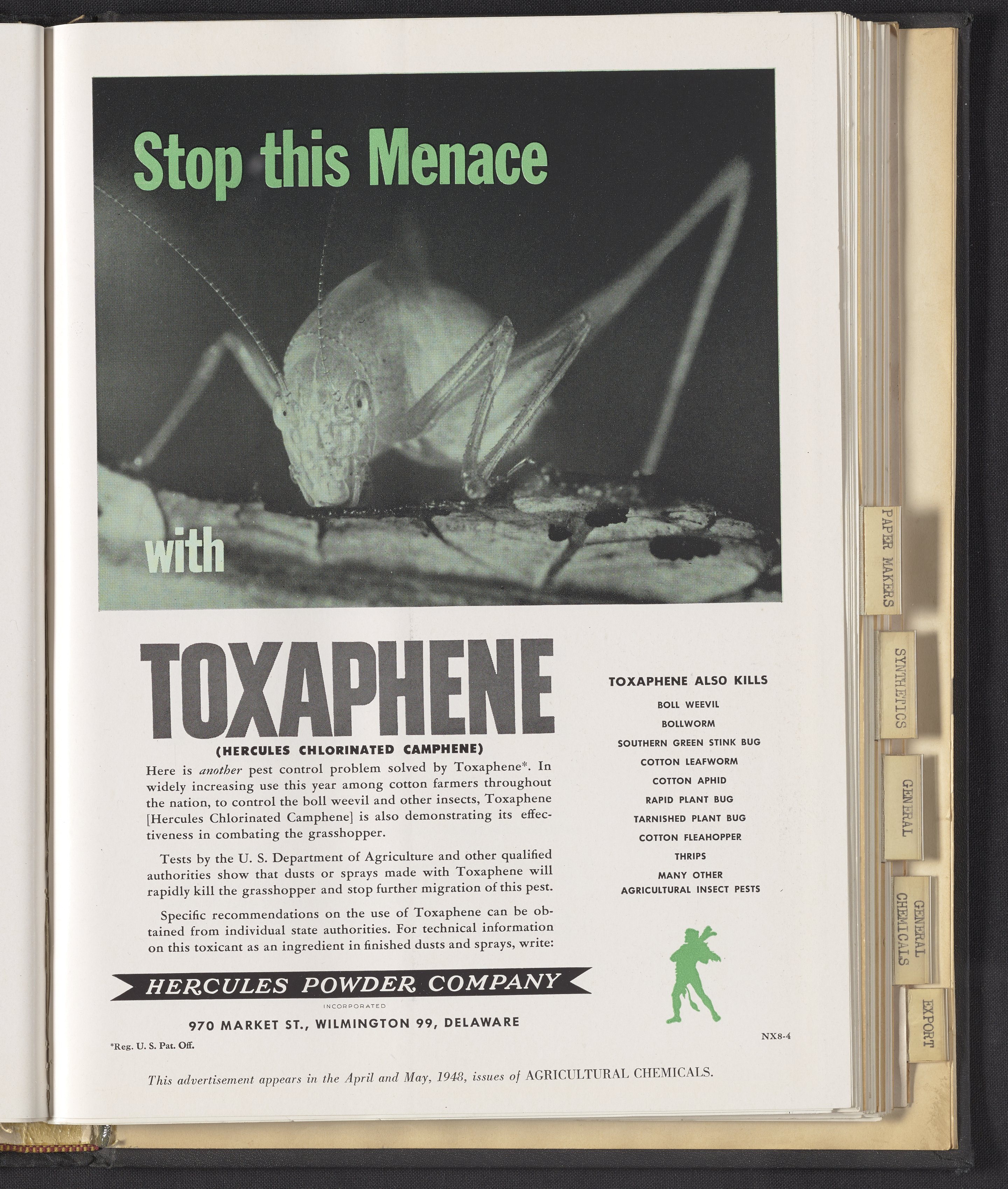 Hercules Incorporated. “Stop This Menace with Toxaphene (Hercules Chlorinated Camphene).” 1948 Hercules Advertisements, 1948. Records of Hercules Incorporated, Volume 1948. Science History Institute. Philadelphia. https://digital.sciencehistory.org/works/cf95jc326.
