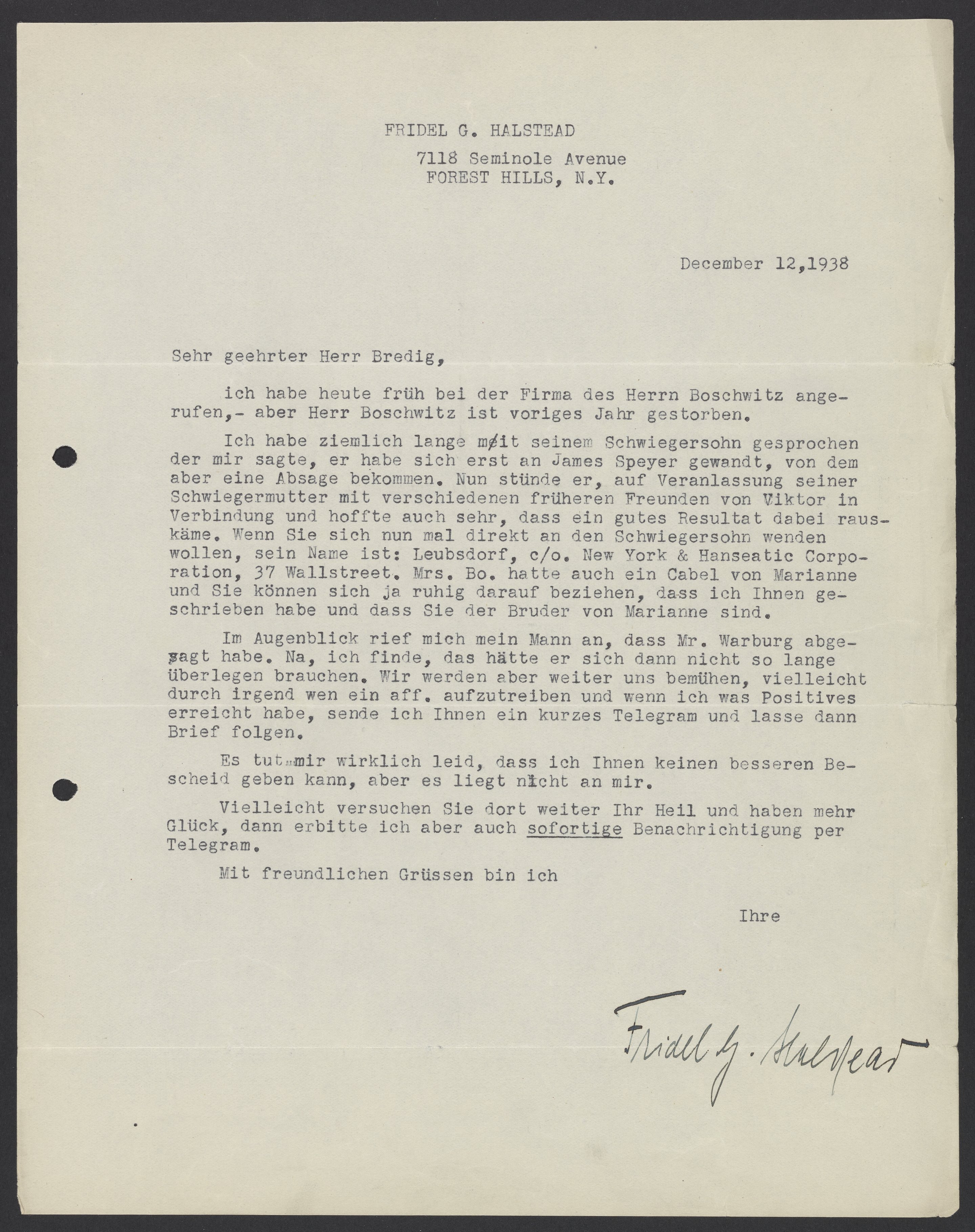 I spoke for a long time with his son-in-law, who told me that he had first turned to James Speyer but received a rejection from him. Now, at the prompting of his mother-in-law, he contacted some of Viktor’s old friends and in doing so, very much hoped to achieve a good outcome. If you want to contact the son-in-law directly, his address is 37 Wall Street. Mrs. Boschwitz received a telegram from Marianne. In addition, you can safely let her know that I wrote to you and that you are Marianne's brother.