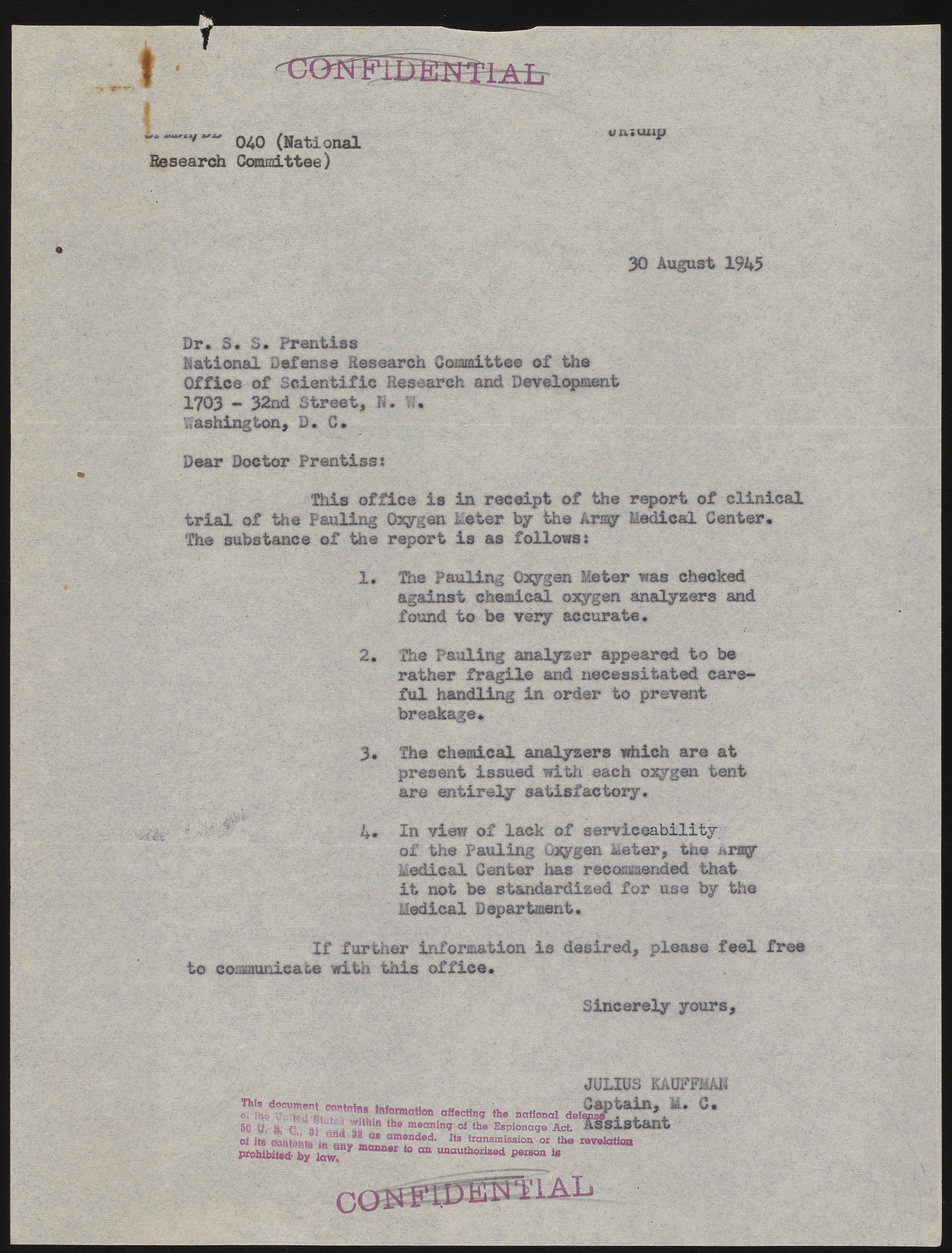 Letter summarizes the final report produced by testing the Pauling Oxygen Meter at the Army Medical Center. The final recommendation of the report is that this oxygen meter should not be standardized for use by the U.S. Army's Medical Department.
