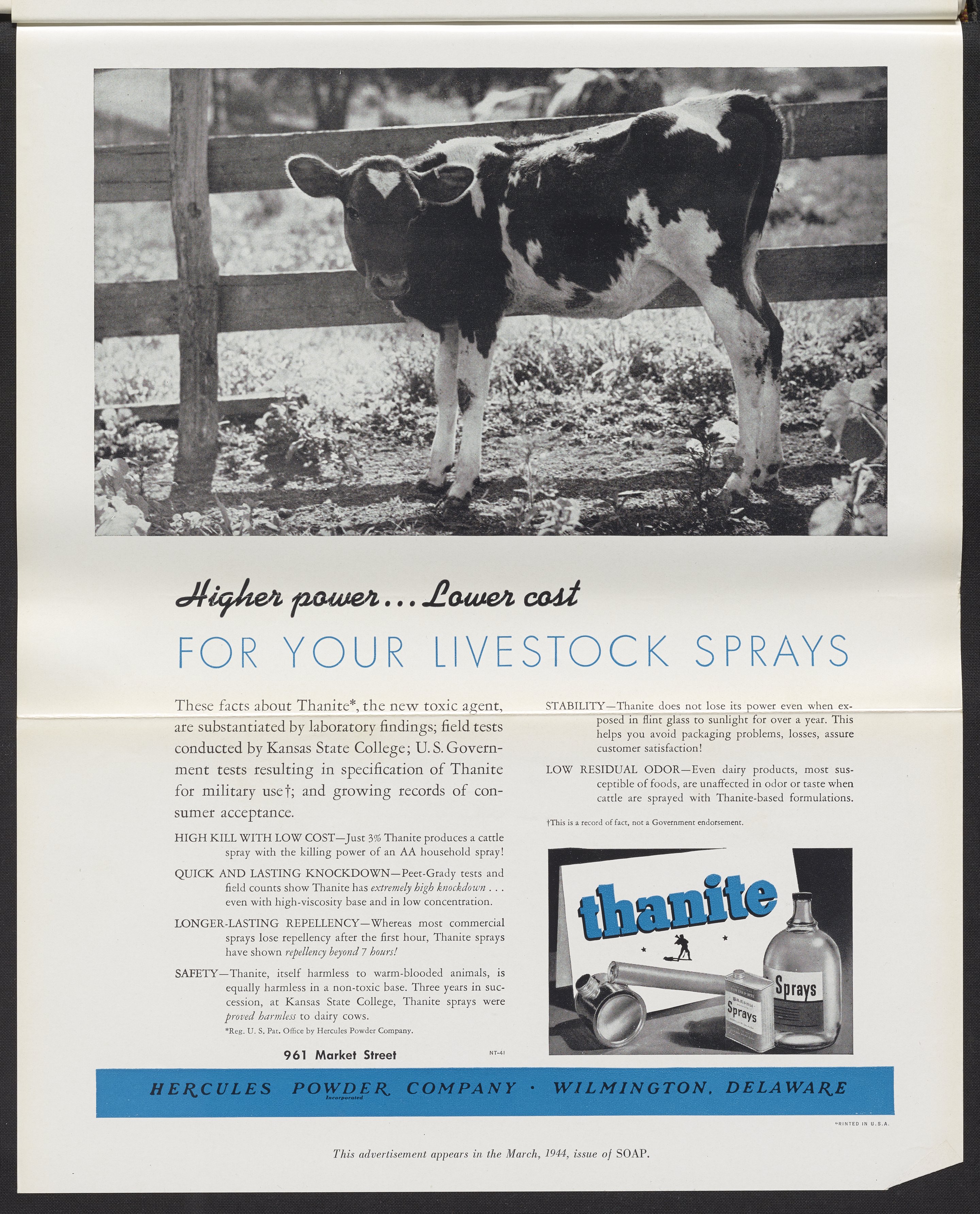 Hercules Incorporated. “Higher Power...Lower Cost for Your Livestock Sprays.” 1944 Hercules Advertisements, 1944. Records of Hercules Incorporated, Volume 1944. Science History Institute. Philadelphia. https://digital.sciencehistory.org/works/cj82k810d.