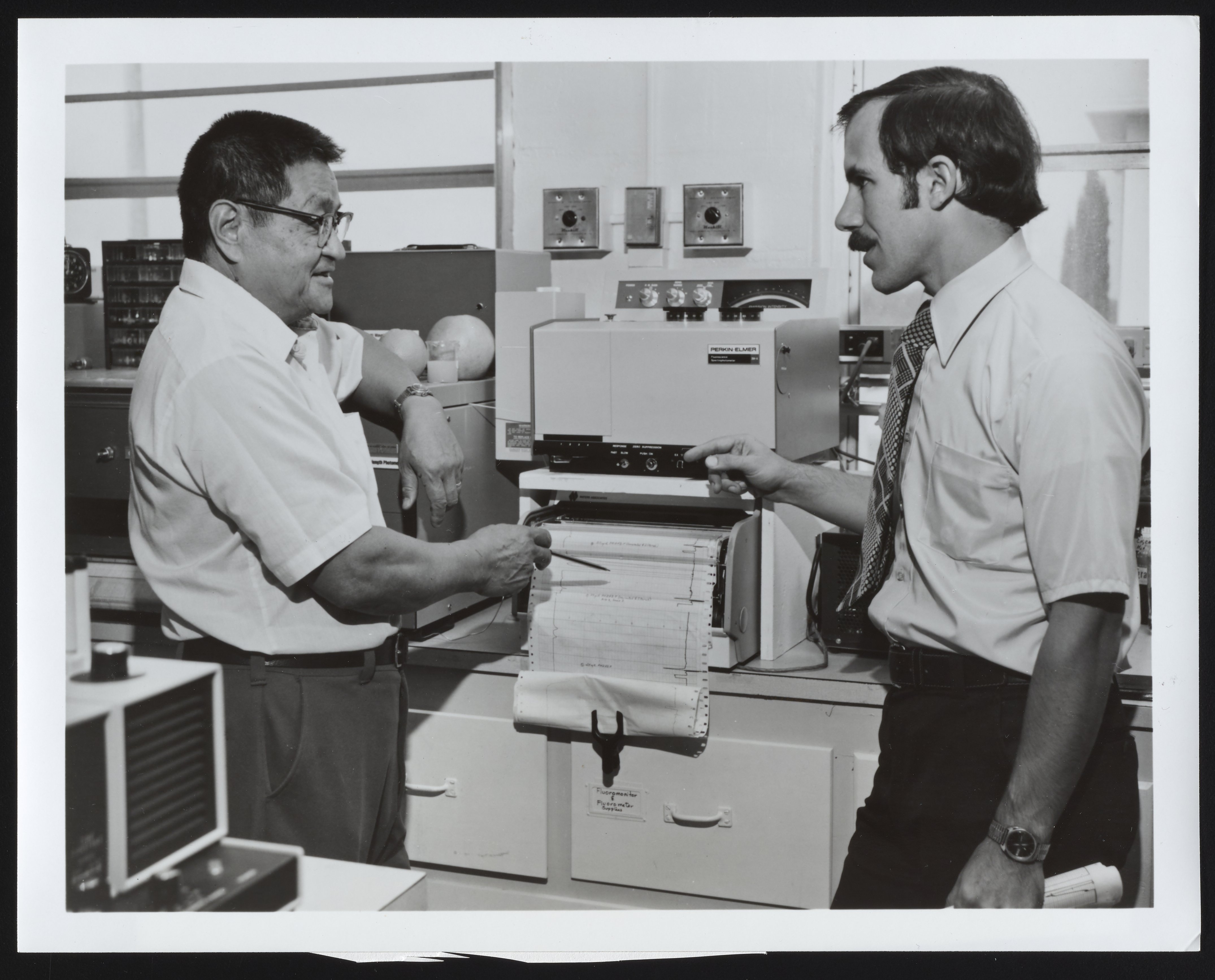 General view of Drs. S.V. Ting (left) and Russell Rouseff (right) examining the graphed readings of a Perkin-Elmer fluorescence spectrophotometer in a Florida Citrus Department laboratory located in Lake Alfred, Florida. Per notations accompanying the photograph, the instrument is used to analyze trace amounts of assorted vitamins in citrus fruits and juices, as well as amounts of Vitamin C.