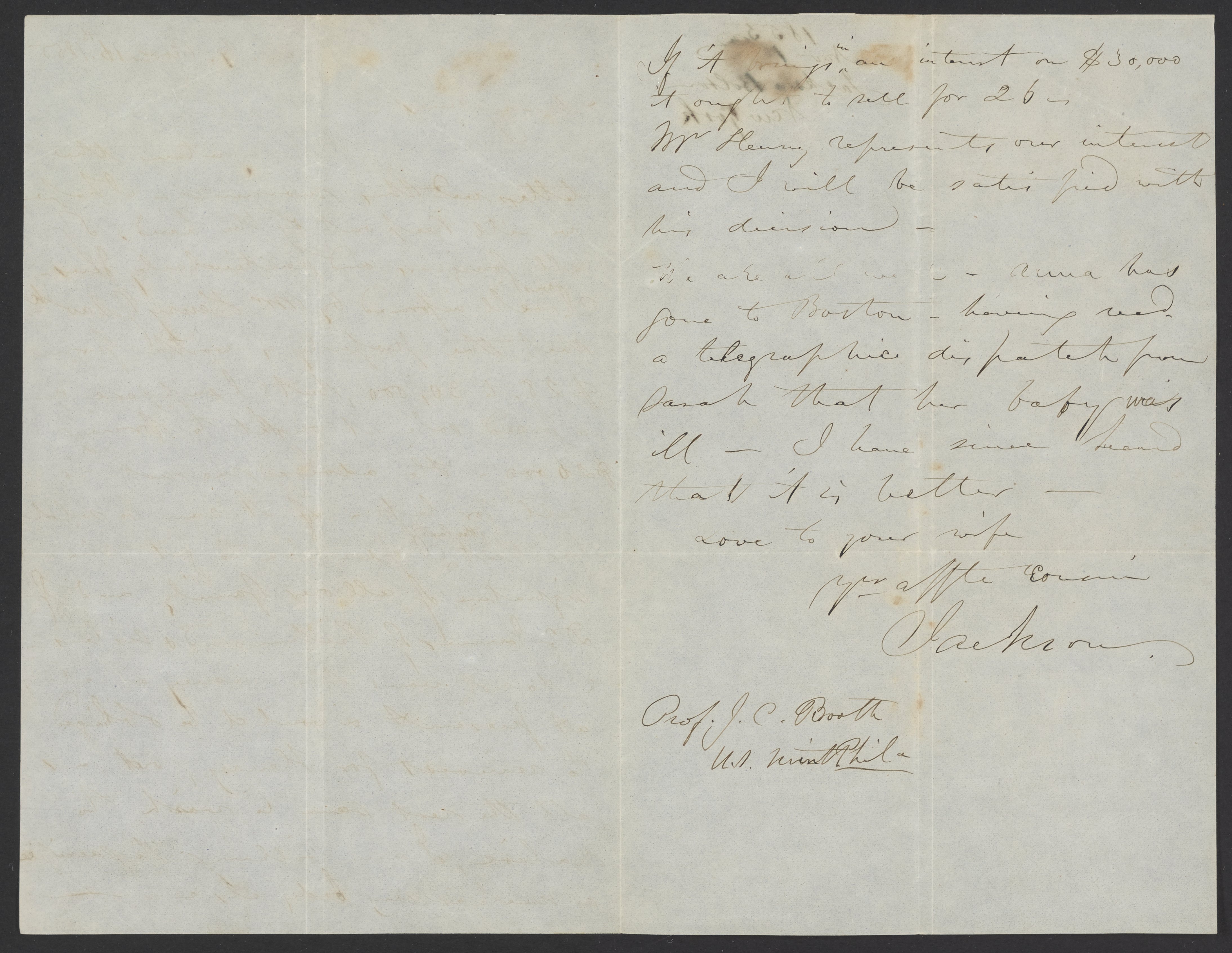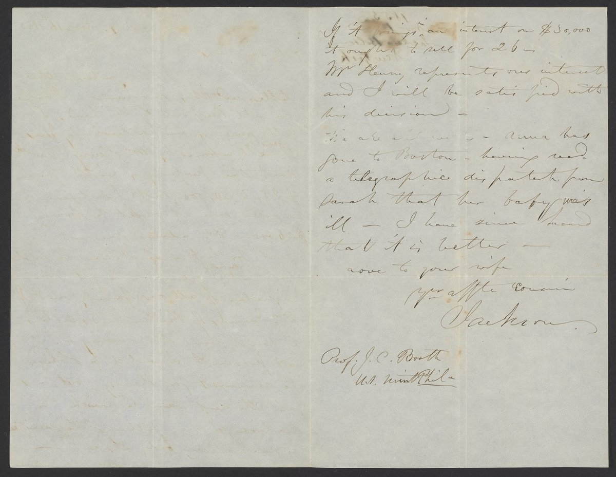 Small JPG1200 x 1811px — 338 KBFull-sized JPG2245 x 3389px — 992 KBOriginal fileTIFF — 2245 x 3389px — 21.8 MBJackson Bolton, a cousin of James Curtis Booth (1810-1888), discusses the impending sale of a property, possibly the property of Booth's late brother-in-law, Conrad W. Faber.