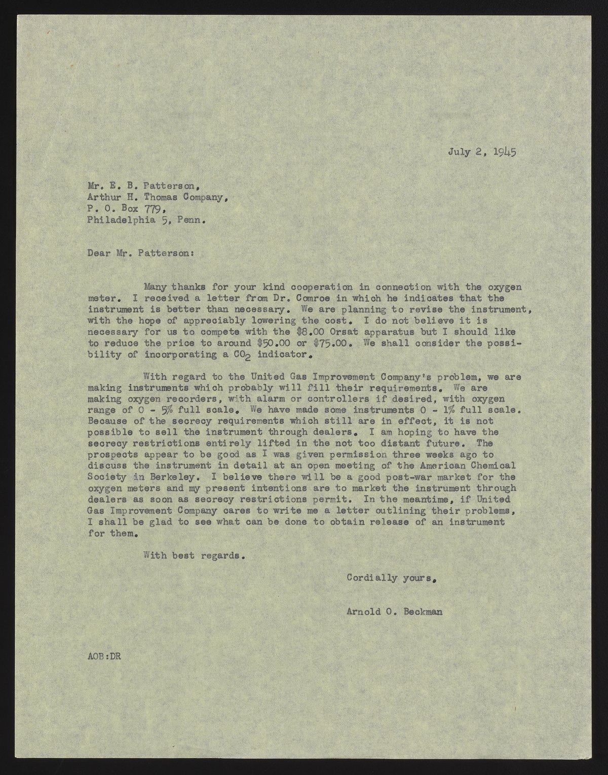 Beckman, Arnold O. “Letter from Arnold O. Beckman to E. B. Patterson,” July 2, 1945. Beckman Historical Collection, Box 19, Folder 8. Science History Institute. Philadelphia. https://digital.sciencehistory.org/works/cn69m472q.
