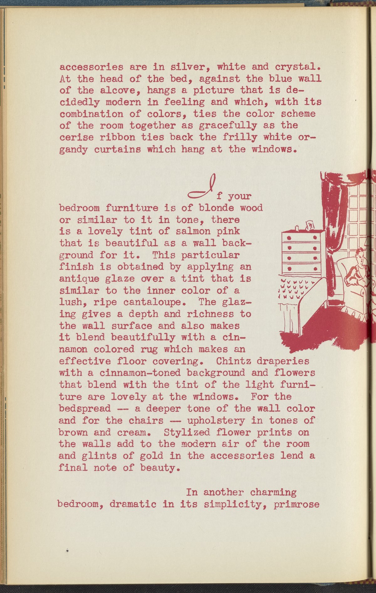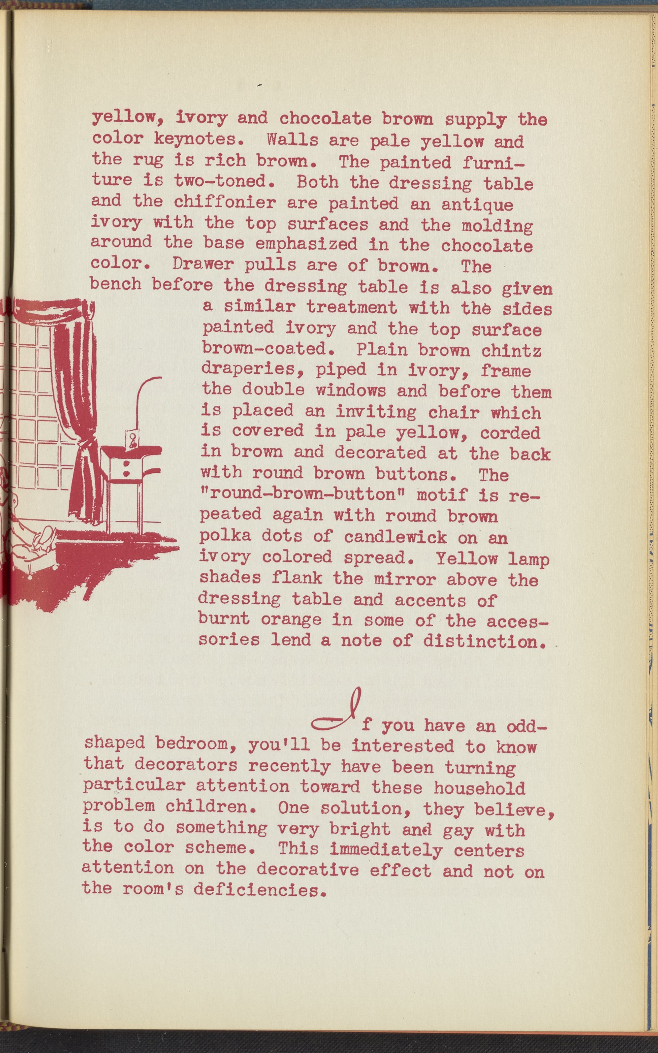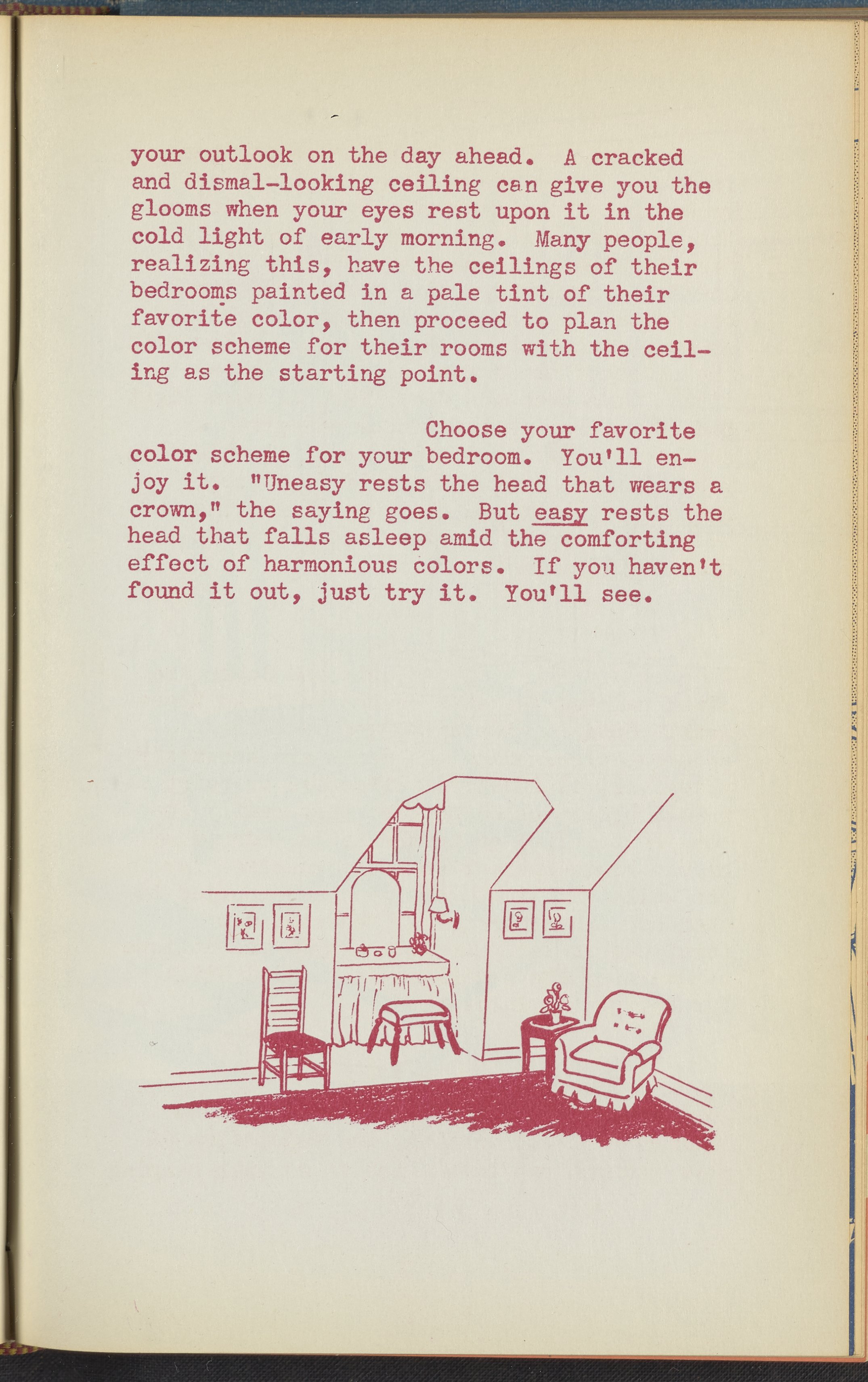 Booklet corresponding to a radio broadcast program created by the National Paint, Varnish, and Lacquer Association. The booklet discusses how to determine a harmonious color scheme when redecorating a bedroom. Describes several bedroom design schemes for inspiration. Includes small stylized illustrations throughout and decorated covers.