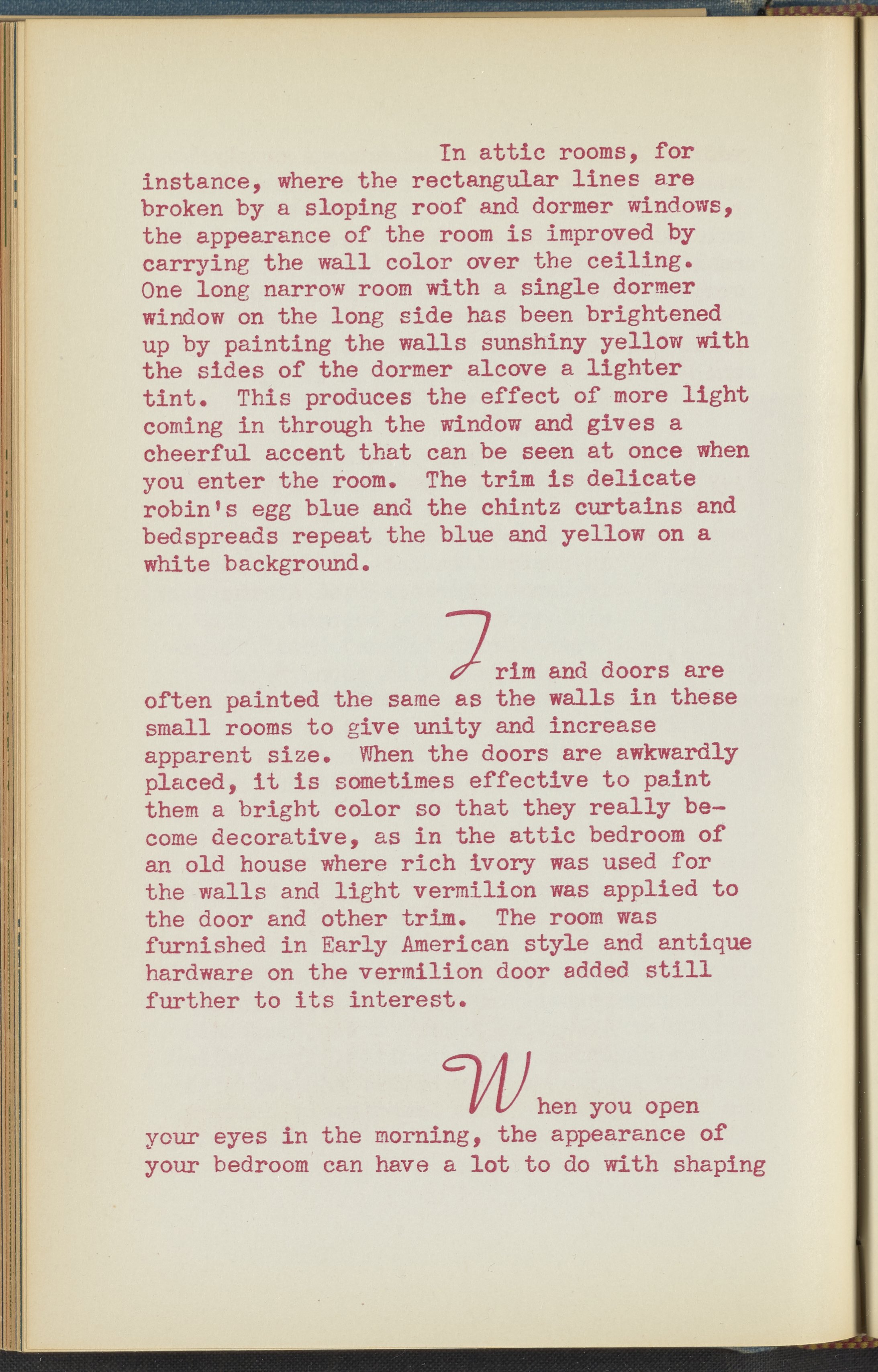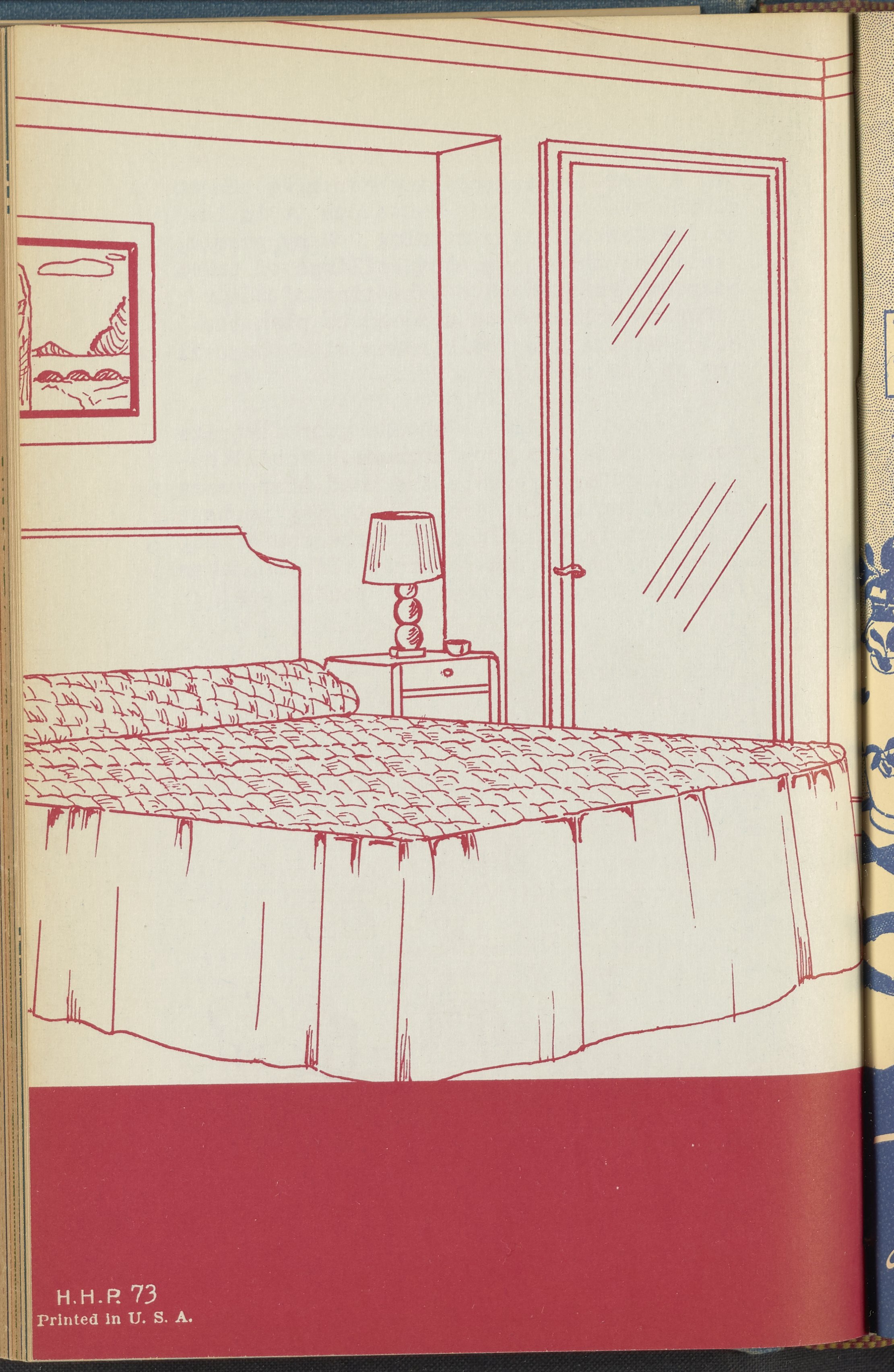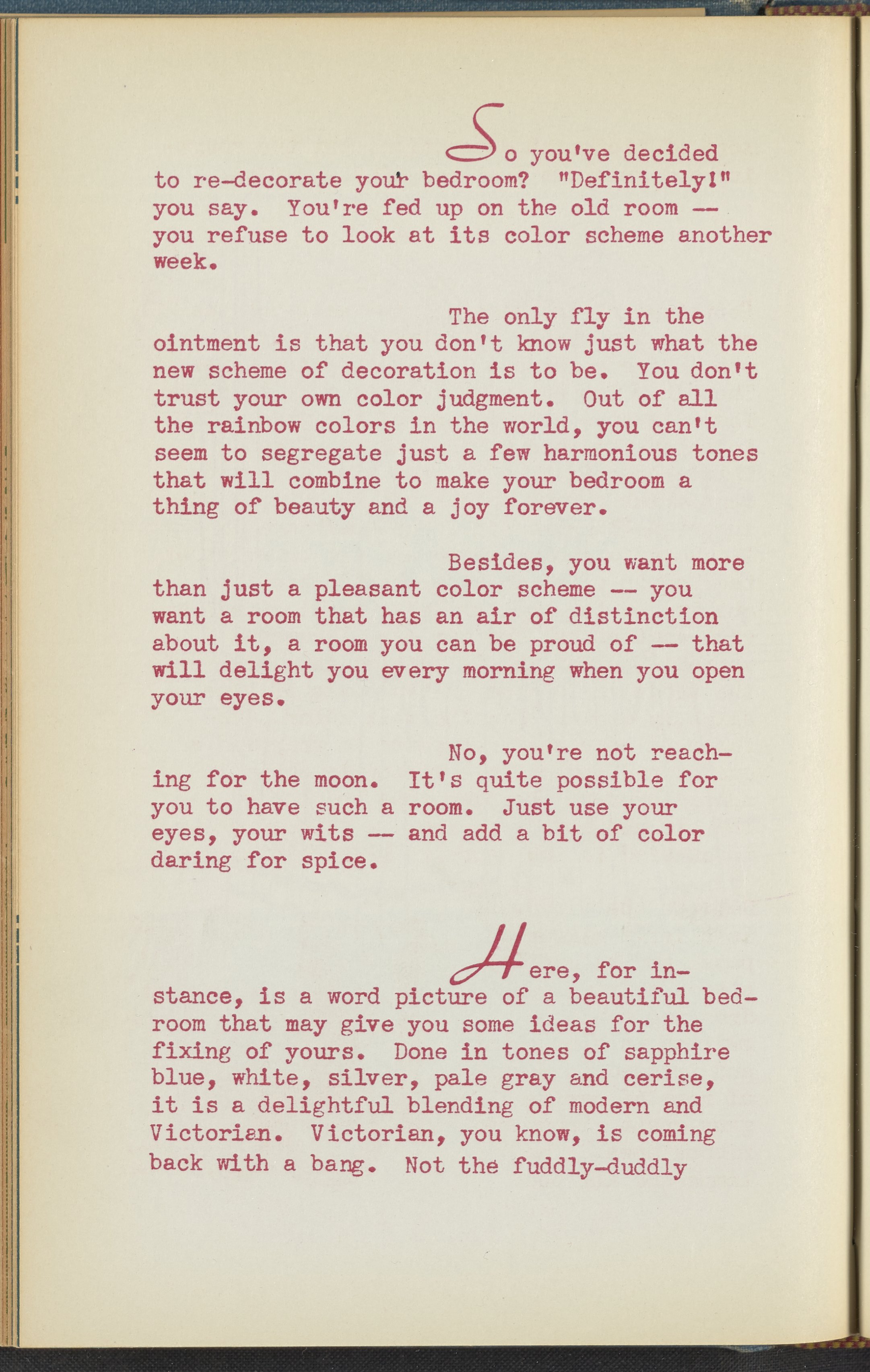 Booklet corresponding to a radio broadcast program created by the National Paint, Varnish, and Lacquer Association. The booklet discusses how to determine a harmonious color scheme when redecorating a bedroom. Describes several bedroom design schemes for inspiration. Includes small stylized illustrations throughout and decorated covers.