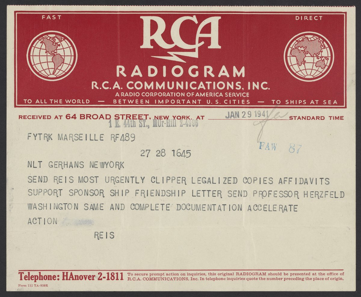 Radiogram from Alfred Reis (1882-1951) to Max Bredig (1902-1977). Reis asks Bredig to send him and Professor Herzfeld copies of an affidavit, a "friendship letter," and supporting documentation for his sponsorship. These documents are needed for Reis to immigrate to the United States.