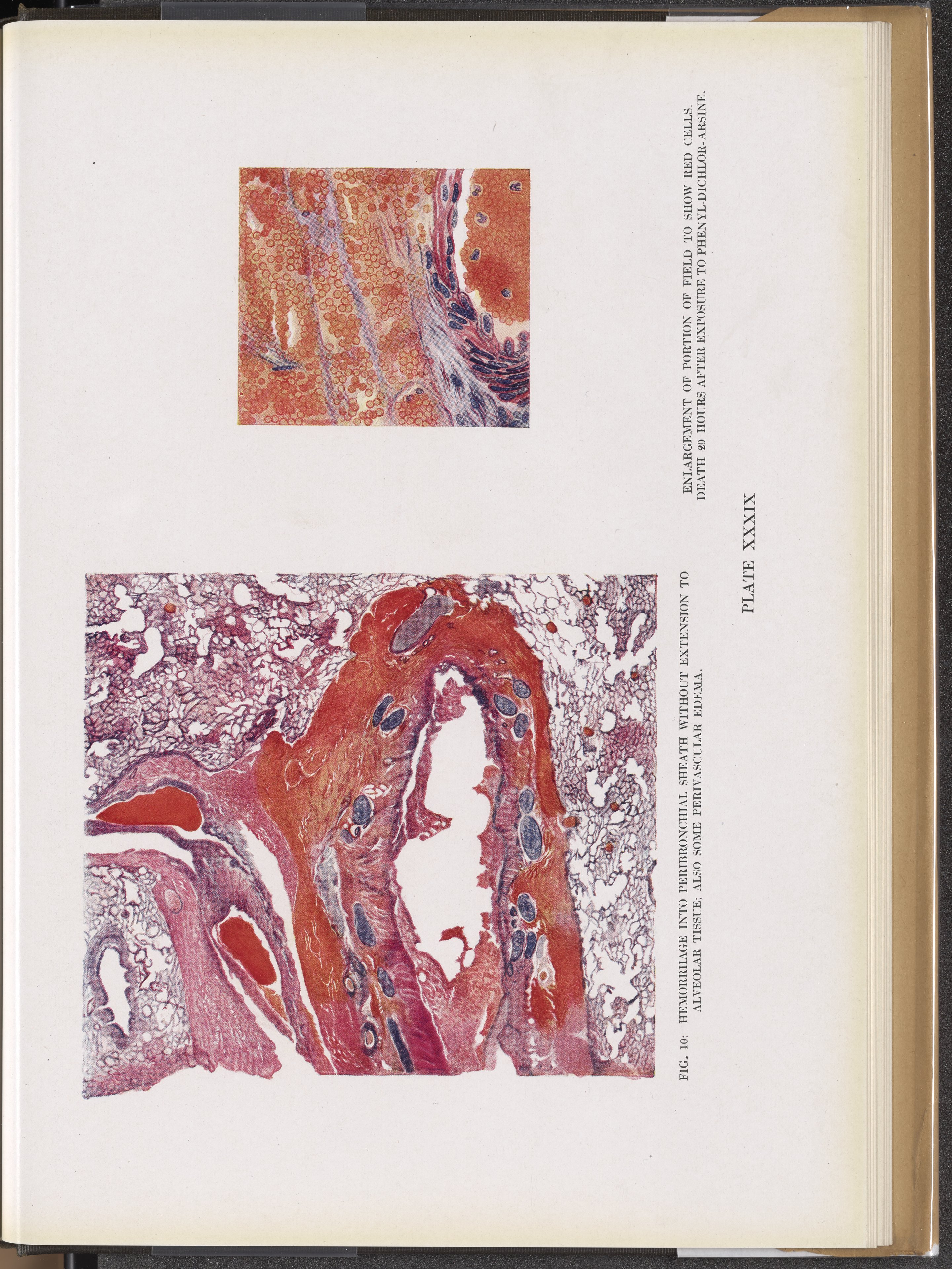 Plate XXXIX (Fig. 10): Hemorrhage into peribronchial sheath without extension to alveolar tissue; also perivascular edema.