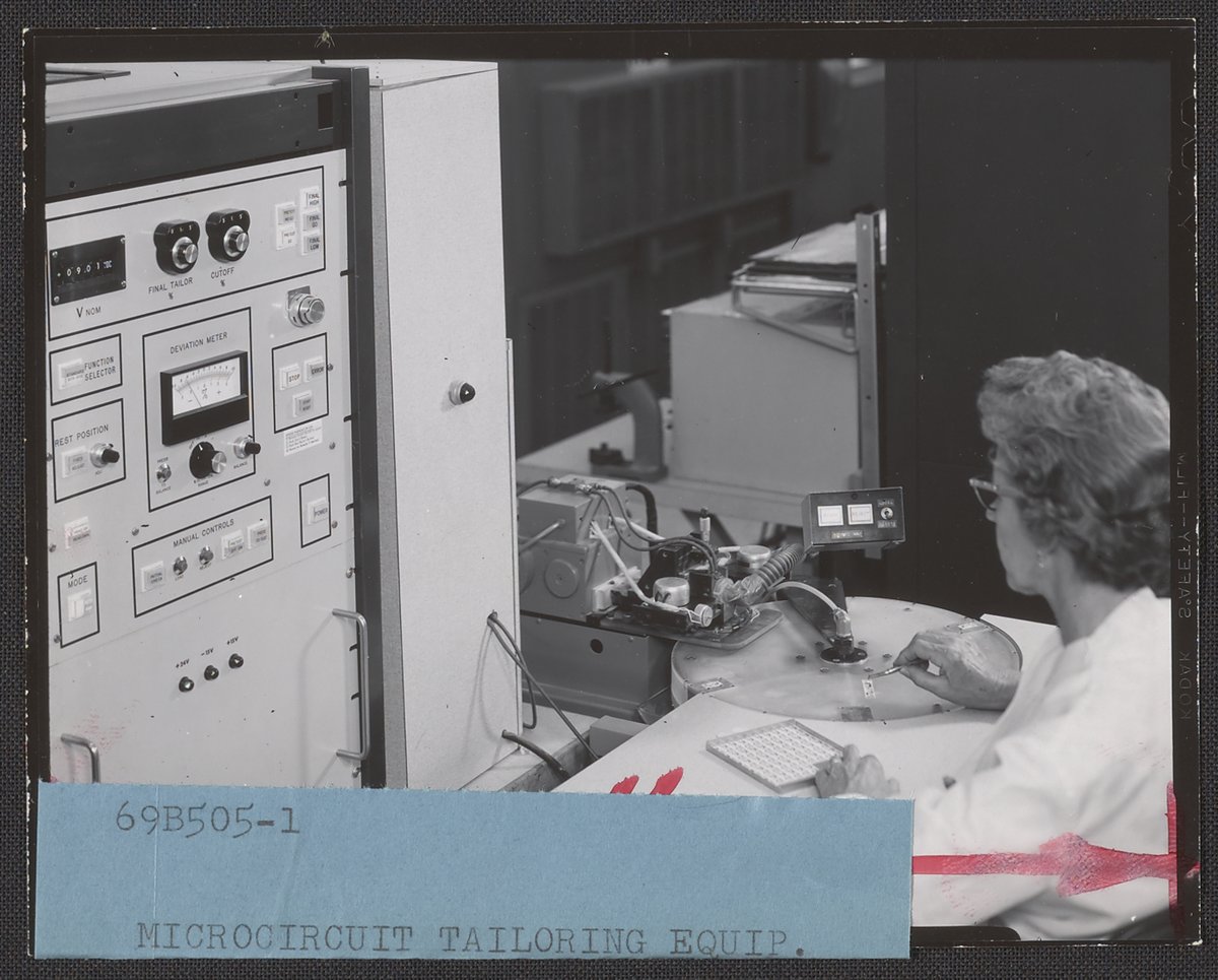 Beckman Instruments Photographic Services Section. “Woman Using Helipot Microcircuit Tailoring Equipment,” 1960–1969. Beckman Historical Collection, Box 85. Science History Institute. Philadelphia. https://digital.sciencehistory.org/works/cr56n130f.