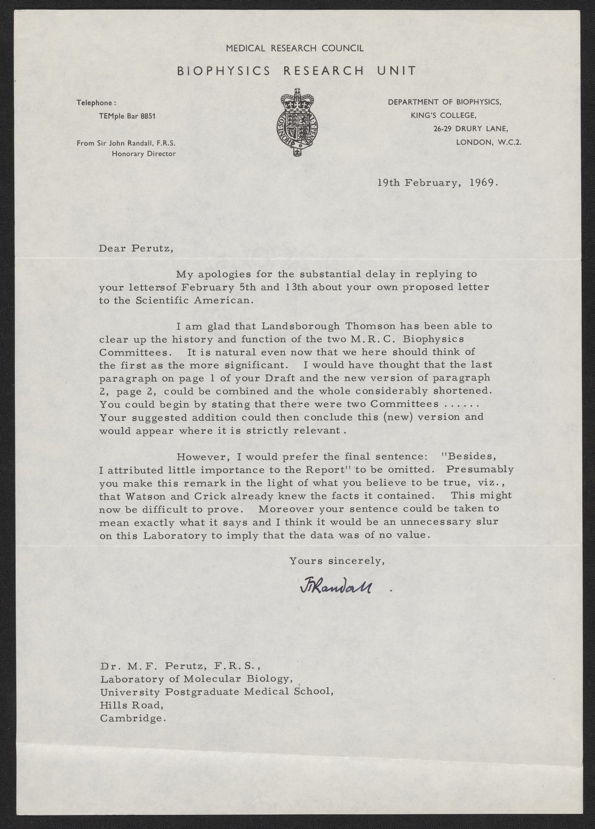 Randall, J. T. (John Turton). “Letter from John Randall to Max Perutz, February 19, 1969,” February 19, 1969. History of Molecular Biology Collection, Box 88, Folder 3. Science History Institute. Philadelphia. https://digital.sciencehistory.org/works/crxkm3b.