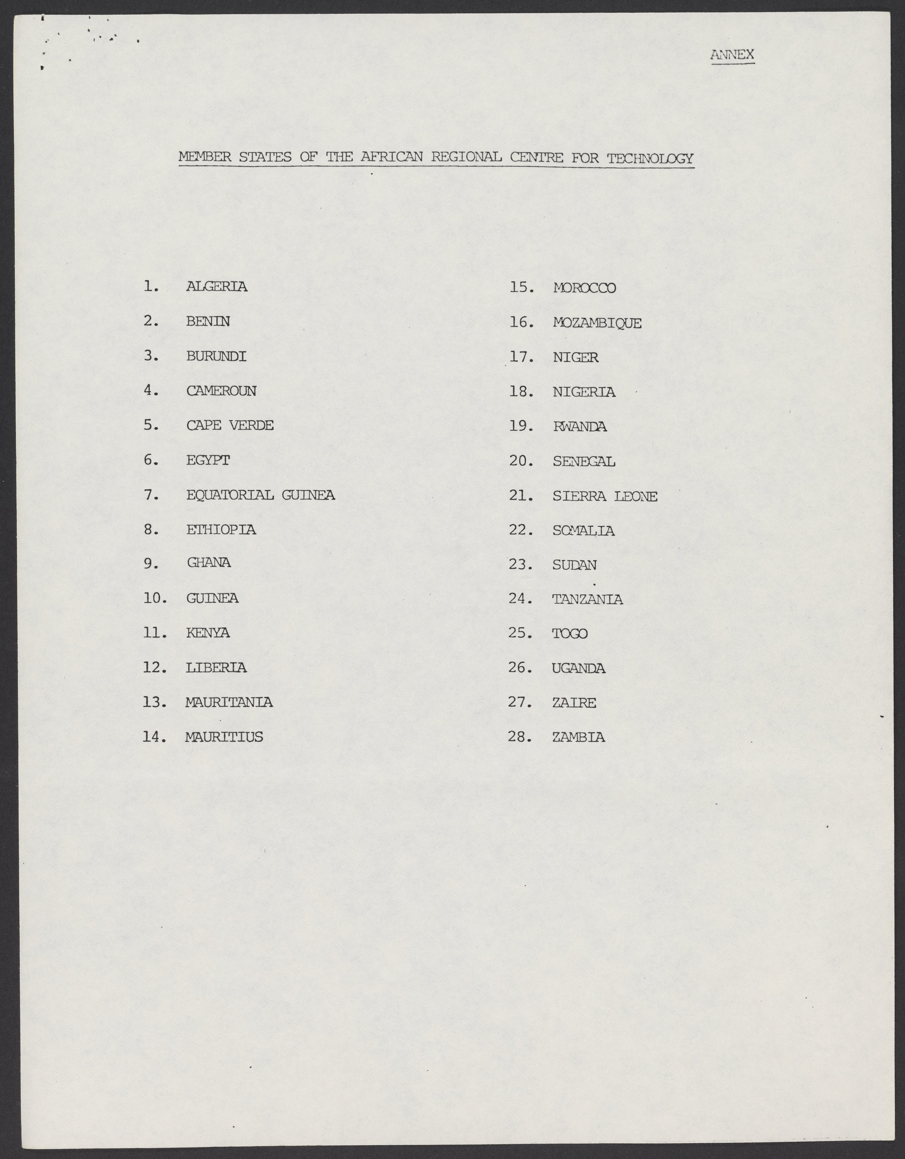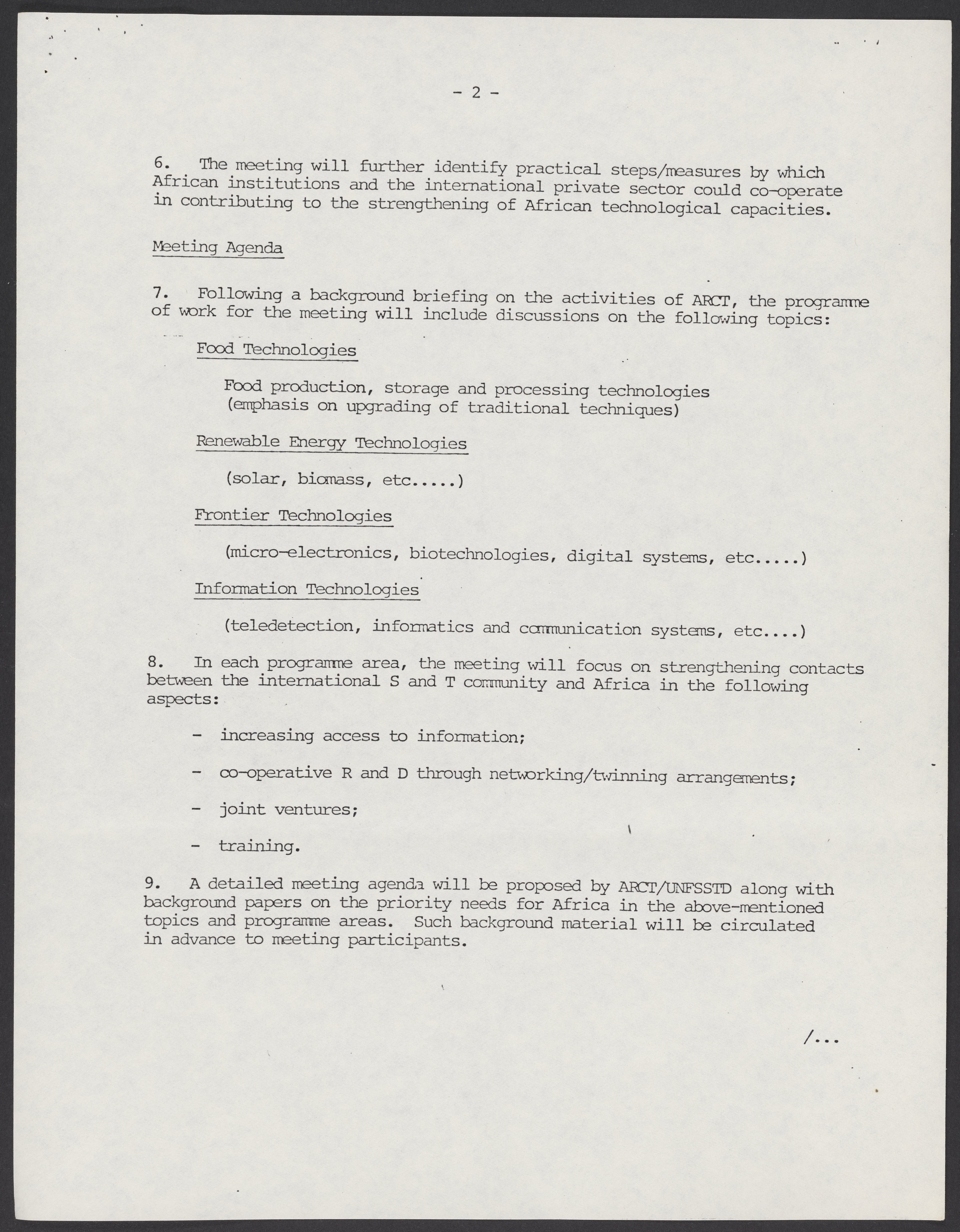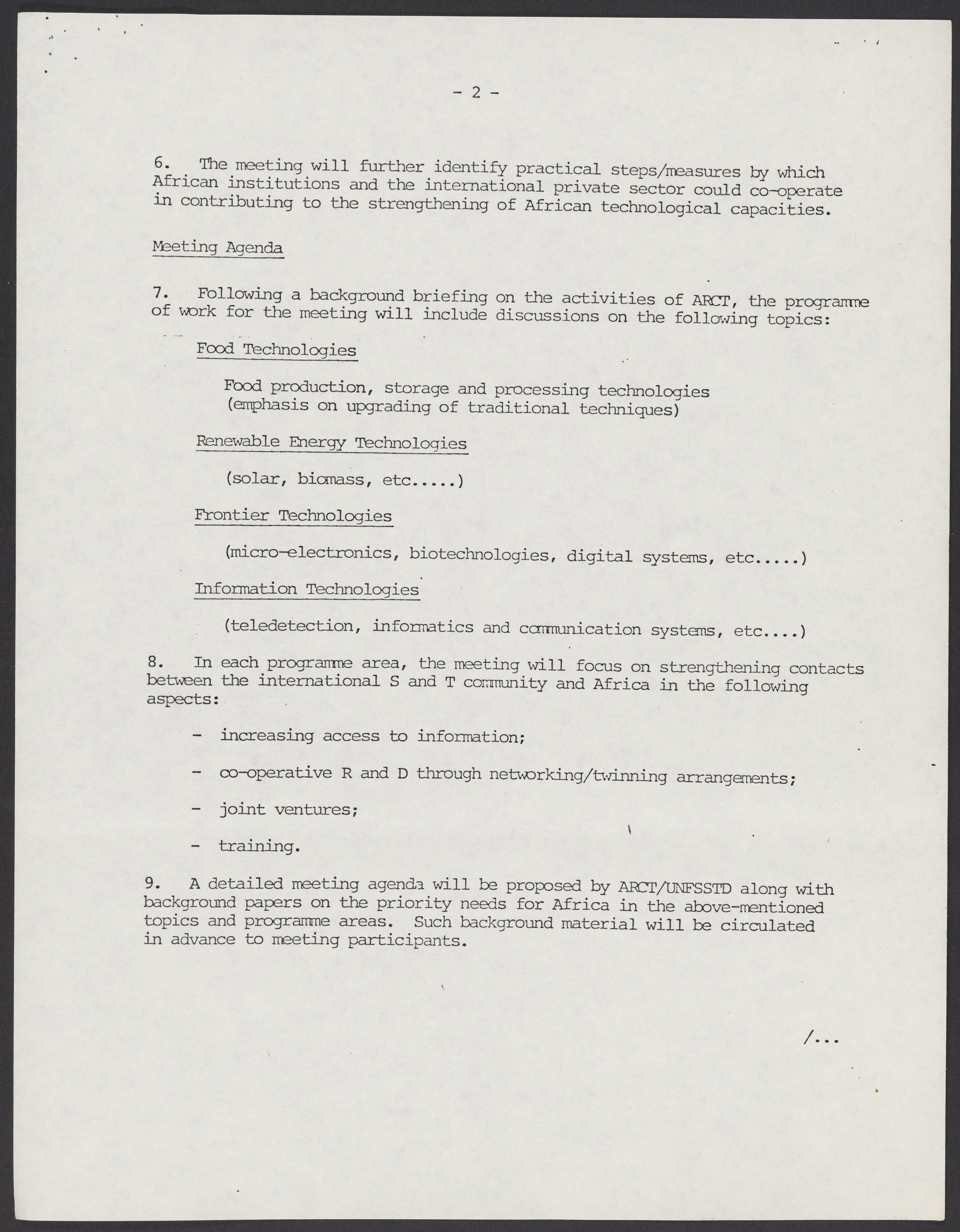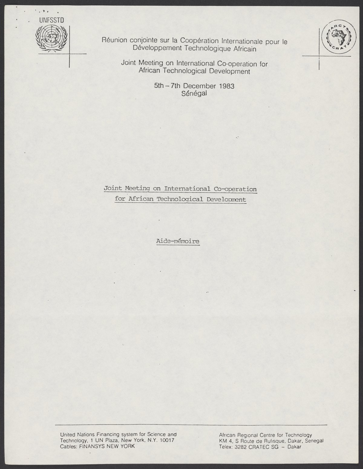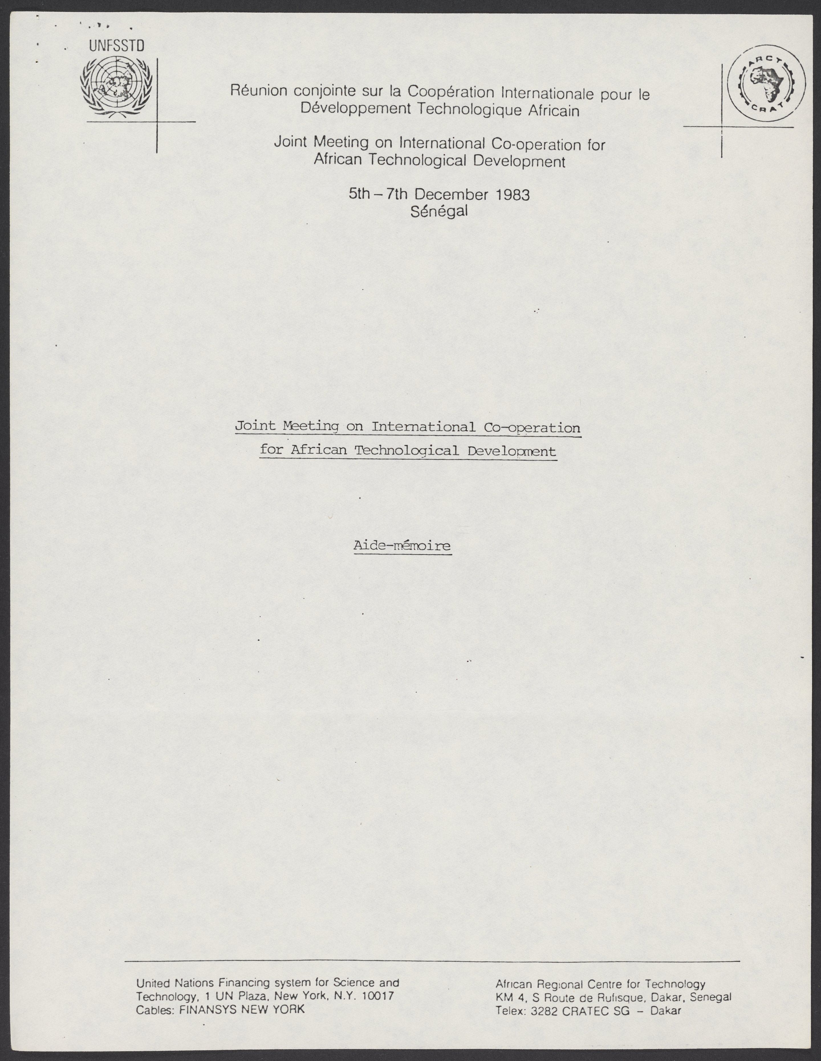 Small JPG1200 x 1550px — 182 KBLarge JPG2880 x 3720px — 1.2 MBFull-sized JPG5363 x 6927px — 4.4 MBOriginal fileTIFF — 5363 x 6927px — 106 MBAn overview of the Joint Meeting on International Co-operation for African Technological Development, to be held December 5-7, 1983 in Senegal. The meeting was intended to strengthen the relationship between the African Regional Centre for Technology and the United Nations Financing System for Science and Technology for Development and to create programs and connections that would mutually benefit both parties.
