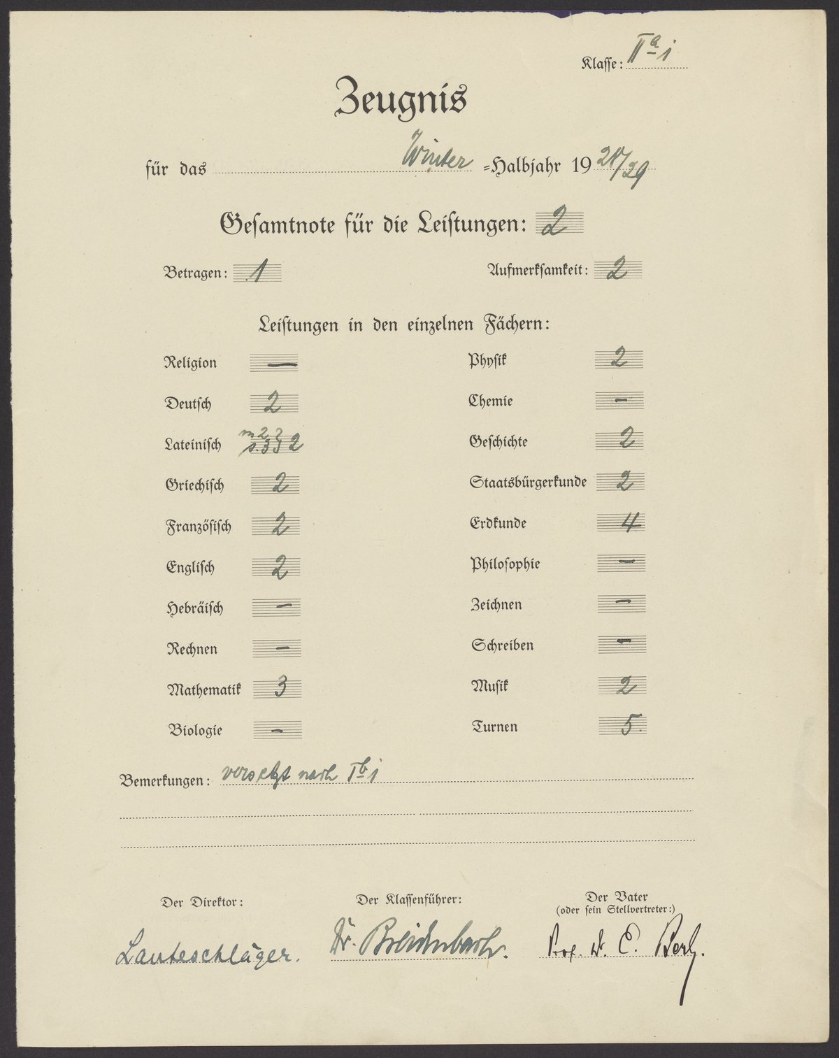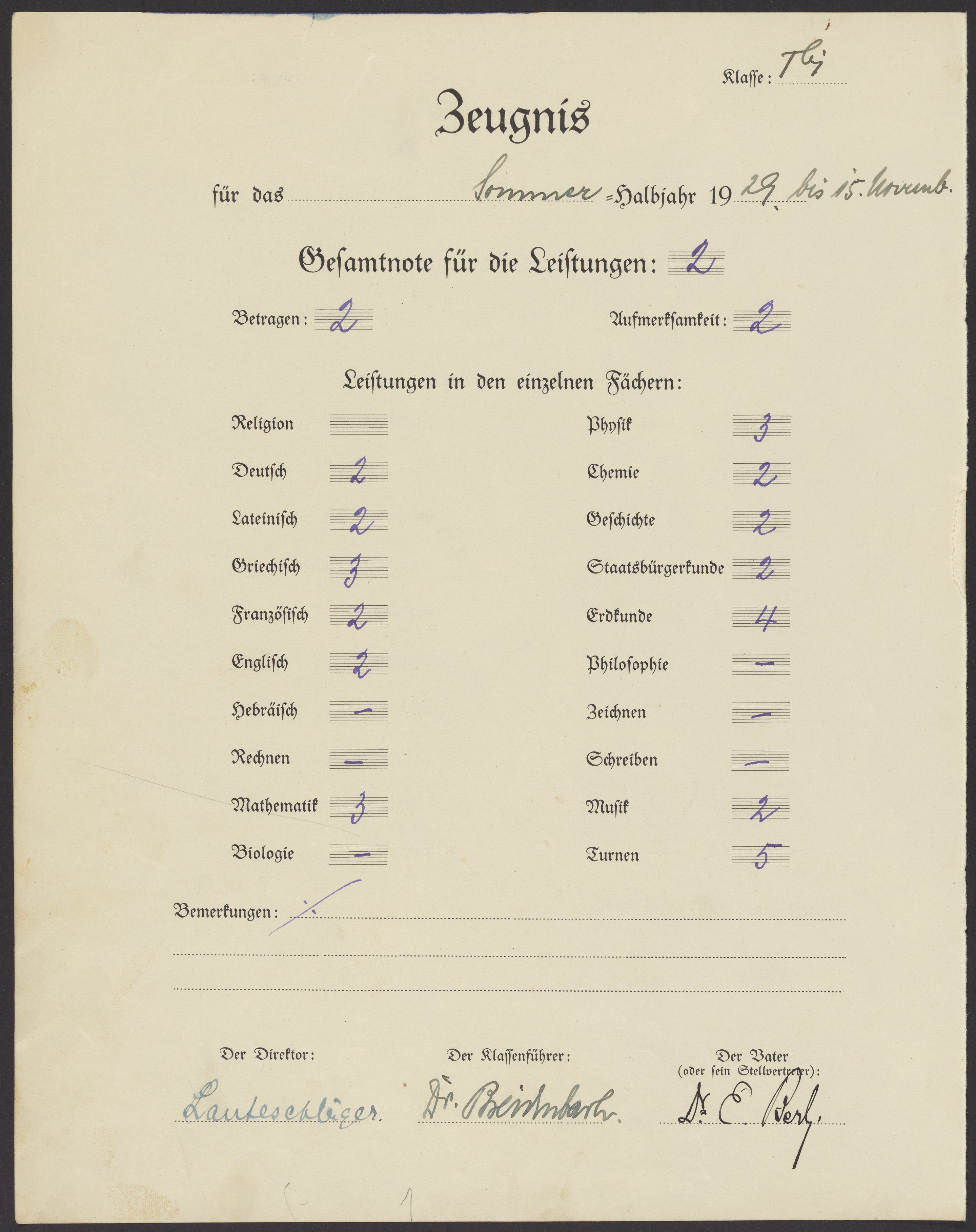 Herbert Berl's school report card, 1928-1929