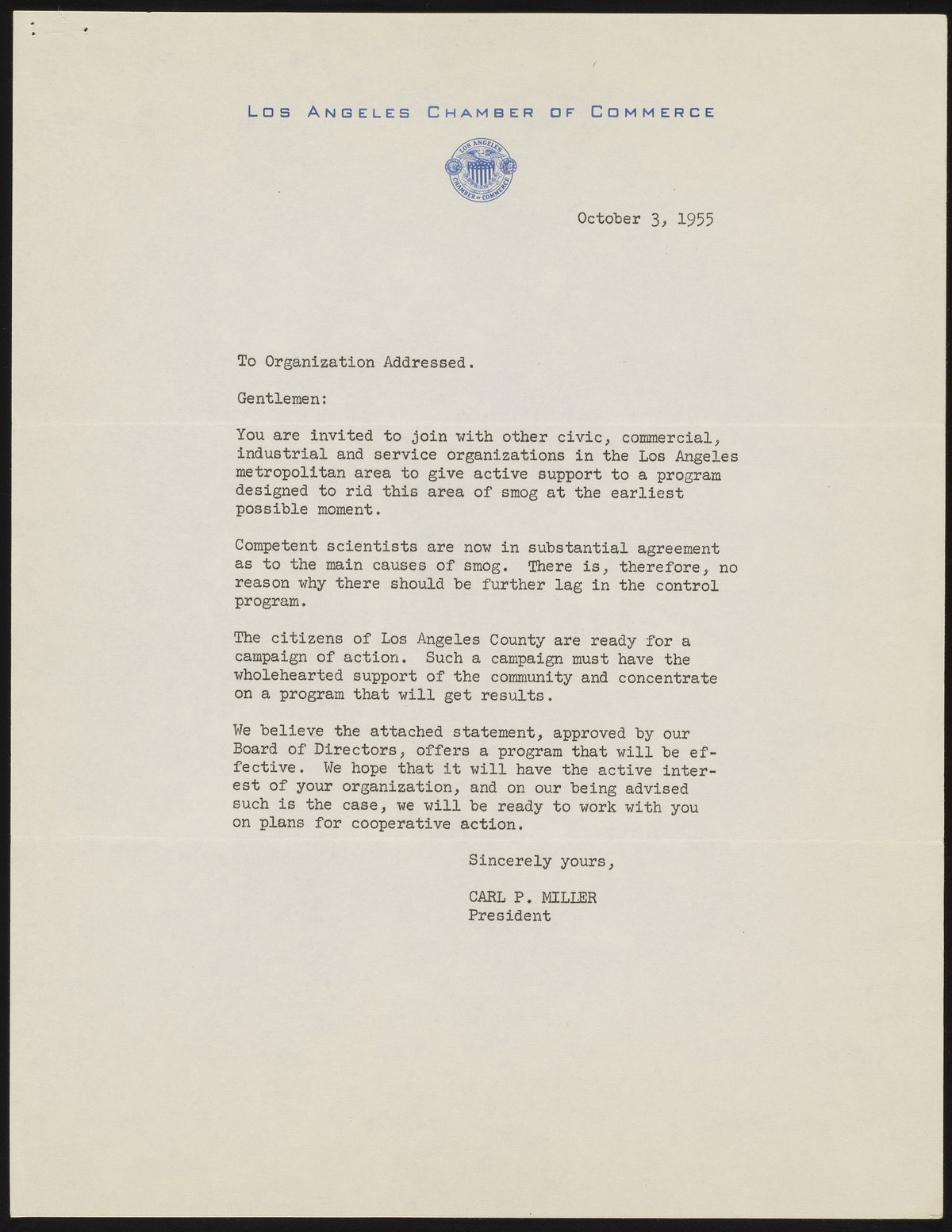 This letter from then LA Chamber of Commerce president Carl Miller asks Los Angeles business and industry leaders to collaborate to fight smog.