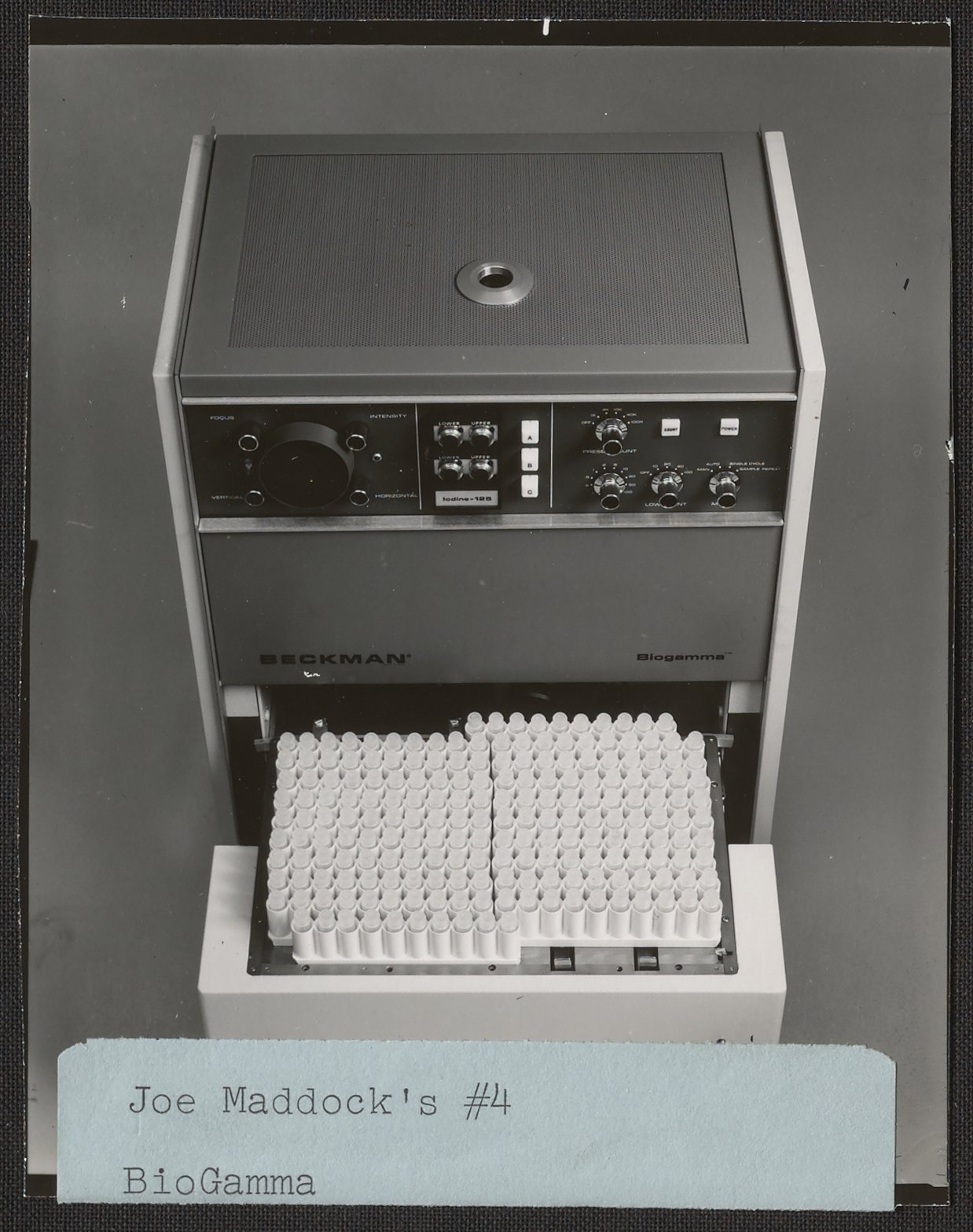 Maddocks, Joe. “Beckman Biogamma Radioimmuno Analyzer,” 1973–1982. Beckman Historical Collection, Box 84. Science History Institute. Philadelphia. https://digital.sciencehistory.org/works/cv43nx080.