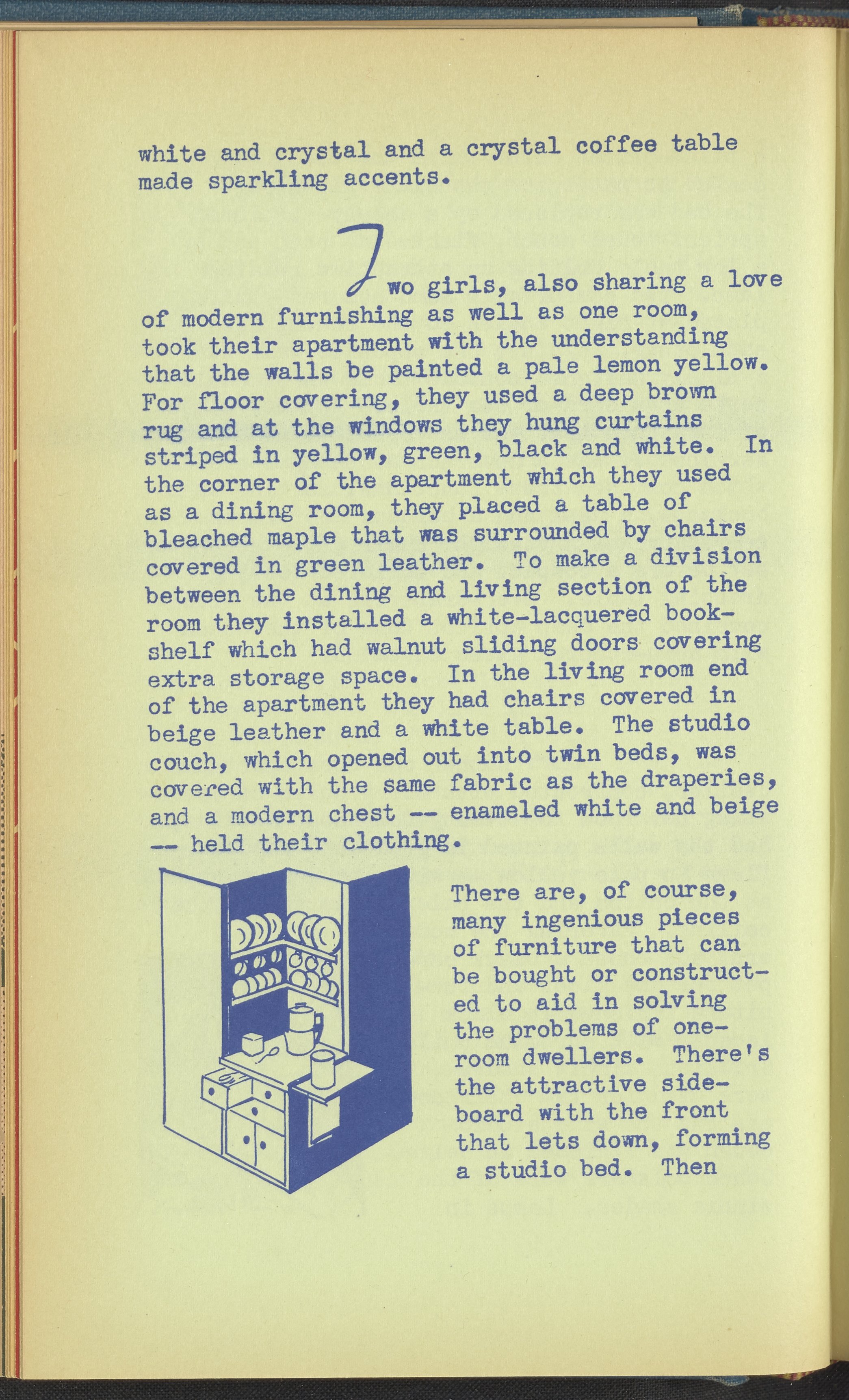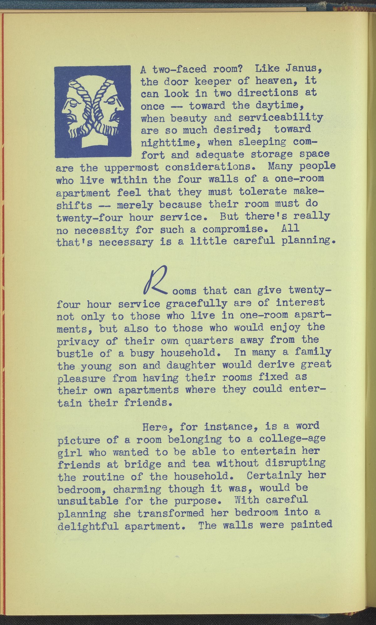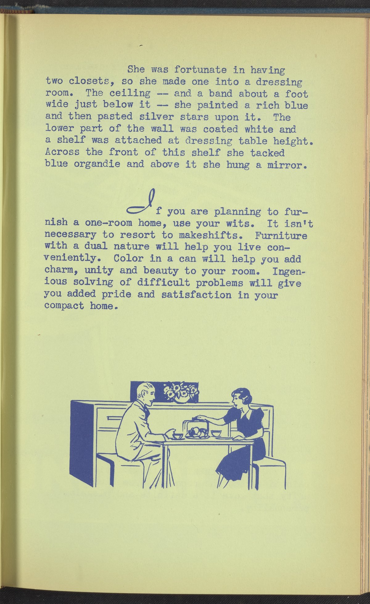 Booklet corresponding to a radio broadcast program created by the National Paint, Varnish, and Lacquer Association. The booklet discusses how to decorate and situate a single-room or small apartment to be multi-functional and efficient. Provides examples of small-space solutions to inspire home decoration. Includes small stylized illustrations throughout and decorated covers.