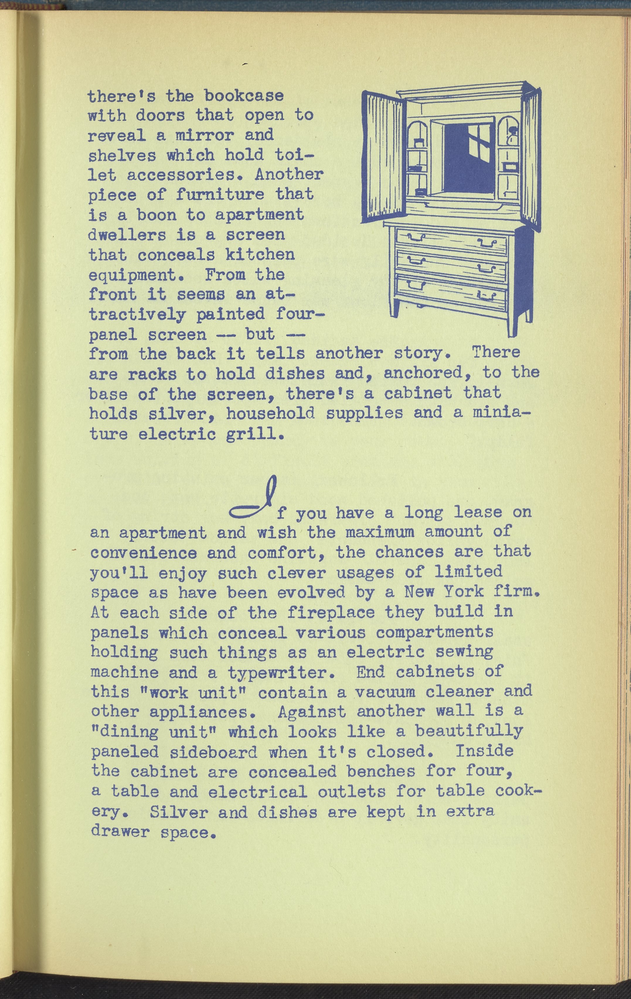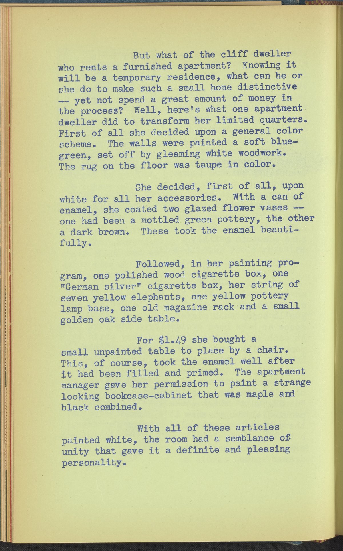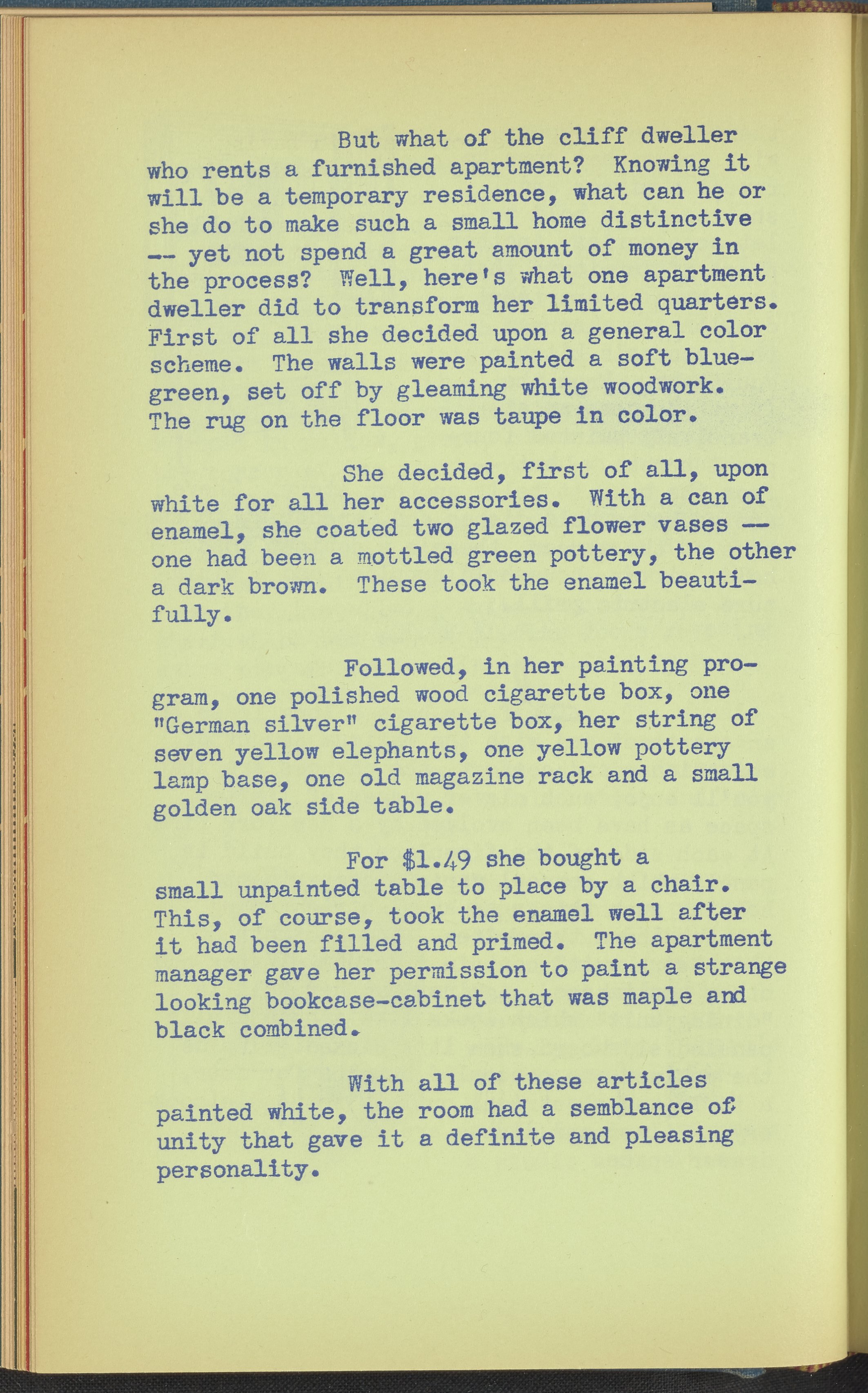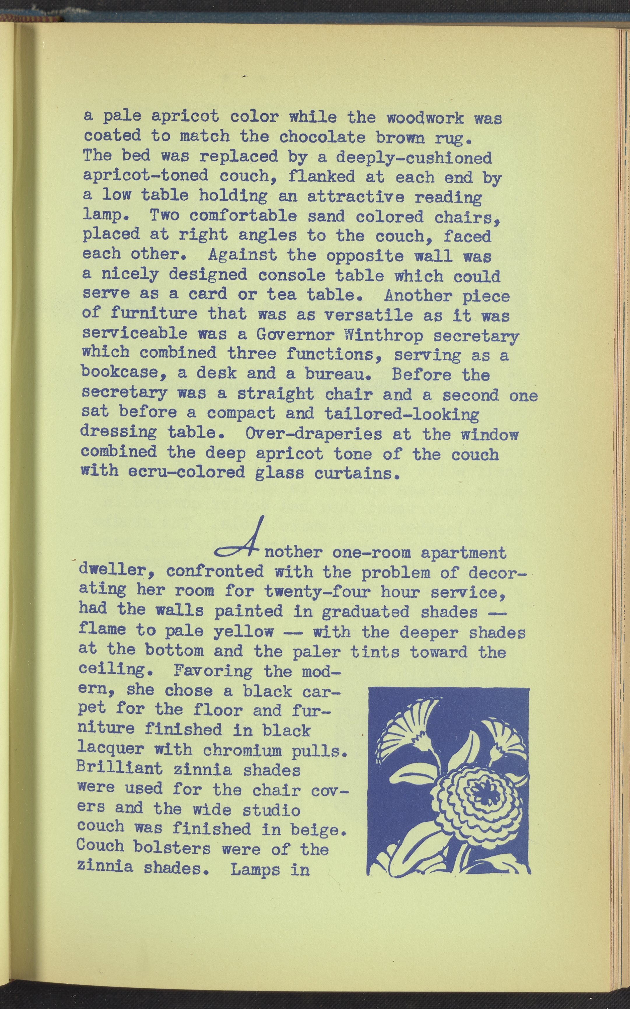 Booklet corresponding to a radio broadcast program created by the National Paint, Varnish, and Lacquer Association. The booklet discusses how to decorate and situate a single-room or small apartment to be multi-functional and efficient. Provides examples of small-space solutions to inspire home decoration. Includes small stylized illustrations throughout and decorated covers.