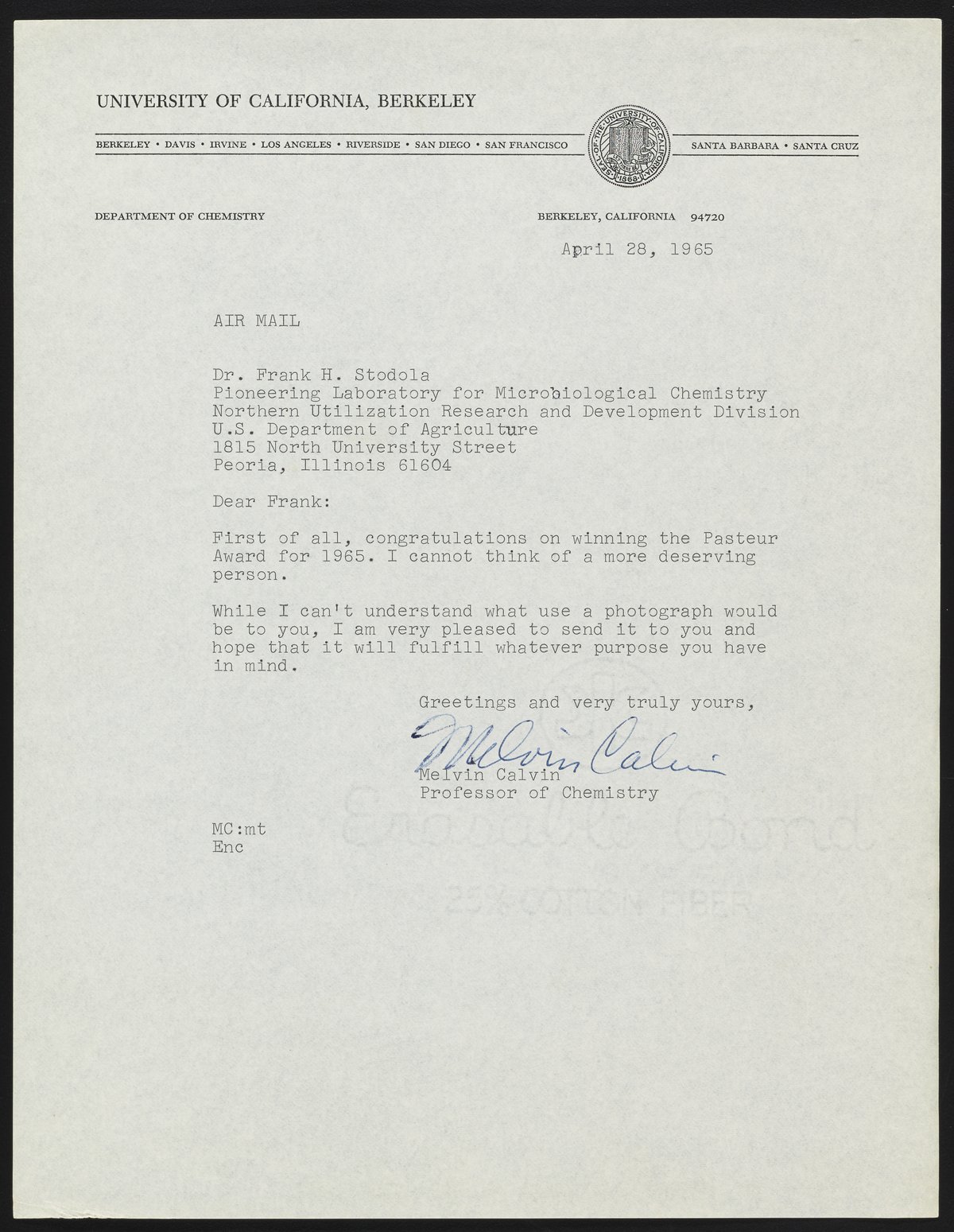 Calvin, Melvin. “Letter from Melvin Calvin to Frank Stodola,” April 28, 1965. Frank H. Stodola Nobel Laureate Letter Collection, Box 1. Science History Institute. Philadelphia. https://digital.sciencehistory.org/works/cz30ps70h.