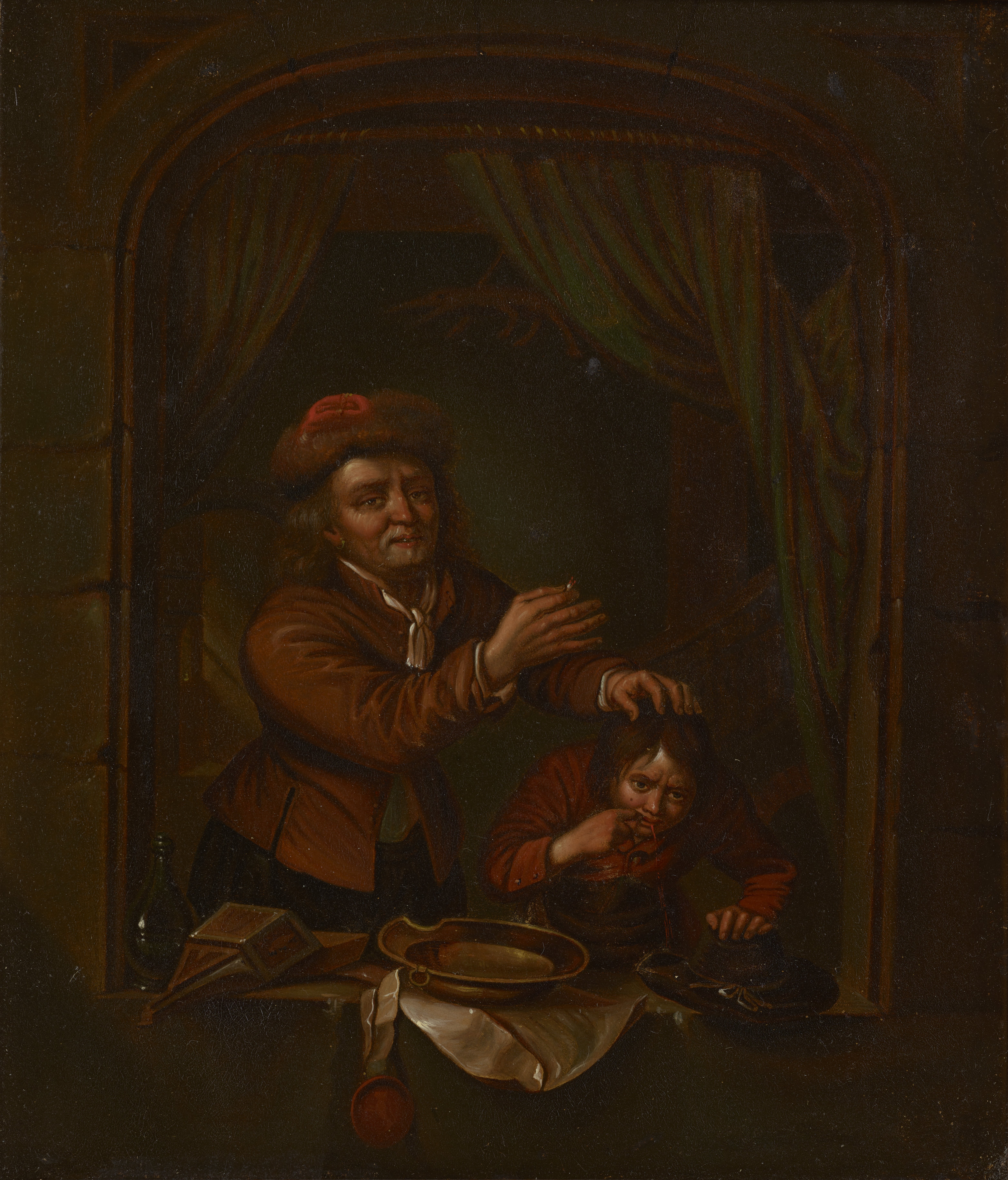 This small painting on metal is a copy of Gerrit Dou's (also known as Gerrit Douw or Dow) [artist unknown] popular dentist scene in Dresden. Through the illusionistic frame of a large window, we see a dentist in a red fur cap, proudly displaying the tooth he has just pulled from his patient. The patient, a young boy, grimaces in pain, holding onto his wide-brimmed hat. A copper basin, bottle, and other medical tools rest on the broad windowsill. Like the other paintings on metal in the collection, this one was probably created in the 19th century and was made by transferring a lithograph print onto a metal plate and then painting over top of the printed image in oils. These inexpensive copies were popular souvenirs at European tourist destinations.