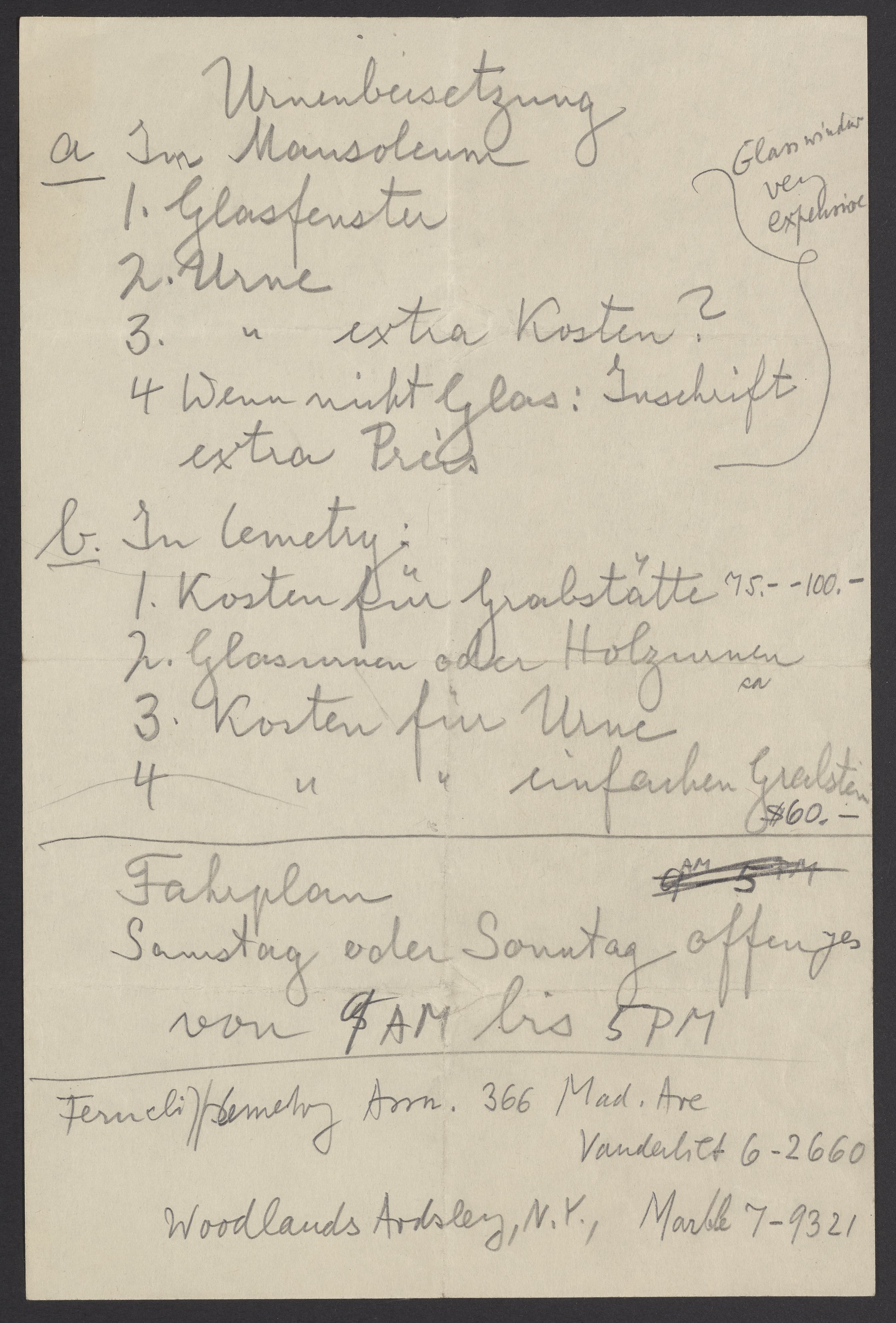 Note written by Max Albert Bredig (1902-1977) about burial plans for his late father, Georg Bredig (1868-1944). The note compares a mausoleum burial to a cemetery, and includes burial times, and addresses.