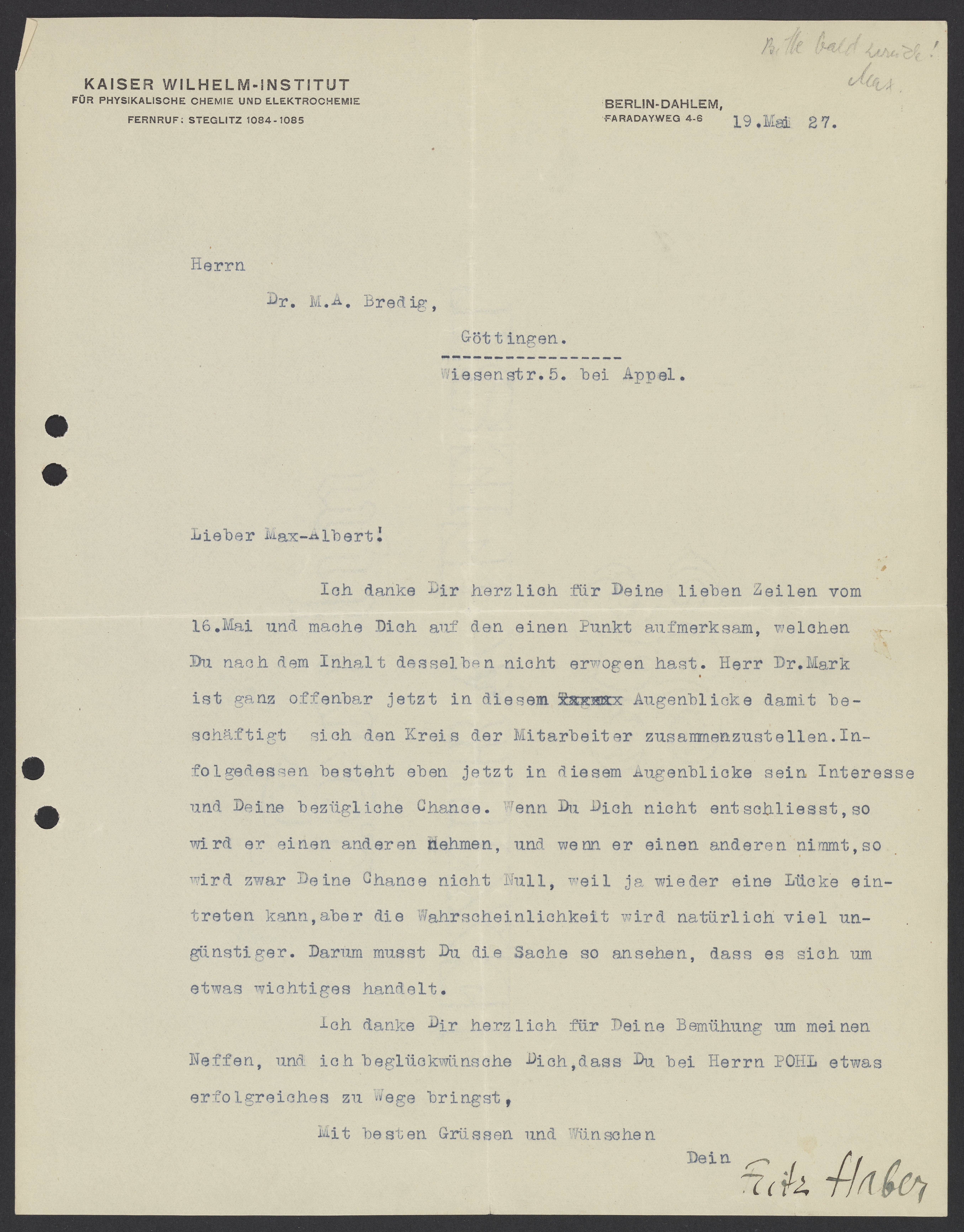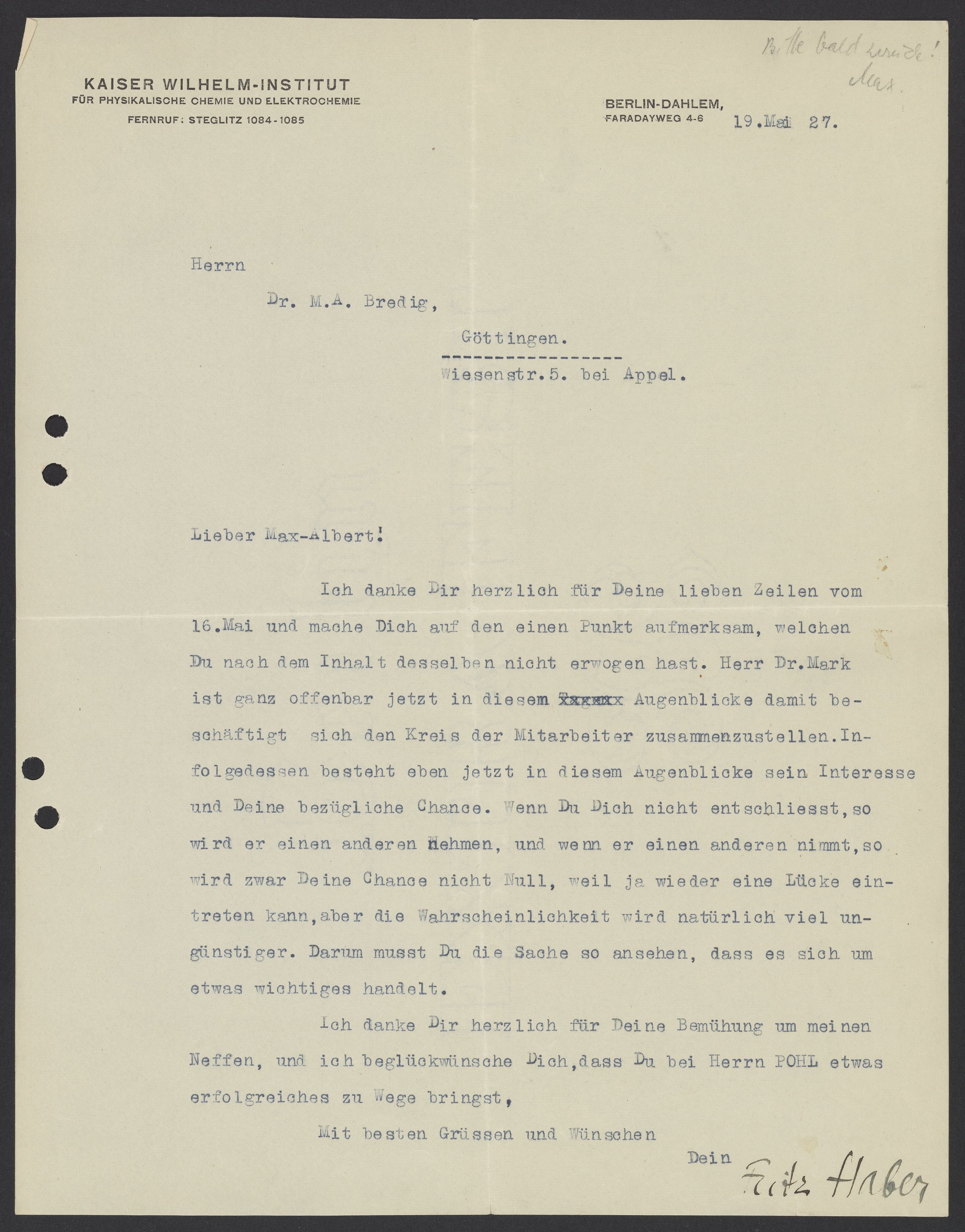 Letter from Fritz Haber to Max Bredig, May 19, 1927
