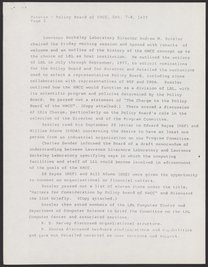 Small JPG1200 x 1535px — 260 KBLarge JPG2880 x 3685px — 1.4 MBFull-sized JPG5414 x 6927px — 4.9 MBOriginal fileTIFF — 5414 x 6927px — 107 MBMeeting minutes of the first meeting of the policy board of the National Resource for Computation in Chemistry (NRCC), held at the Lawrence Berkeley Laboratory on October 8, 1977. Included are outlines of the responsibilities of the policy board of the NRCC.
