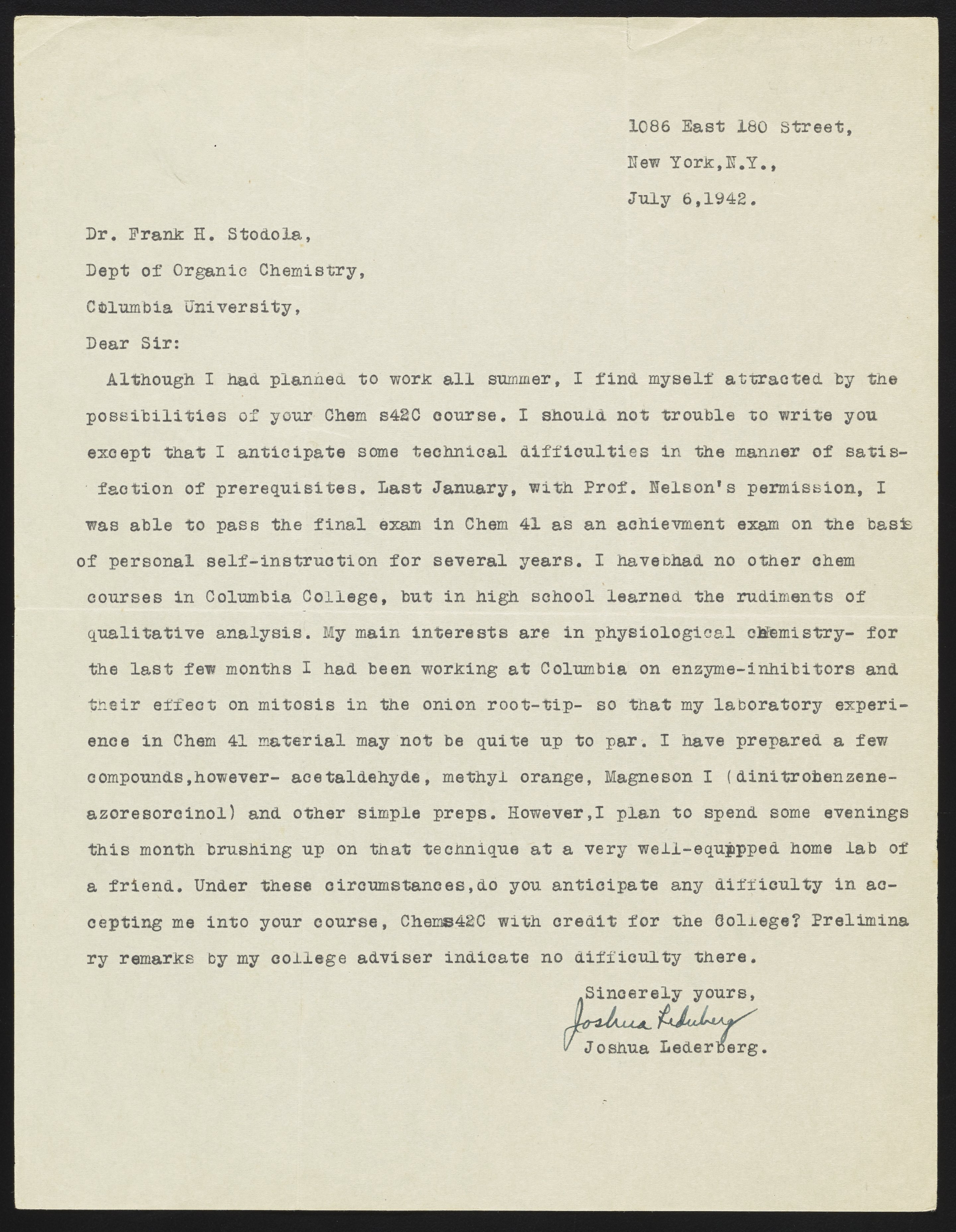 Written by Joshua Lederberg while 17 years old, seeking permission to take Stodola's Chem s42C course, despite not having taken the necessary prerequisites.