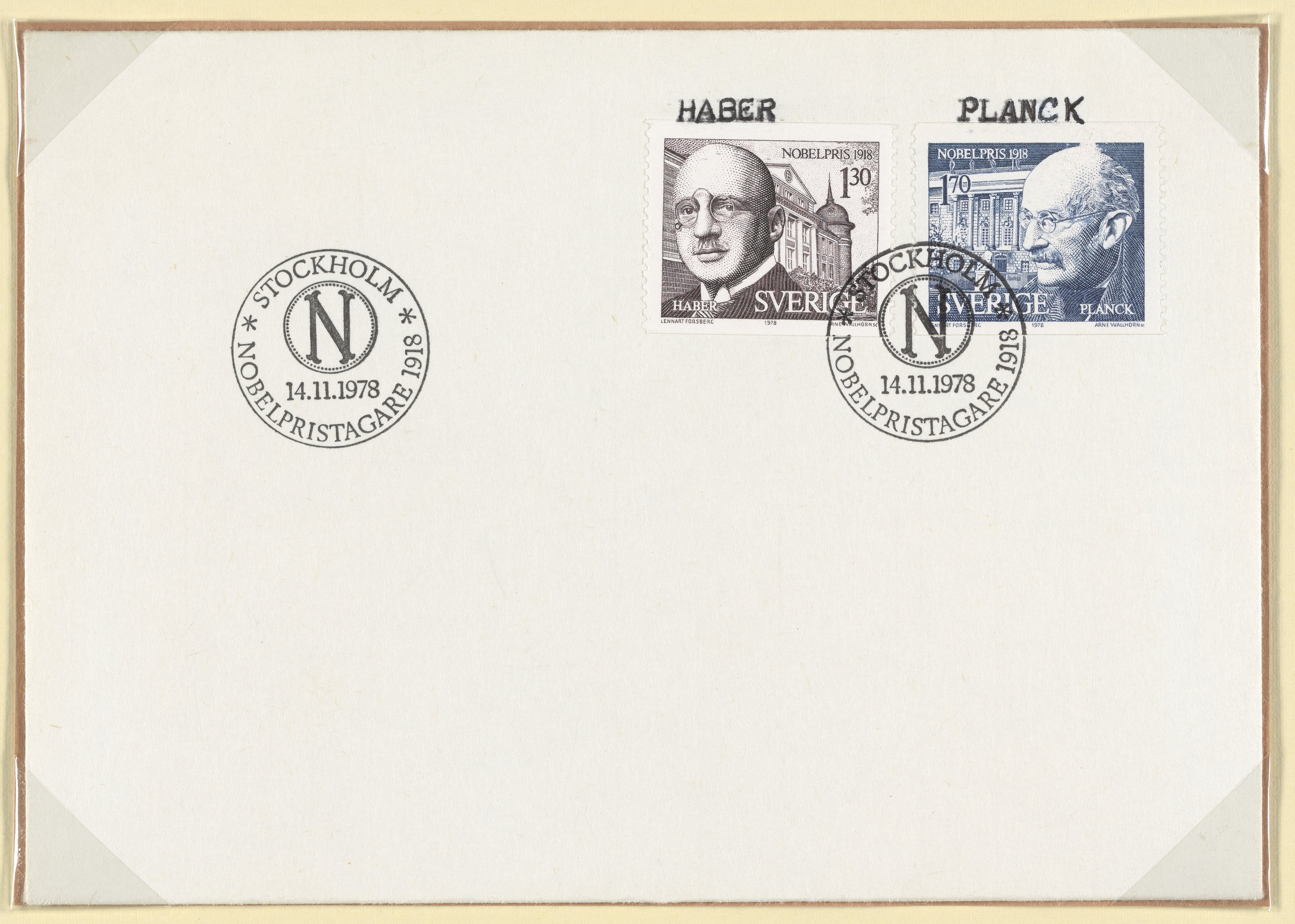 Forsberg, Lennart. “Envelope with Swedish Postage Stamps Commemorating Fritz Haber and Max Planck.” Sweden, 1978. Witco Stamp Collection, Box 3. Science History Institute. Philadelphia. https://digital.sciencehistory.org/works/d217qp681.