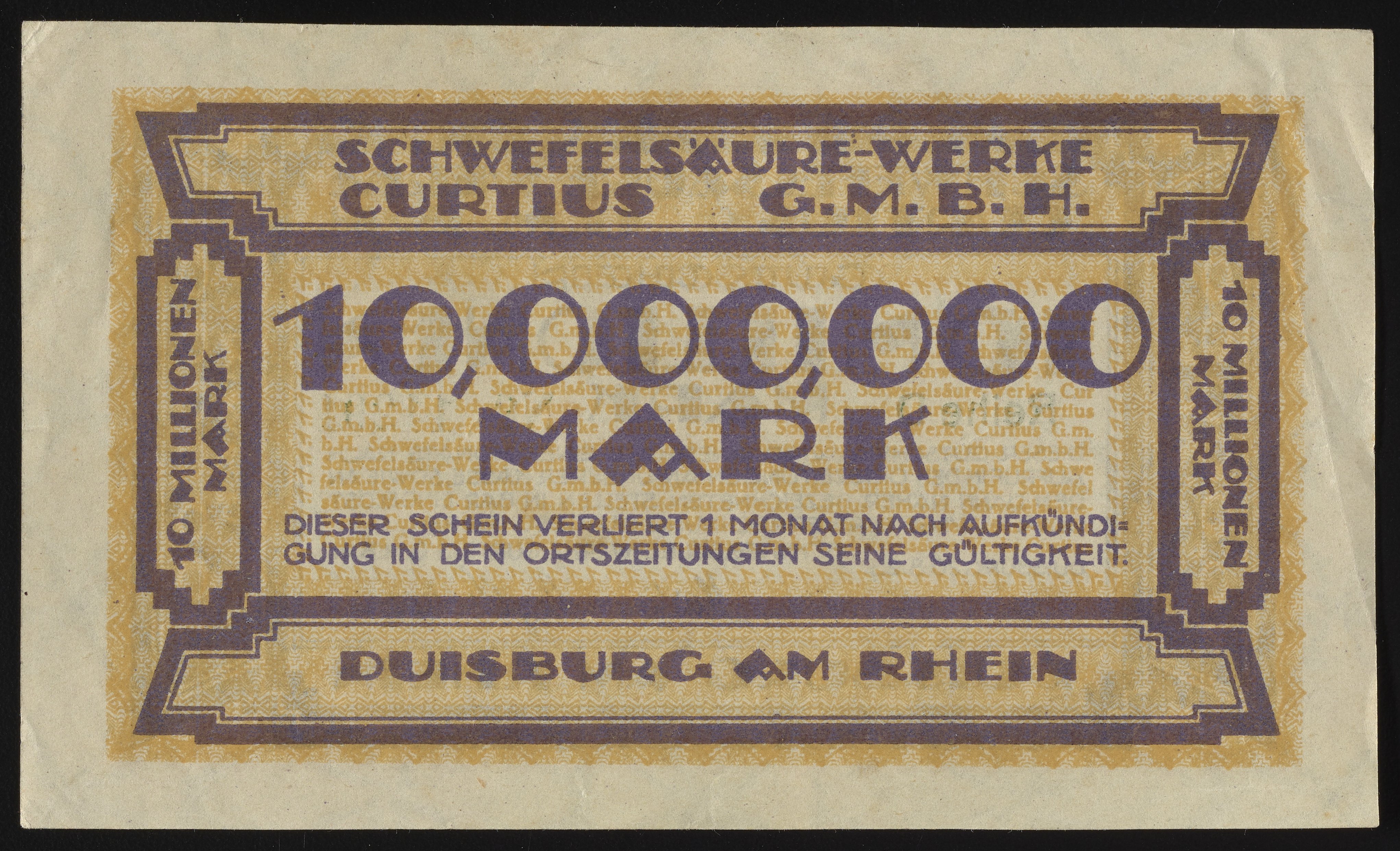 Small JPG1200 x 722px — 220 KBLarge JPG2880 x 1732px — 1.2 MBFull-sized JPG4095 x 2463px — 2.1 MBOriginal fileTIFF — 4095 x 2463px — 28.9 MBThis Ten Millionen Mark Gutschein, or ten million Mark voucher, was issued by Schwefelsäure-Werke Curtius GmbH, or Curtius Sulfuric Acid Works GmbH. Paper features a watermark design.