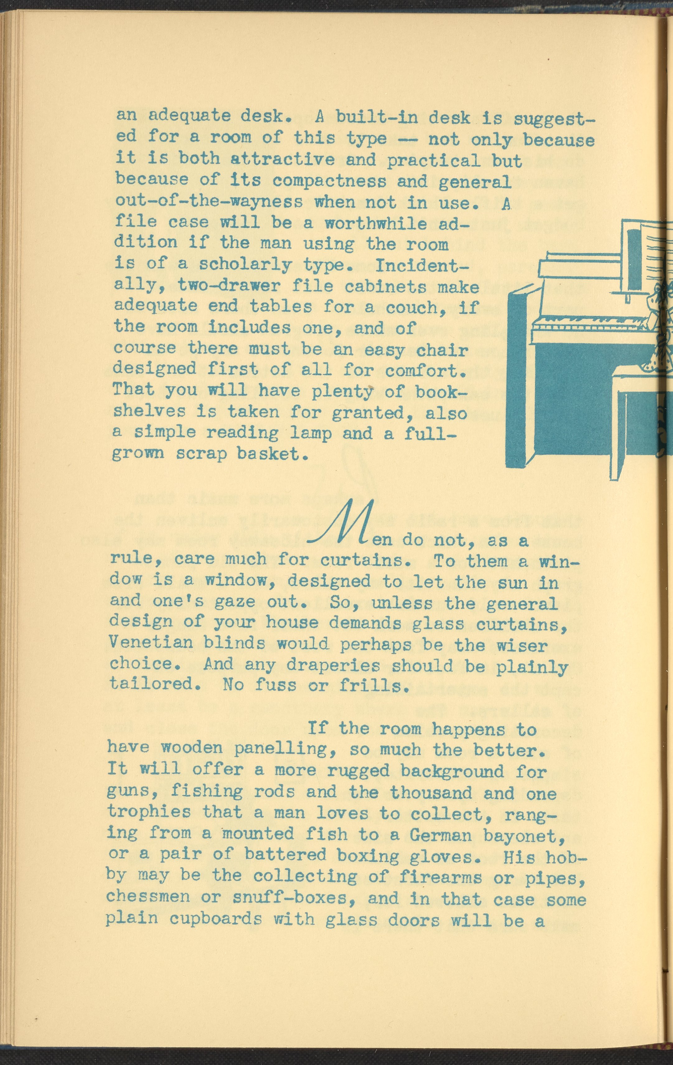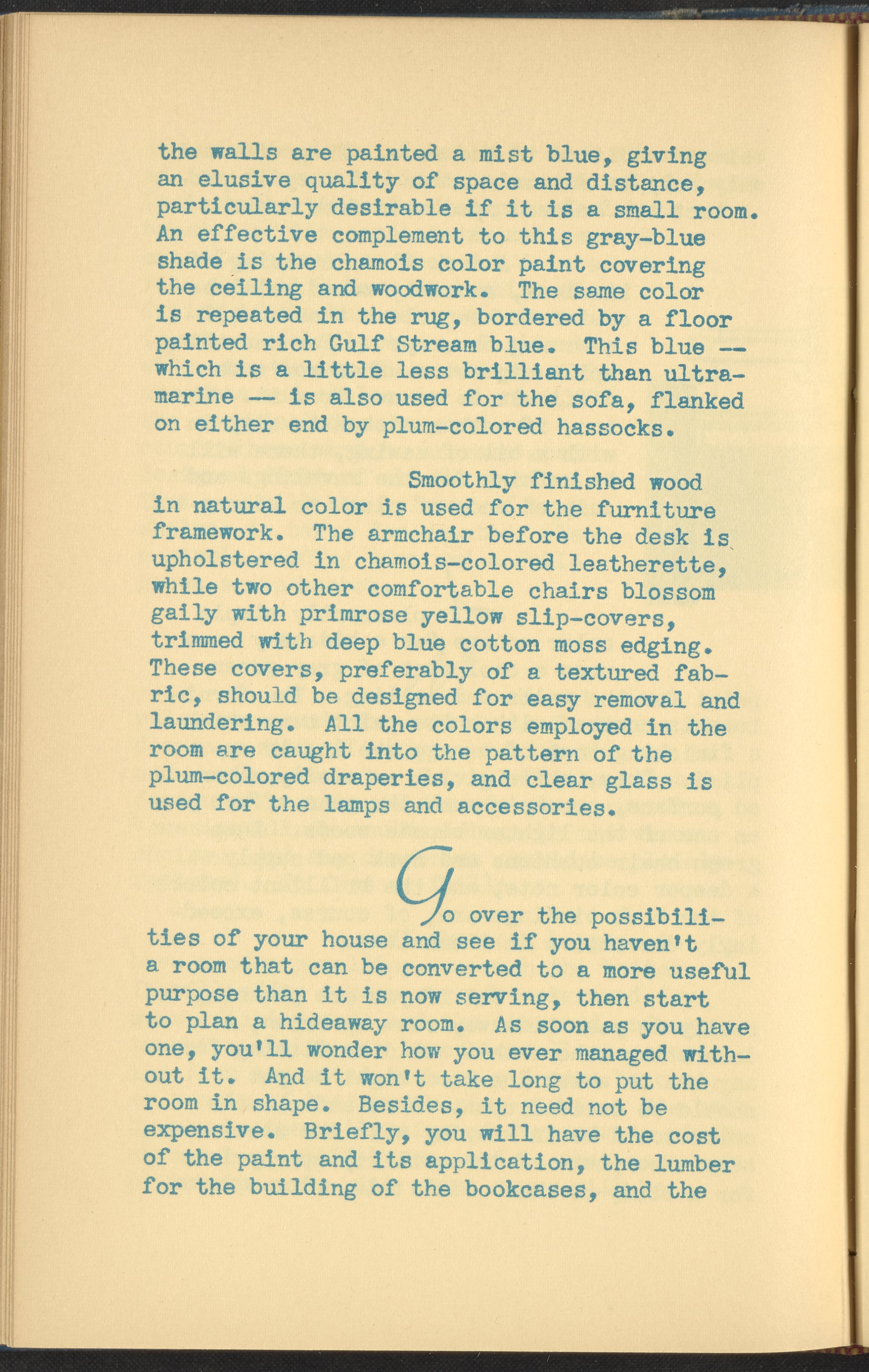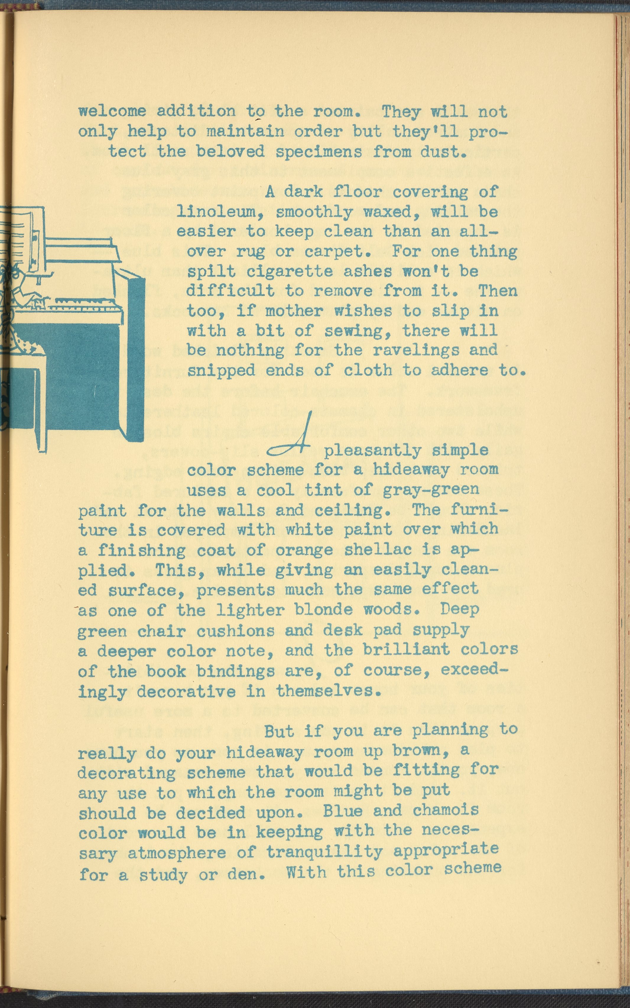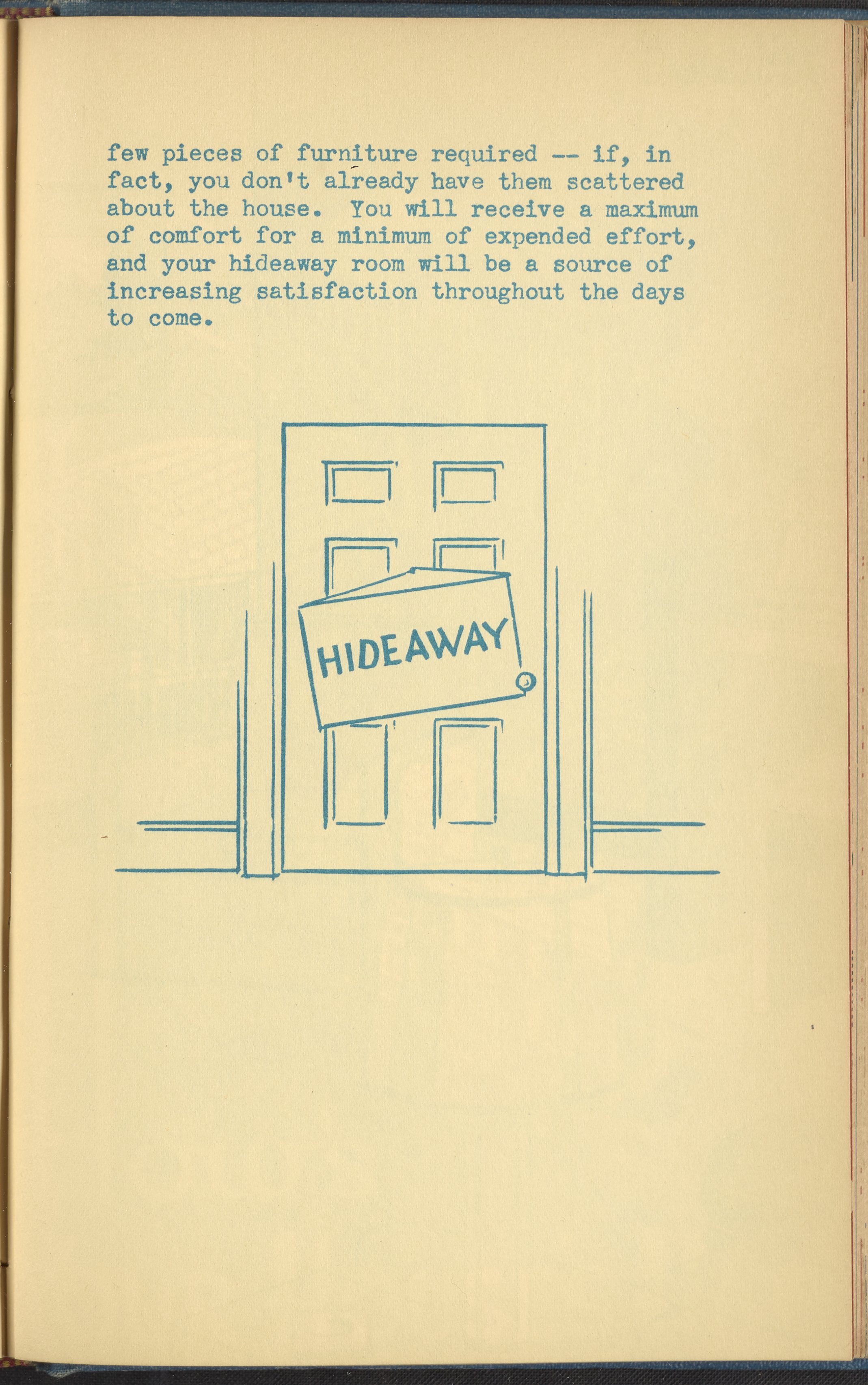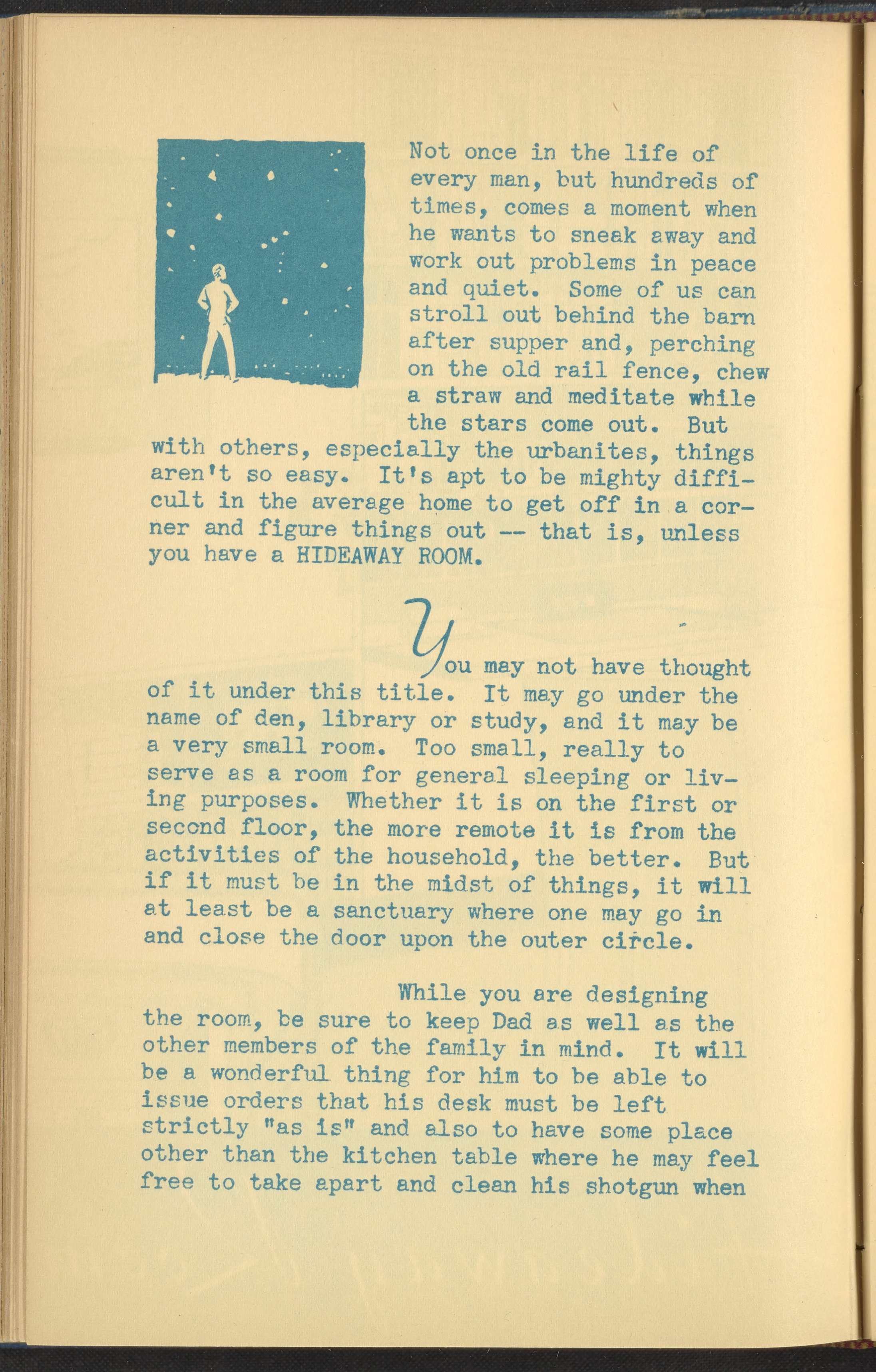 Booklet corresponding to a radio broadcast program created by the National Paint, Varnish, and Lacquer Association. The booklet begins by introducing the concept of a "hideaway room," or a space in one's home for independent focus and separation from the rest of the household. Provides inspiration for decorating a hideaway room, emphasizing qualities determined to be masculine. Includes small stylized illustrations throughout and decorated covers.