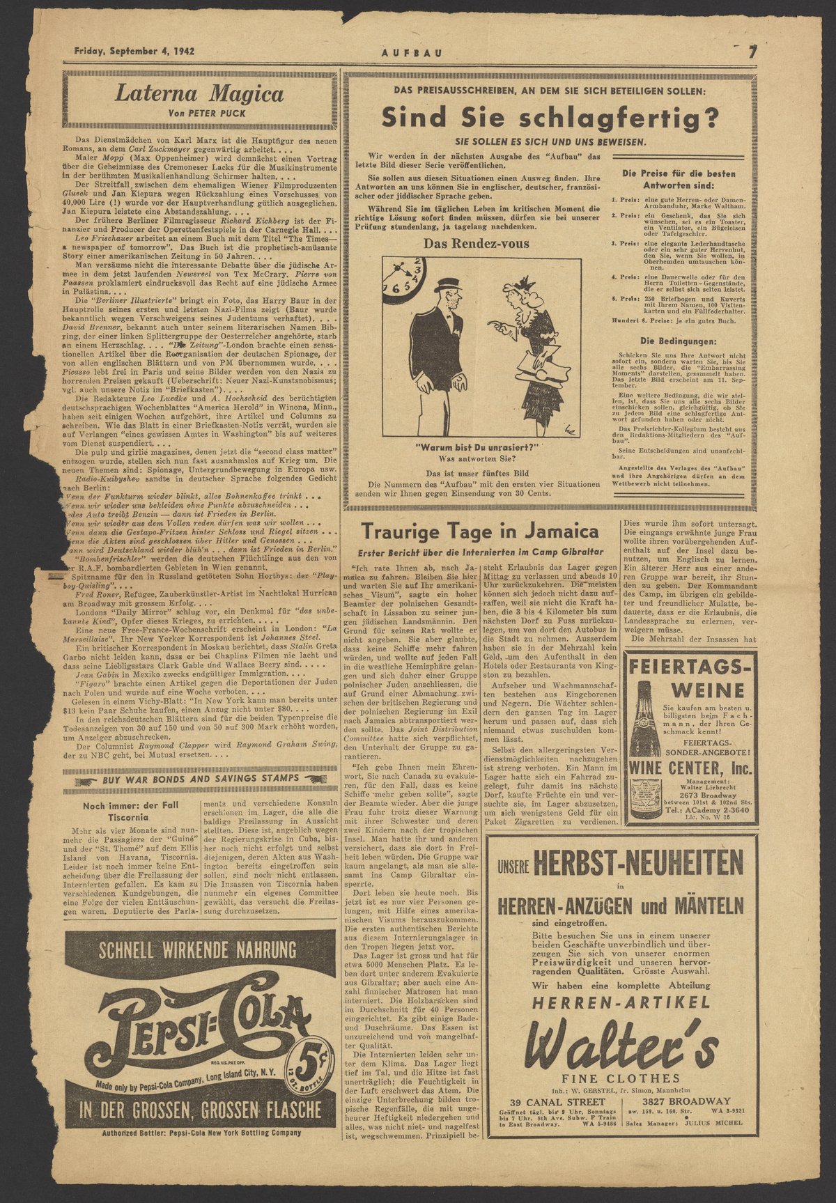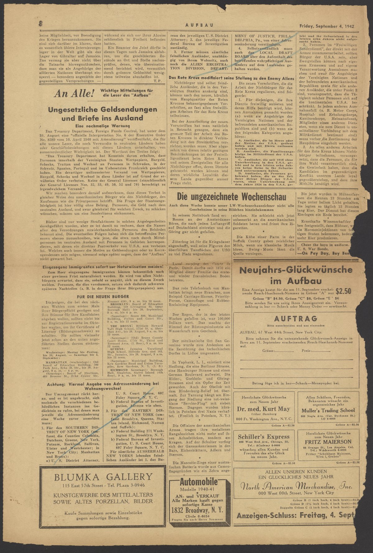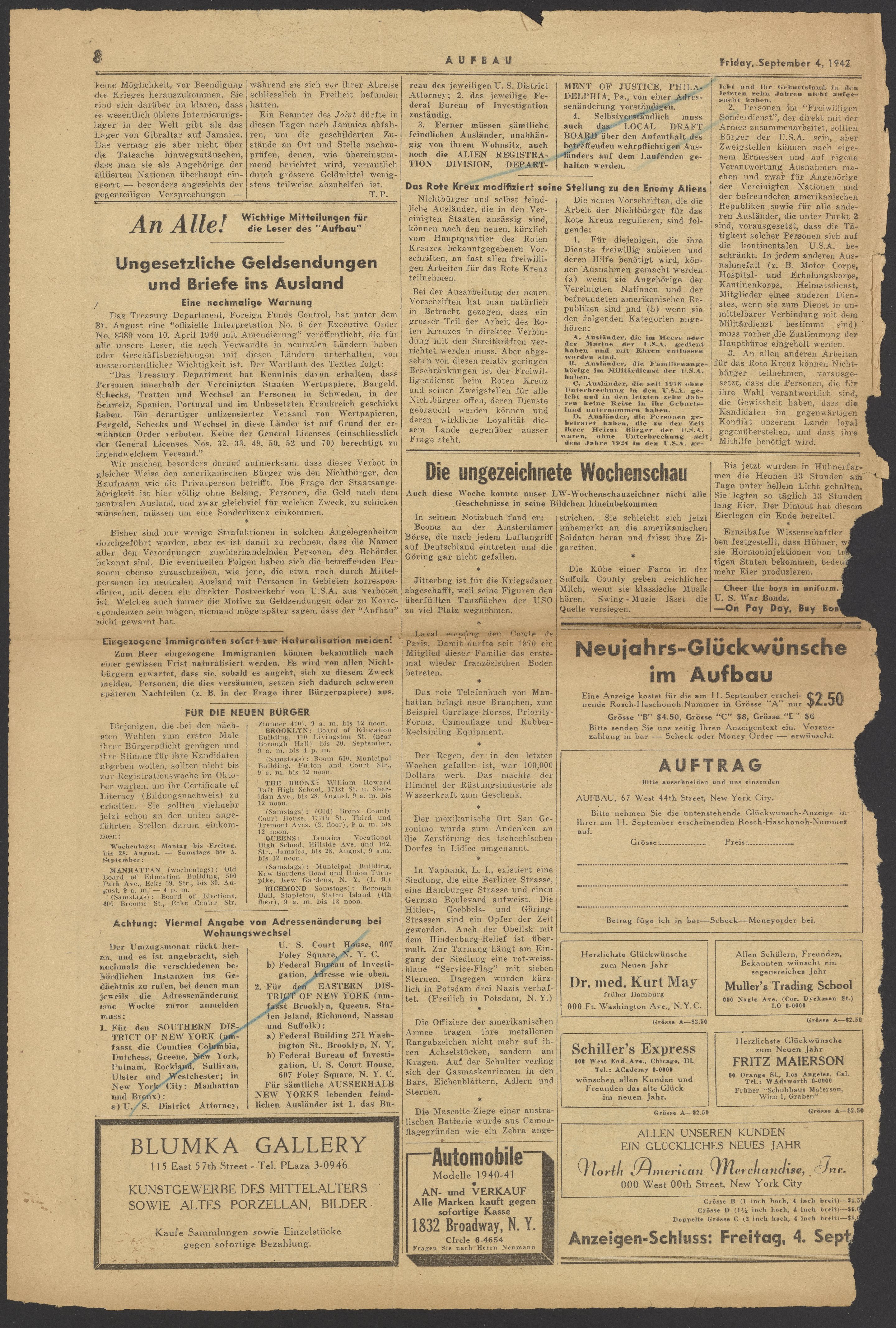 An Alle! Wichtige Mitteilungen für dieLeser des "Aufbau"