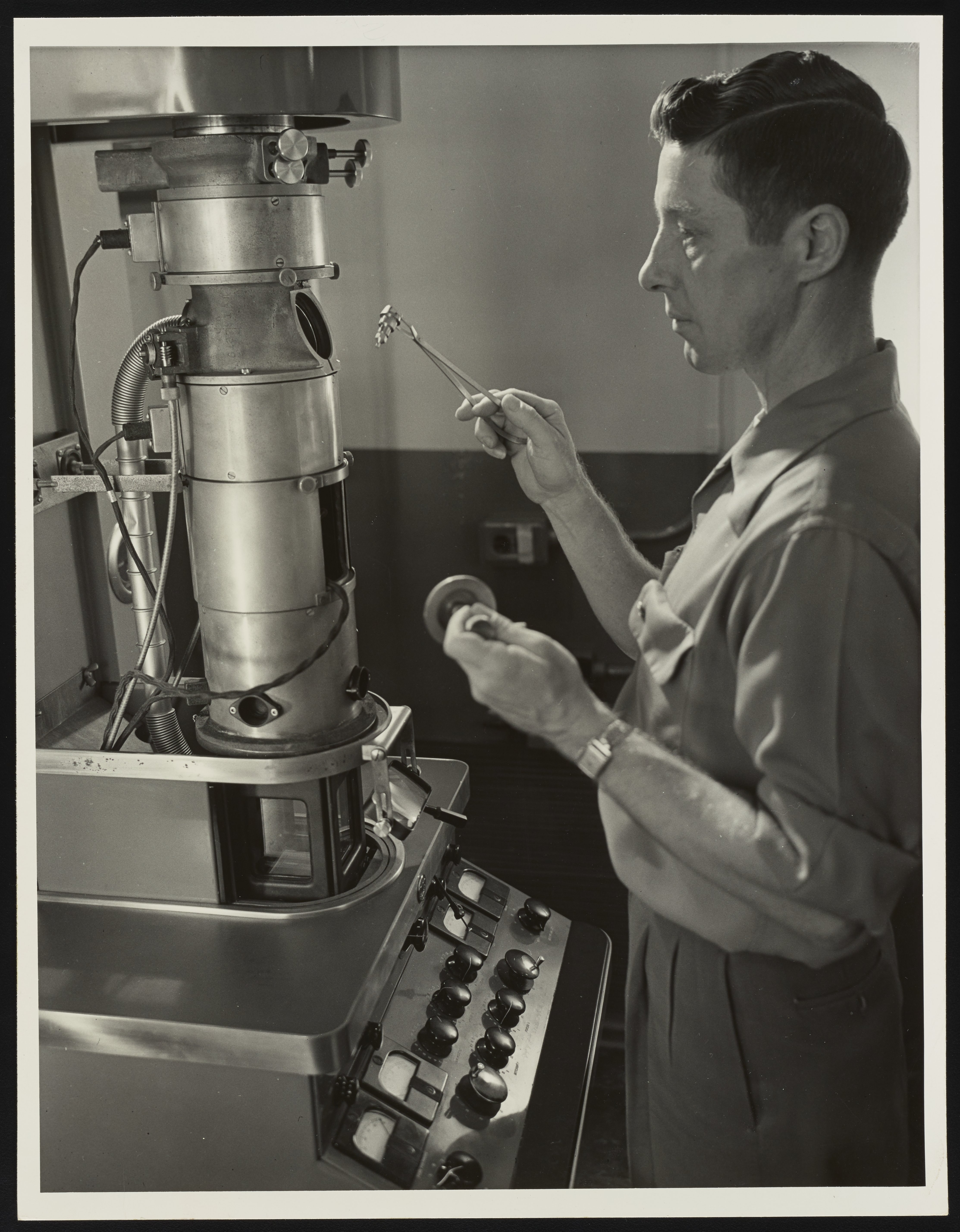 Clyde Moe operating RCA Model EMU electron microscope in Dow Chemical Company laboratory