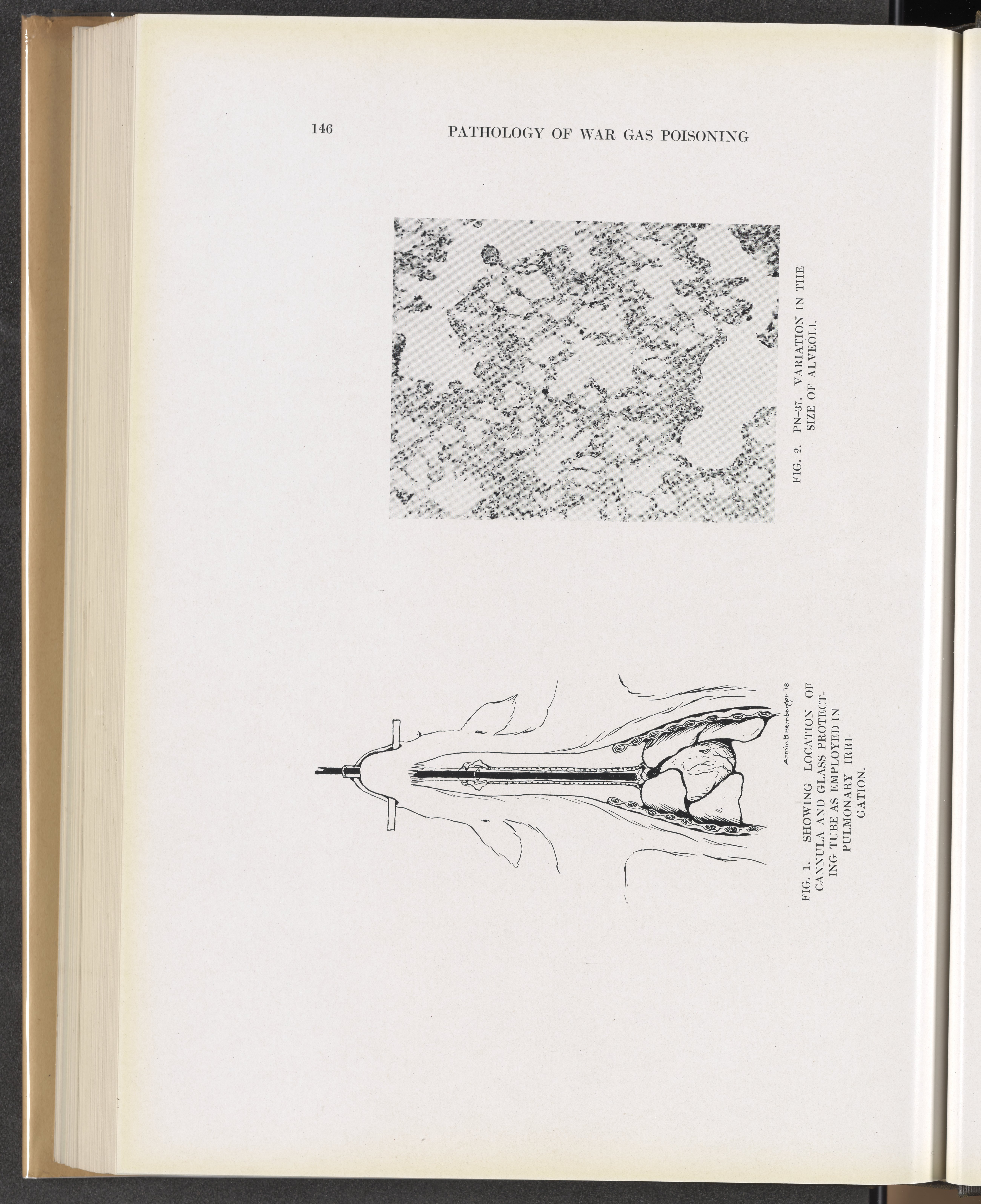 Fig. 1: Showing location of cannula and glass protecting tube as employed in pulmonary irrigation. Fig. 2: Variation in size of alveoli