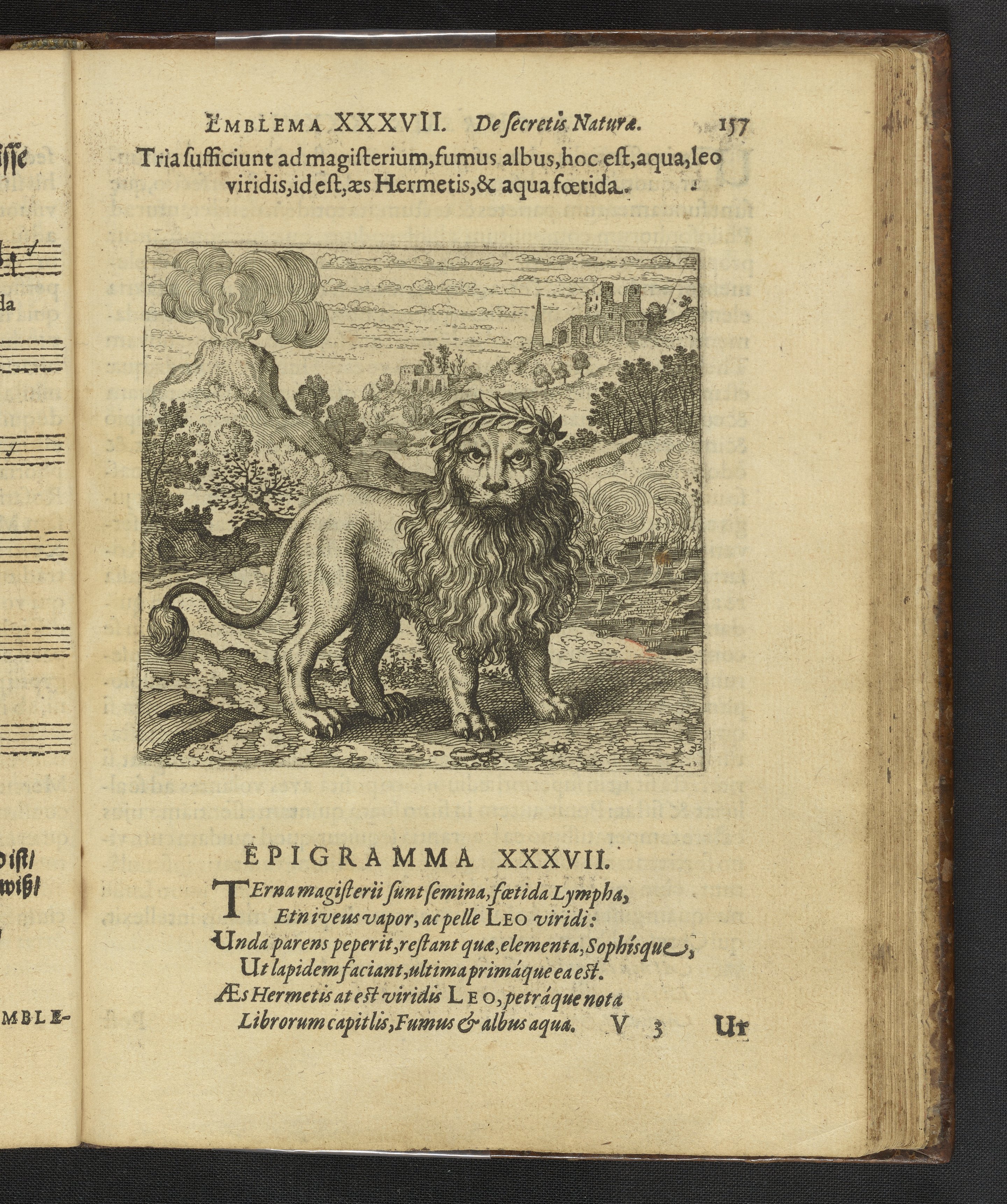 Emblema XXXVII. Tria sufficiunt ad magisterium, fumus albus, hoc est, aqua, leo viridis, id est, æs Hermetis, & aqua fœtida.