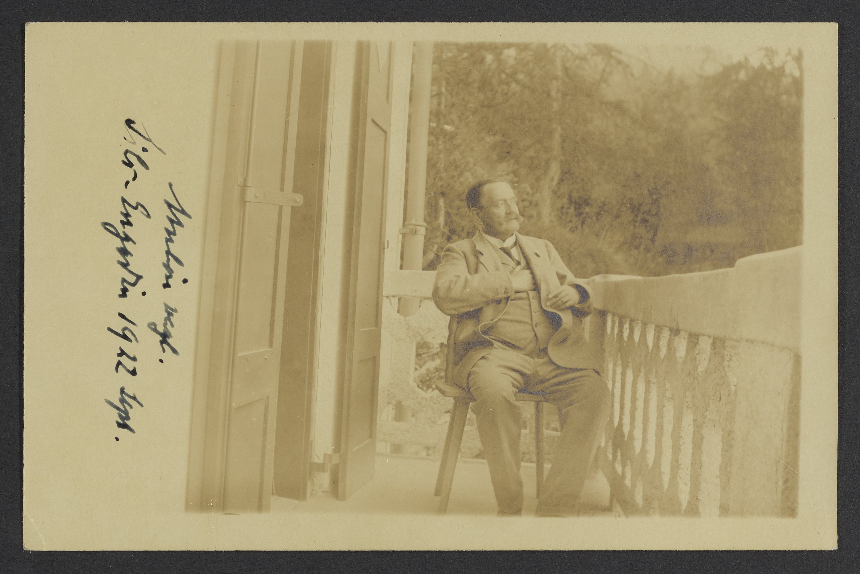 Postcard featuring a sepia-toned photograph of a man, possibly Theodor Curtius (1857-1928), sitting outside.