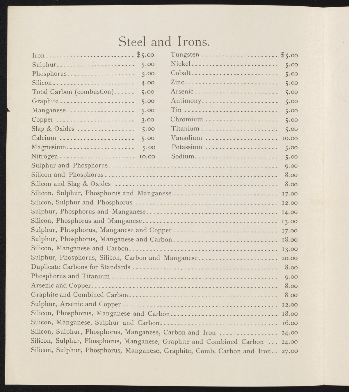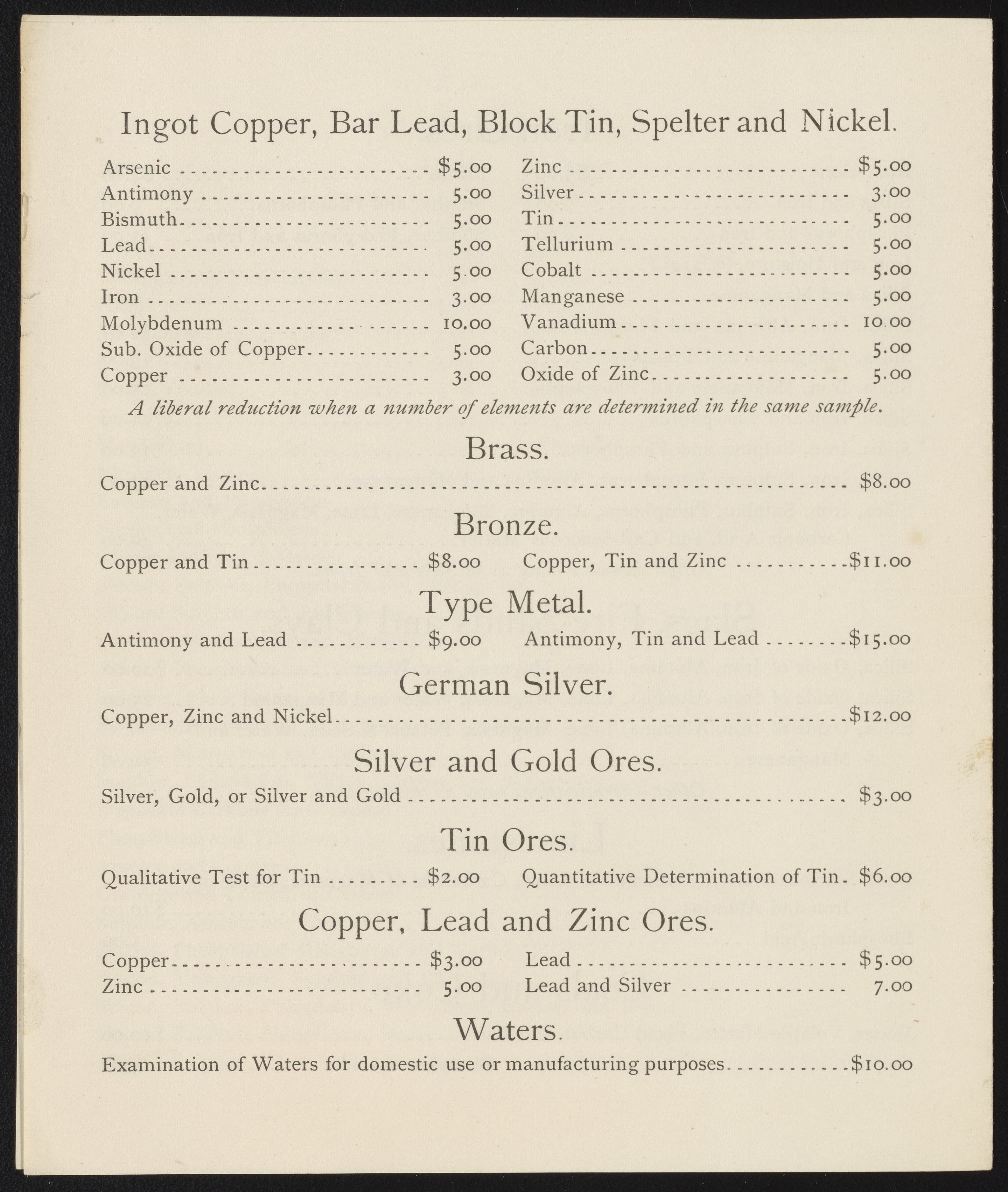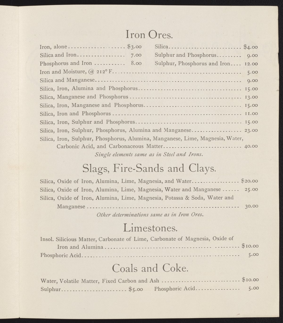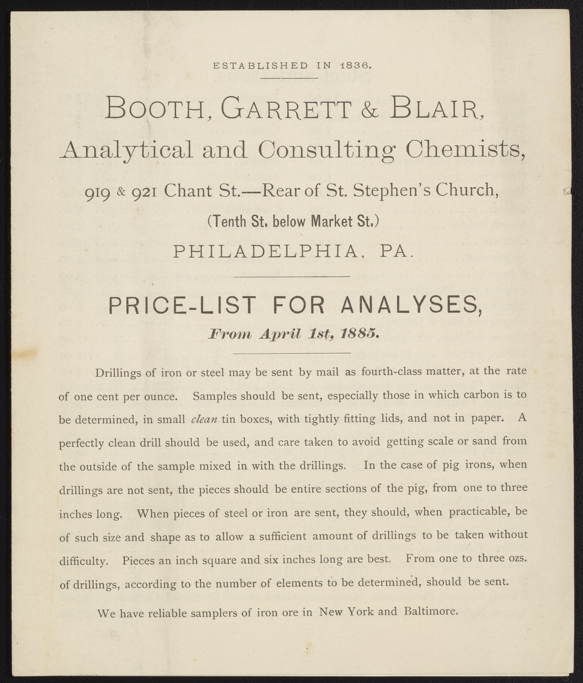 Booth, Garrett & Blair, Analytical and Consulting Chemists Price List