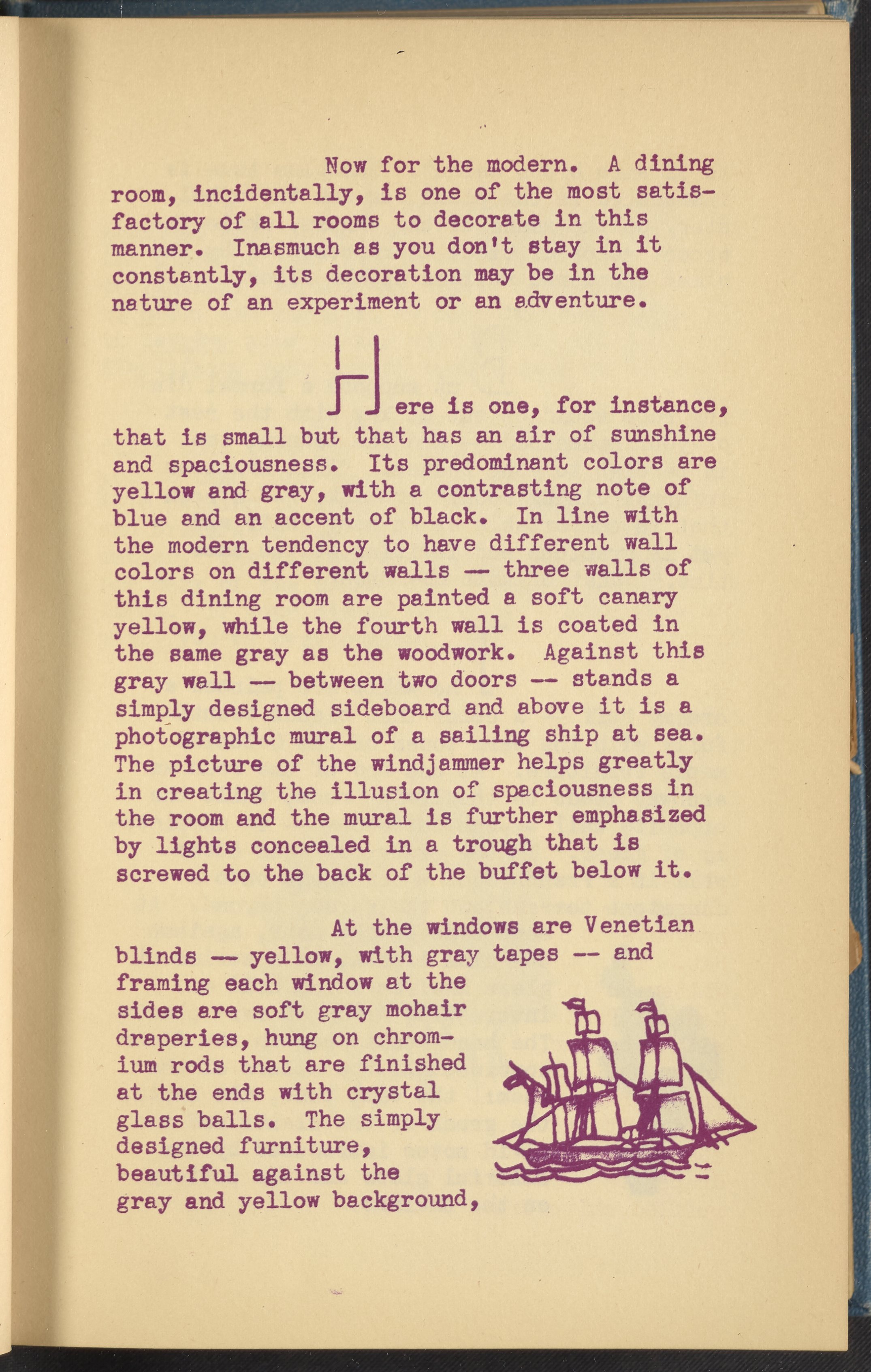 Booklet corresponding to a radio broadcast program created by the National Paint, Varnish, and Lacquer Association. The booklet discusses how an attractively decorated dining room not only aids in digestion but also deepens the love in a home by making mealtimes pleasant. Provides tips for decorating a dining room and describes the defining features of several differently styled dining rooms for inspiration. Includes small stylized illustrations throughout and decorated covers.